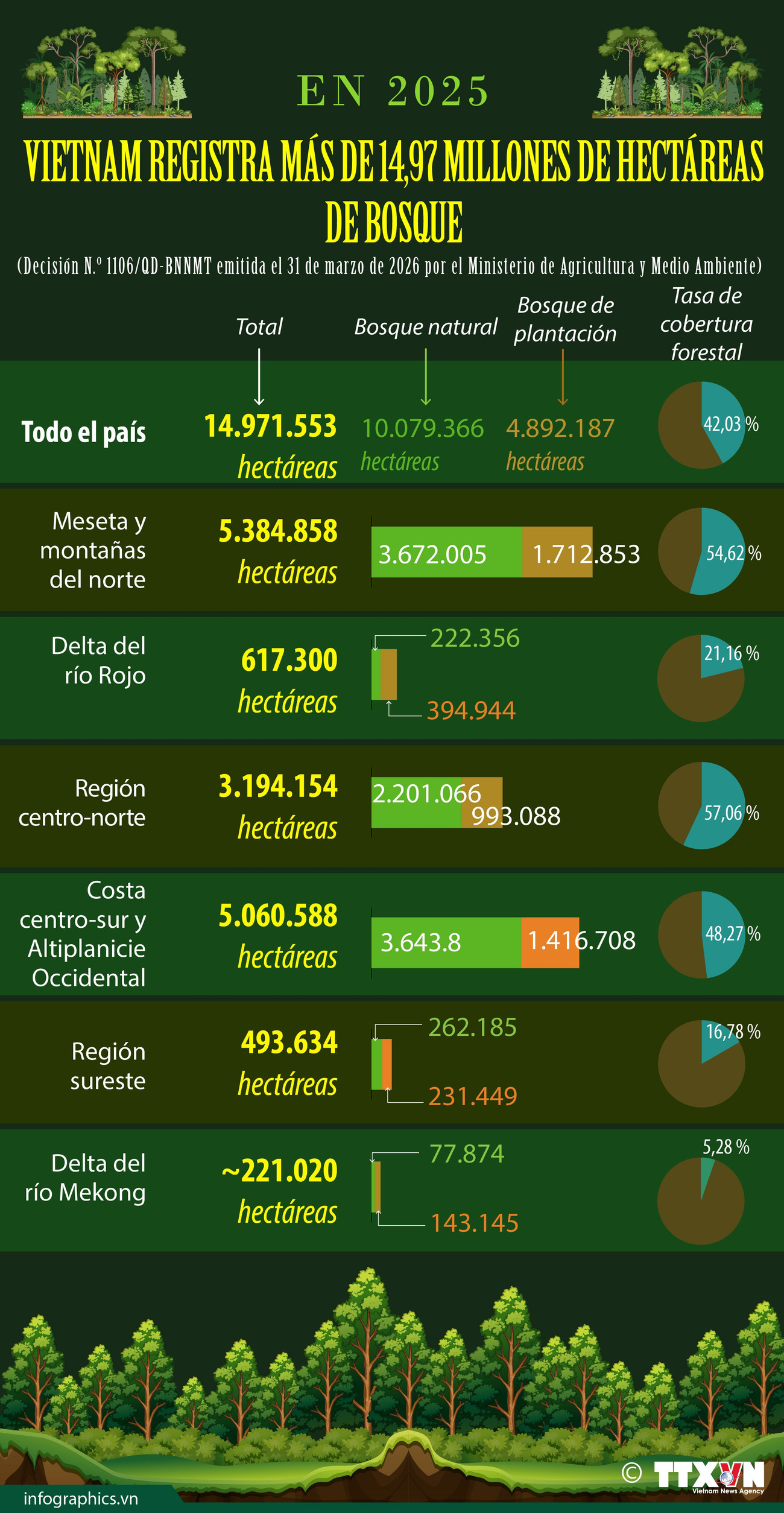De acuerdo con la Decisión N.º 1106/QD-BNNMT, emitida el 31 de marzo de 2026 por el Ministerio de Agricultura y Medio Ambiente, que dio a conocer el estado de los bosques nacionales en 2025, la superficie forestal total de Vietnam —incluidas áreas que no cumplen plenamente los criterios de cobertura— asciende a más de 14,97 millones hectáreas. Del total, más de 10 millones hectáreas corresponden a bosques naturales y cerca de 4,9 millones a bosques plantados, lo que sitúa la tasa de cobertura forestal del país en el 42,03%.