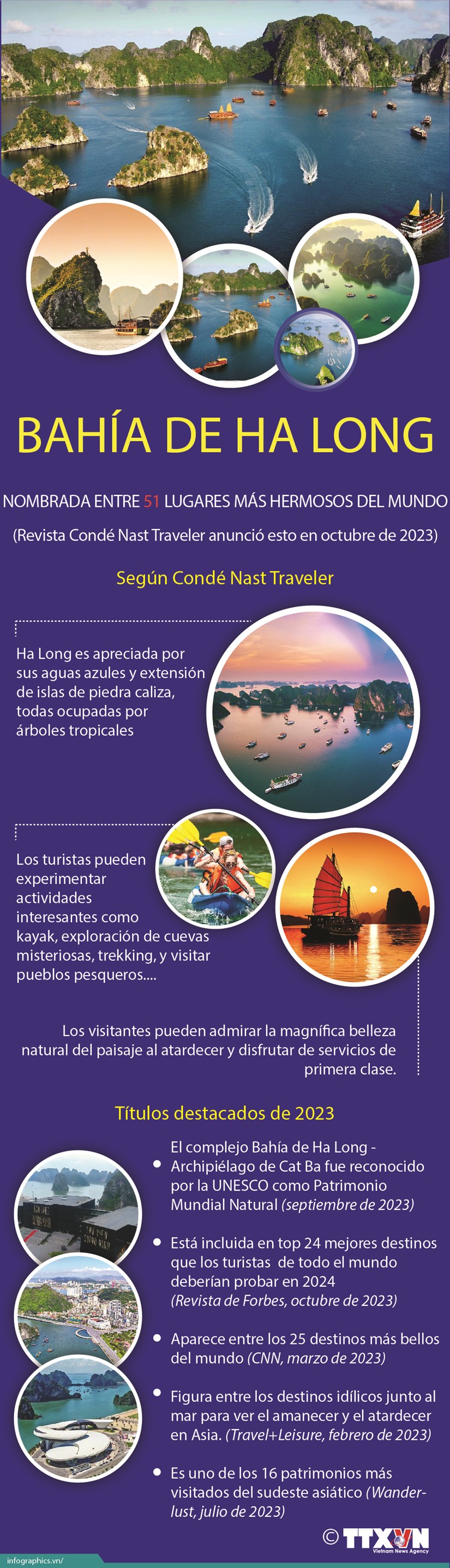La bahía de Ha Long en Vietnam se encuentra entre los 51 destinos más hermosos del mundo, según la clasificación de Condé Nast Traveler, revista internacional especializada en turismo de lujo y estilo de vida.