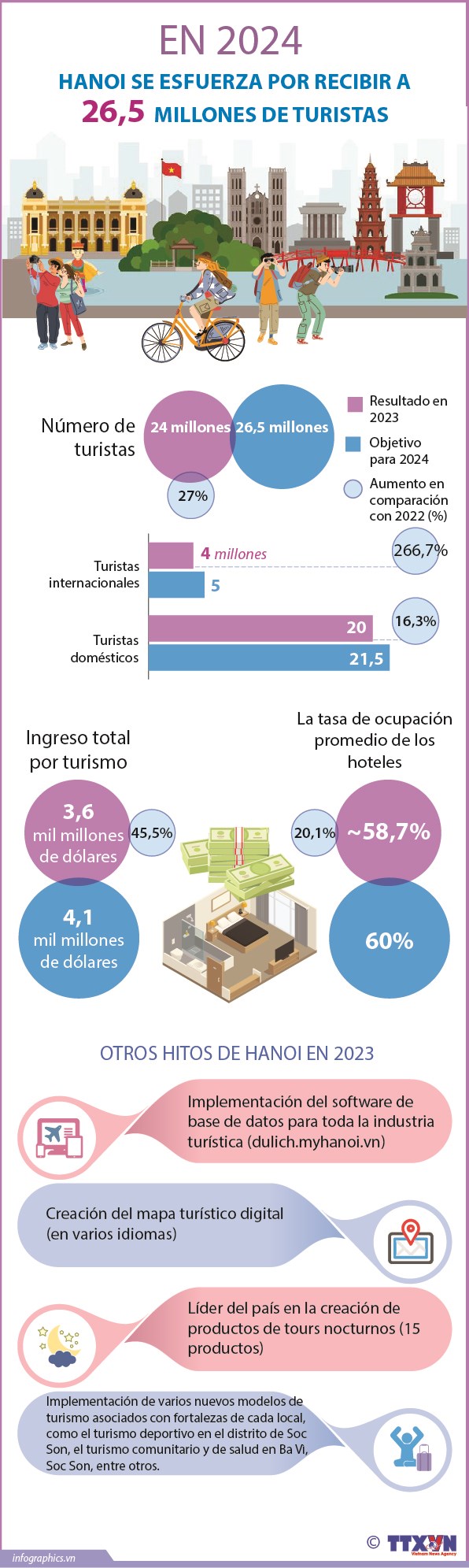 En 2023, el número de turistas en Hanoi totalizó 24 millones de personas, un aumento anual del 27%. La capital de Vietnam se fija el objetivo de recibir 26,5 millones de visitantes en 2024.