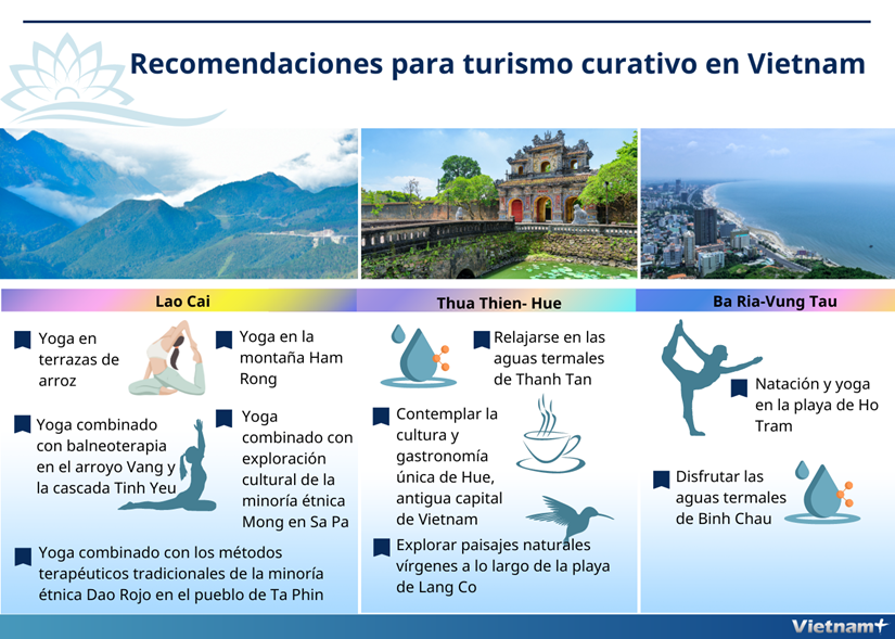 Según el Instituto de Investigación y Desarrollo del Turismo, dependiente de la Administración Nacional de Turismo de Vietnam, el país indochino cuenta con potenciales para desarrollar el turismo curativo. Actualmente, diversas localidades han aprovechado sus fortalezas para elaborar productos propios al respecto.