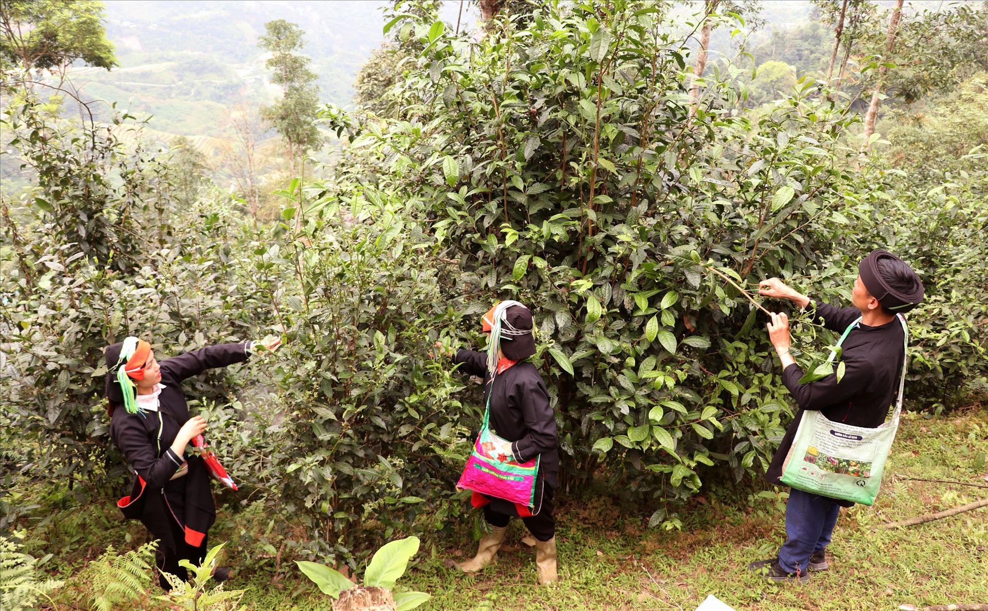 Men theo con đường ngoằn ngoèo vào thôn Lùng Đoóc (xã biên giới Thanh Thủy), trên triền núi cao, rừng chè Shan tuyết cổ thụ hàng trăm năm tuổi hiện ra giữa đại ngàn. Trên những thân cây phủ rêu phong, những người đàn ông, phụ nữ Dao trong trang phục truyền thống miệt mài hái từng búp chè non.