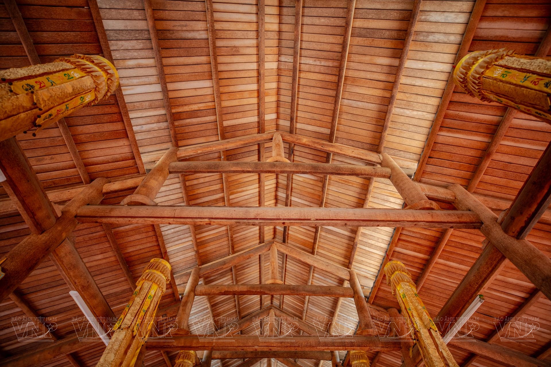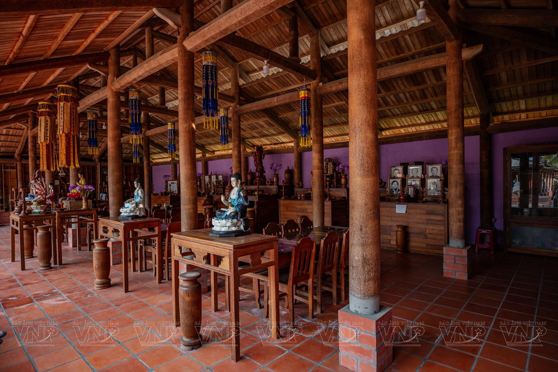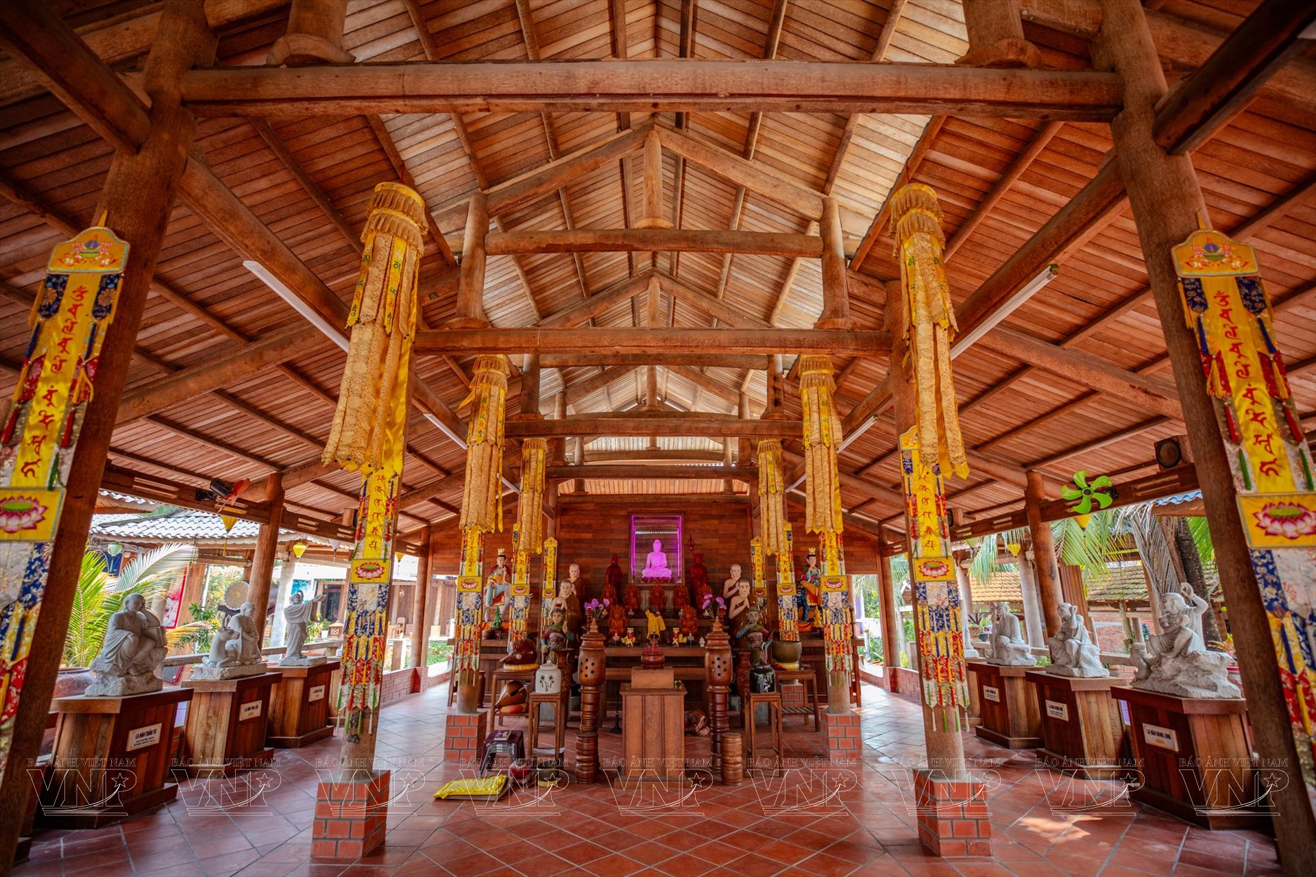 Ở “thủ phủ dừa” Bến Tre - nay là một phần của tỉnh Vĩnh Long sau sắp xếp đơn vị hành chính - cây dừa từ lâu đã hiện diện trong mọi mặt đời sống, từ sản xuất, sinh hoạt đến ẩm thực và văn hóa. Dừa không chỉ là cây kinh tế chủ lực mà còn trở thành biểu tượng của vùng đất. Việc đưa chất liệu dừa vào kiến trúc chùa chiền vì thế không chỉ là một lựa chọn vật liệu, mà còn là cách kể câu chuyện về bản sắc địa phương bằng hình khối, không gian và chất liệu.