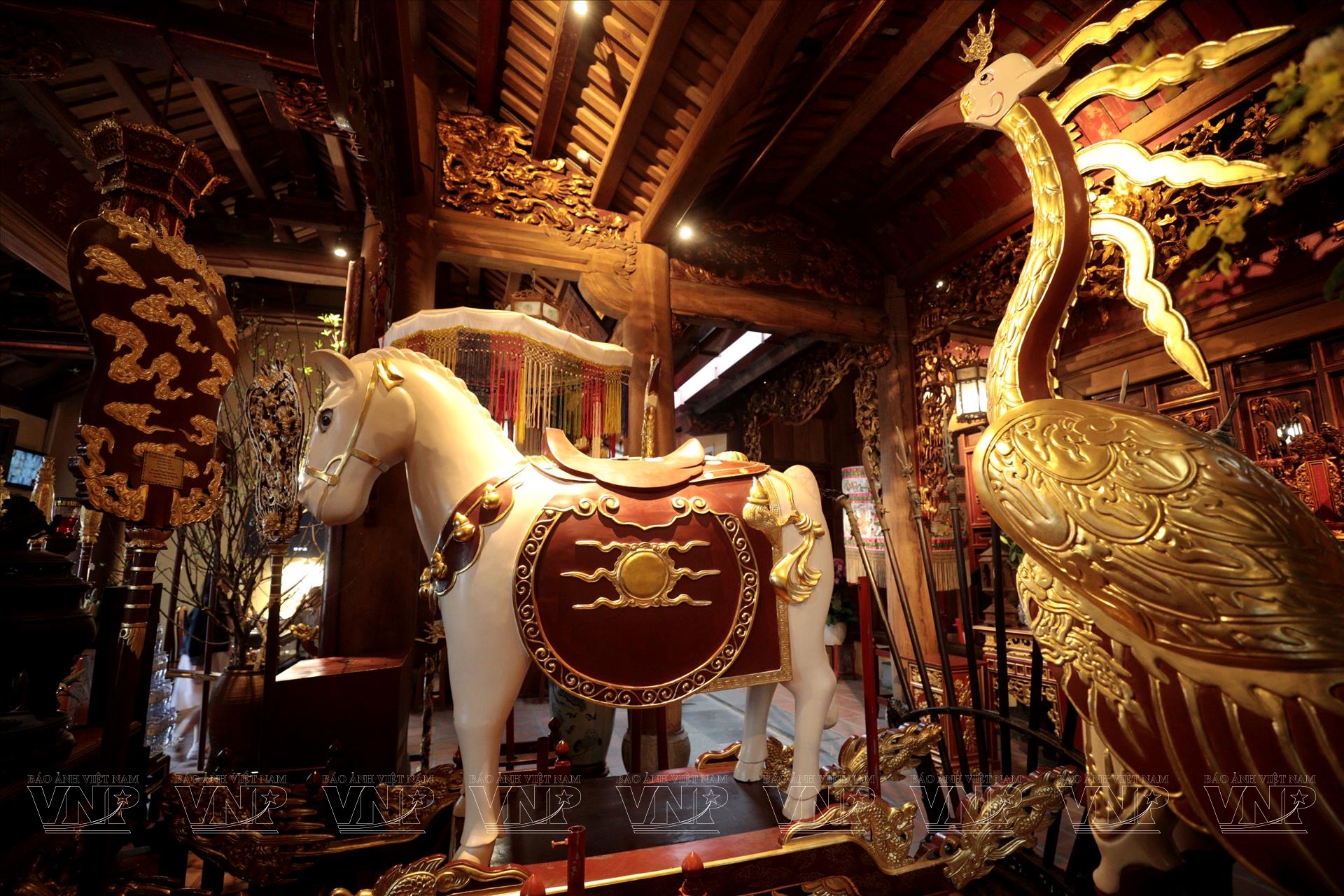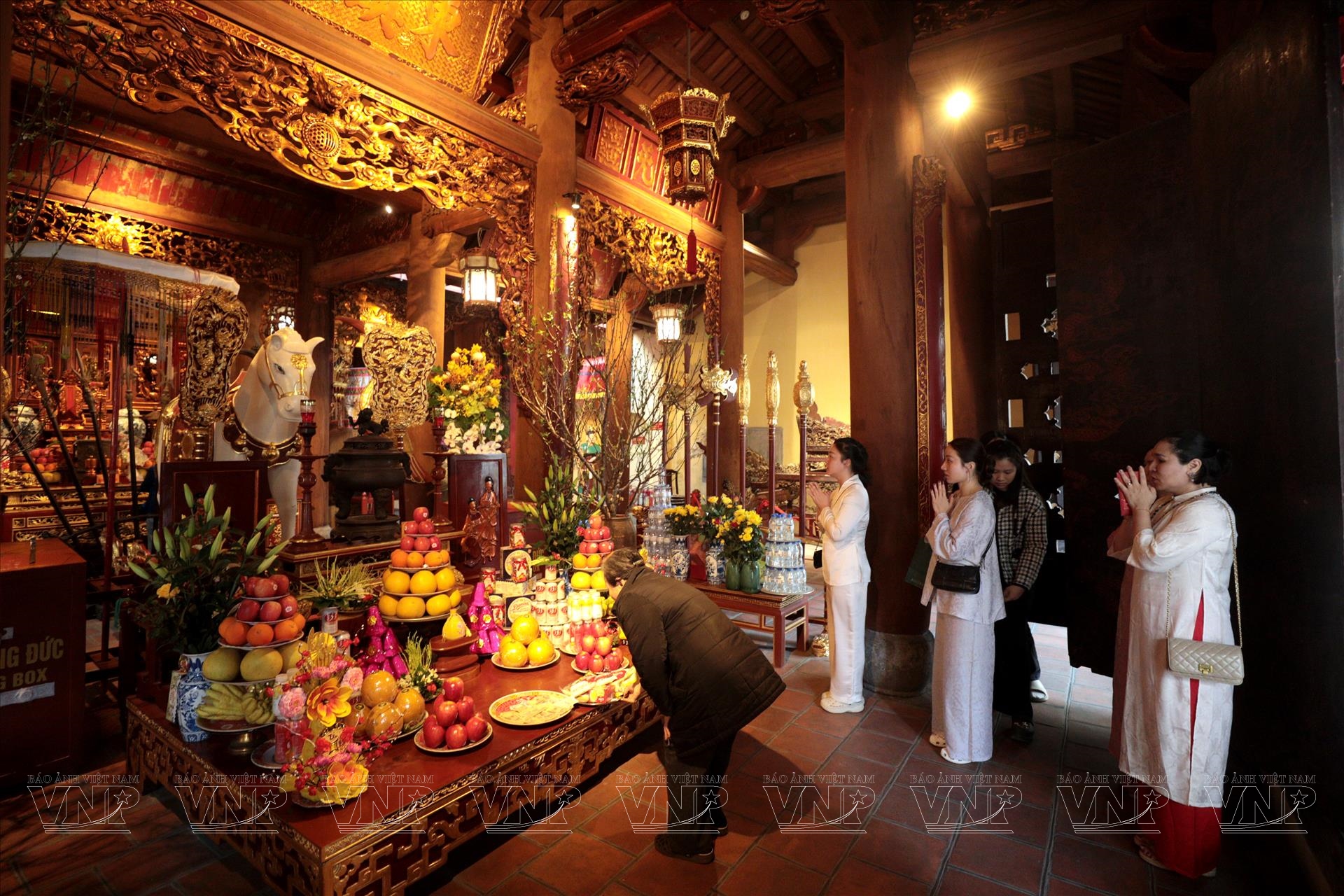 Rời Đền Bạch Mã, chúng tôi tiếp tục hành trình đến Đền Voi Phục tại phường Ngọc Khánh. Nằm trong một không gian khang trang, thoáng đãng với nhiều cây xanh, ngôi đền mang một vẻ đẹp uy nghiêm, trầm mặc. Linh Lang Đại Vương, vị thần trấn giữ phía Tây, như đang lặng lẽ dõi theo những bước chân thành kính của người dân.