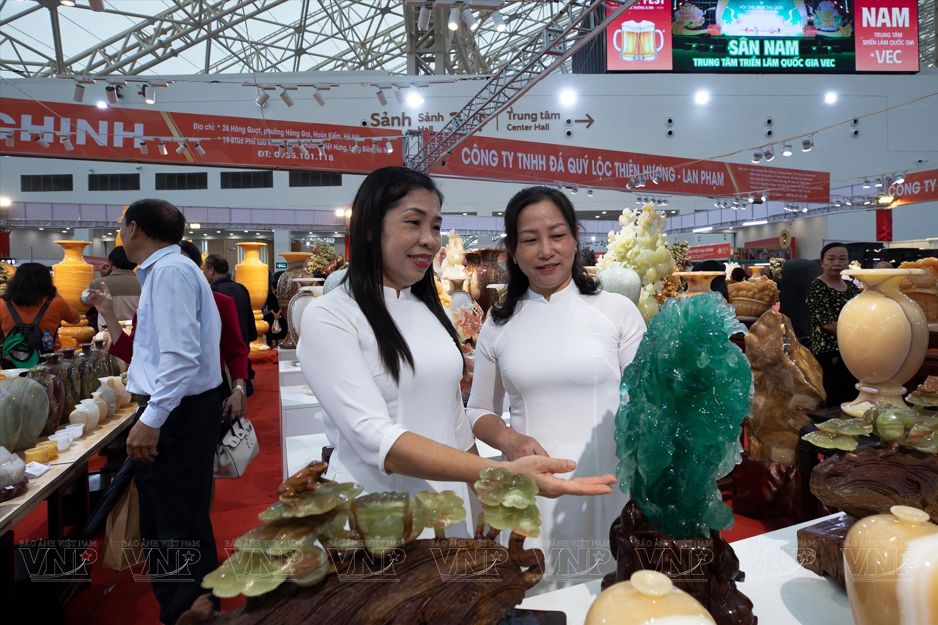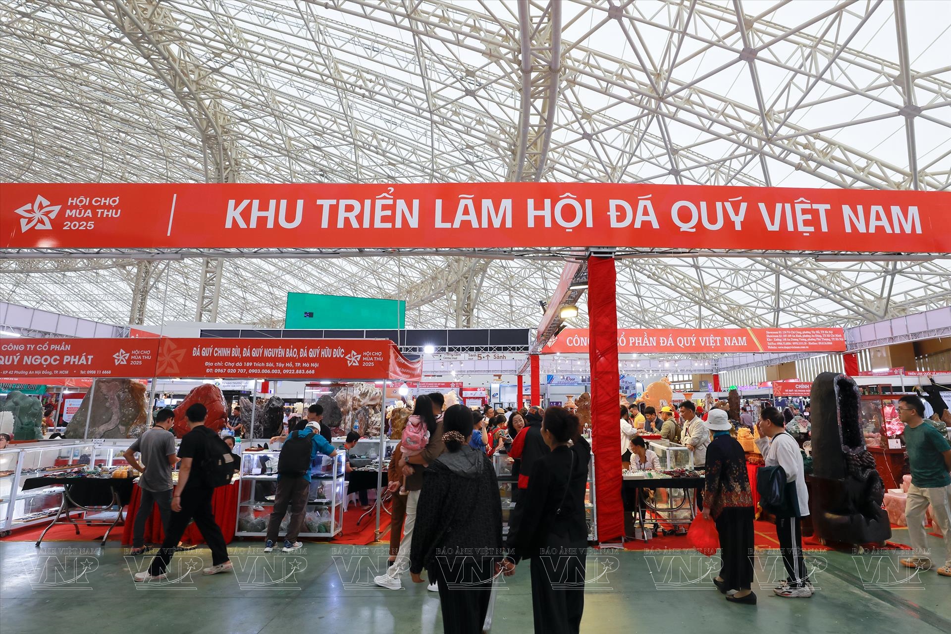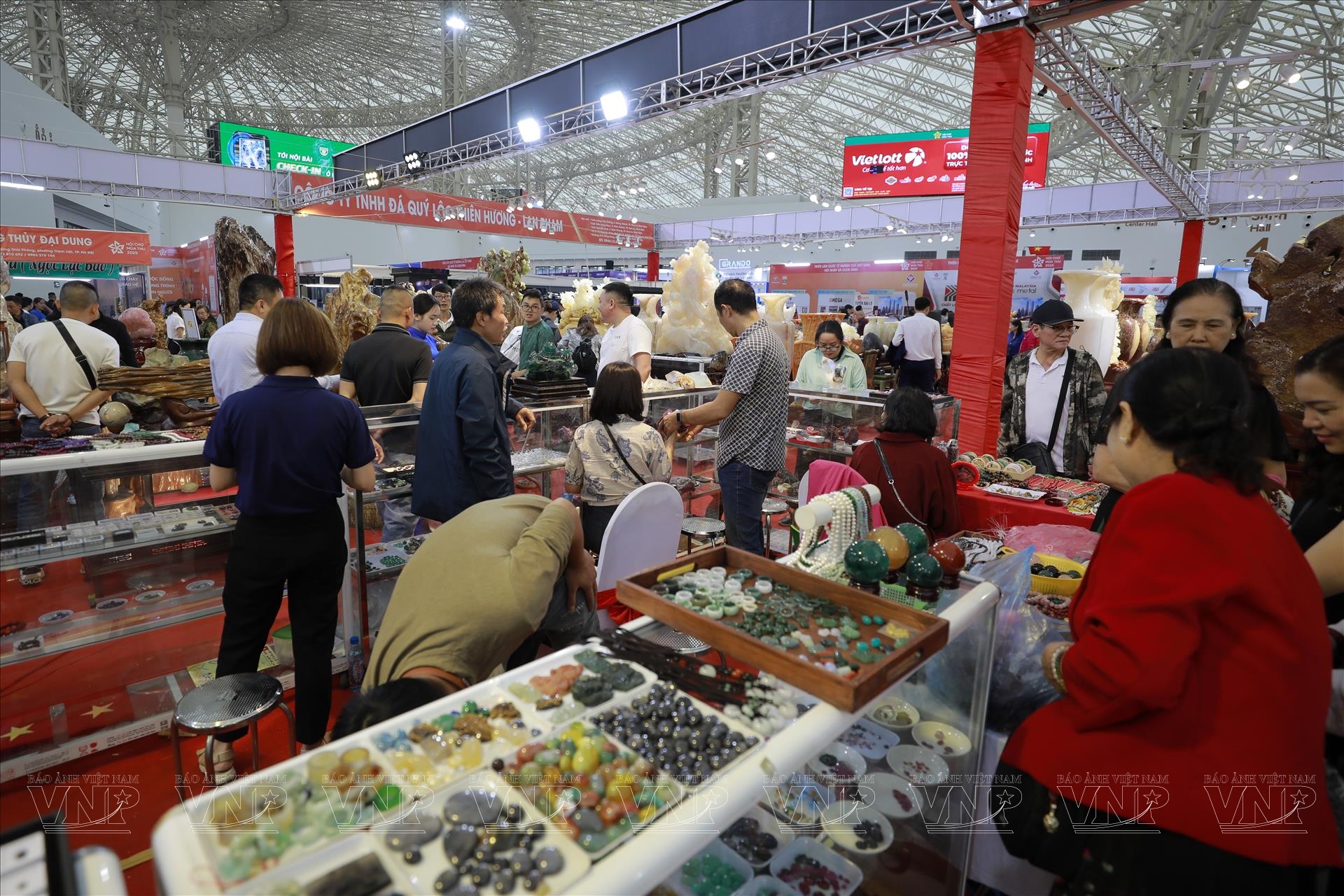 Diễn ra từ ngày 25/10 đến 4/11/2025 tại Trung tâm Triển lãm Việt Nam (VEC), Hội chợ Mùa Thu lần thứ nhất - 2025 quy tụ hàng trăm doanh nghiệp trong và ngoài nước, mang đến không gian trưng bày đa dạng sản phẩm, từ nông nghiệp, thủ công mỹ nghệ đến hàng tiêu dùng, công nghiệp. Giữa không gian sôi động và rực rỡ ấy, khu trưng bày đá quý trở thành điểm nhấn nổi bật, thu hút đông đảo khách tham quan bởi hàng trăm tác phẩm tinh xảo, có giá trị từ vài triệu đến hàng chục tỷ đồng.