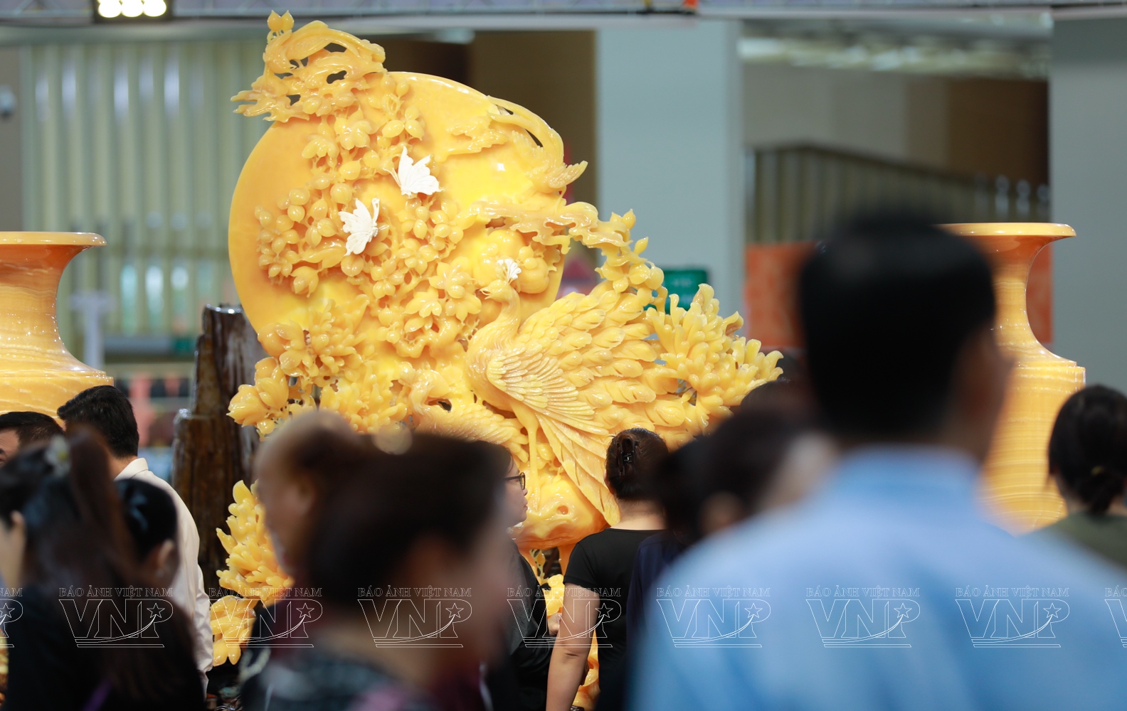 Nổi bật giữa không gian ấy là hàng loạt tác phẩm điêu khắc đá quý đẳng cấp, trong đó có nhiều “siêu phẩm” được rao giá hàng chục tỷ đồng. Đắt giá nhất là tác phẩm “Cửu Long Tranh Châu”, chế tác từ thạch anh tóc vàng Brazil có giá lên tới 10 tỷ đồng. Bên cạnh đó là “Ngũ Long Tranh Châu” bằng thạch anh tóc khói trị giá 6 tỷ đồng; tượng Phật Bà Quan Âm cầm gậy Như ý bằng thạch anh tóc vàng Brazil giá 4,5 tỷ đồng; hay tượng Phật Di Lặc chế tác từ thạch anh tinh thể trị giá 2,6 tỷ đồng, gây ấn tượng bởi phần đáy ánh vàng hiếm gặp.