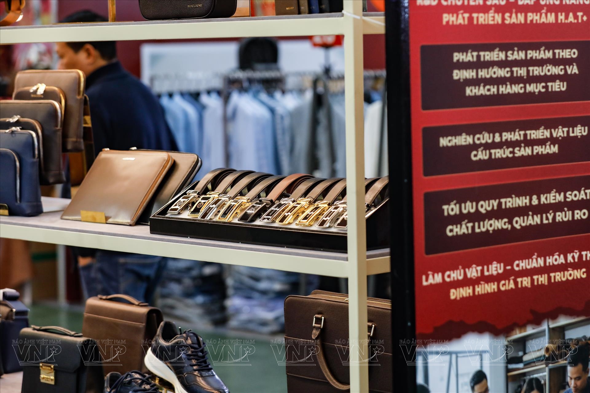 Chị Lê Huyền Trang, nhân viên gian hàng của công ty, cho biết Công ty cổ phần Vương Thịnh chuyên sản xuất giày dép nam, túi xách và dây lưng nam nữ.