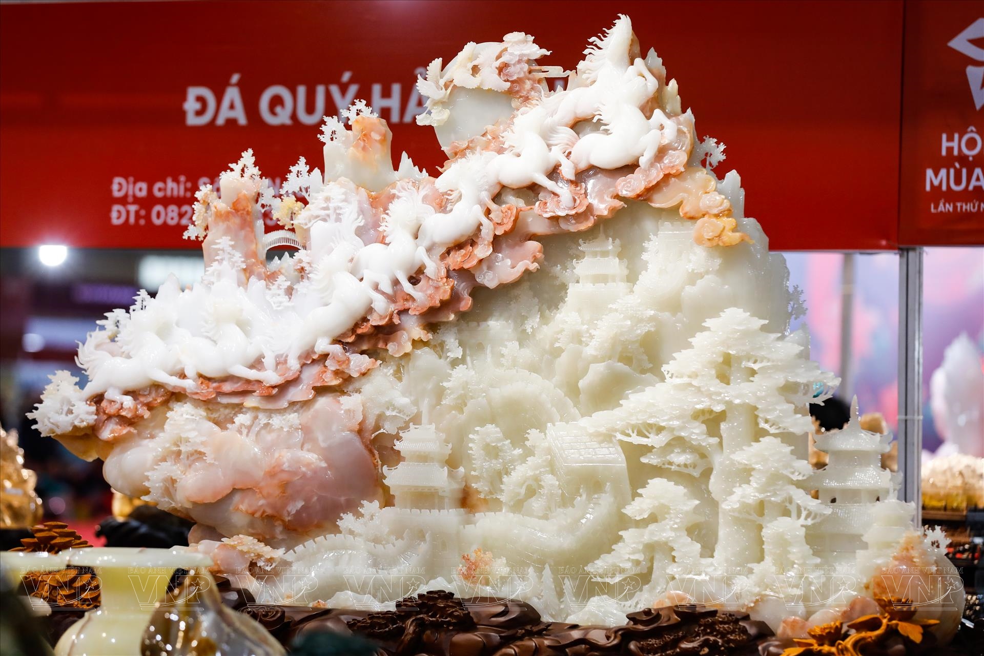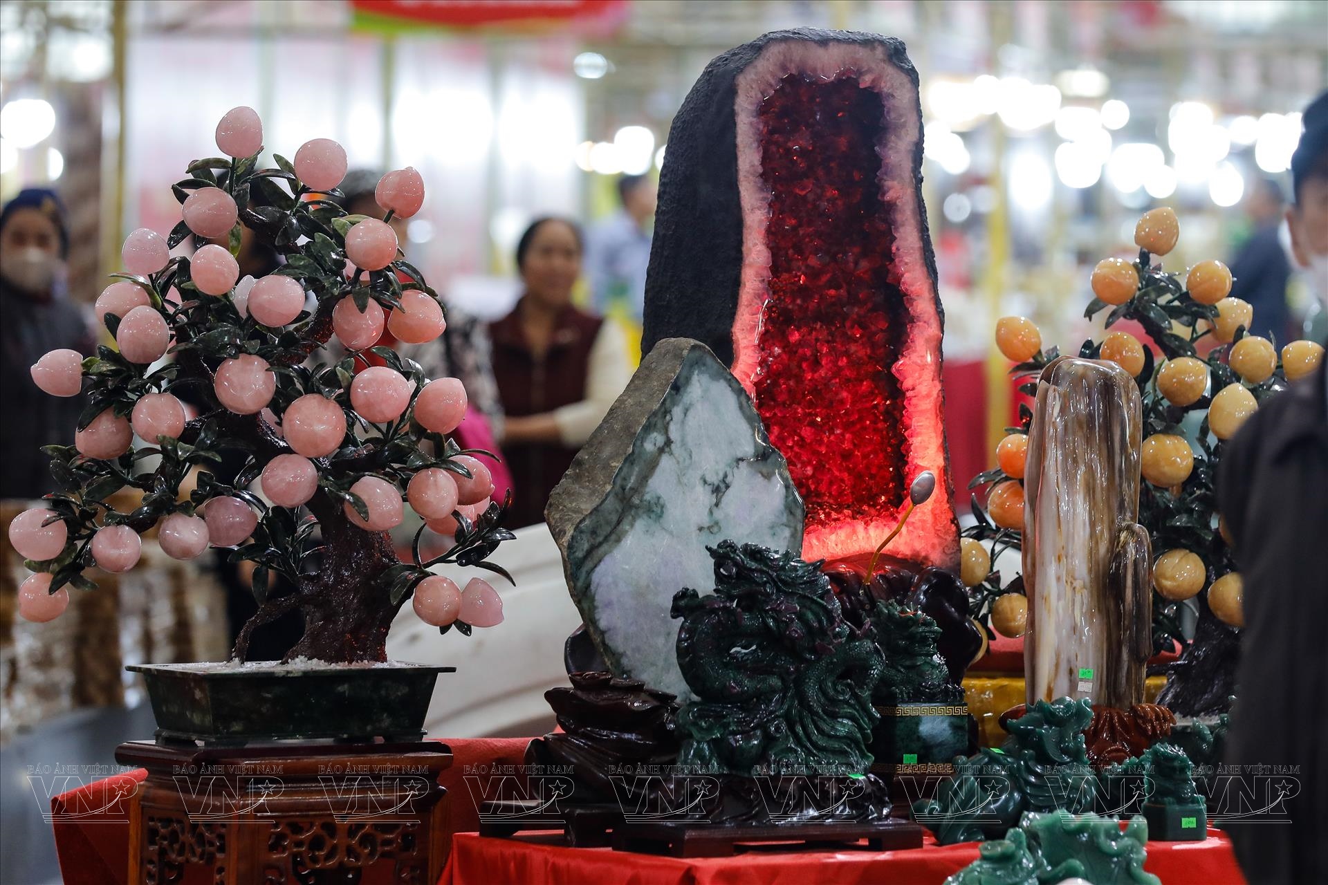 Ngoài ra, ngay bên cạnh gian hàng của tôi còn có gian hàng của doanh nghiệp đá quý Tô Chinh cũng có nhiều sản phẩm có kích cỡ lớn và độc đáo. Đó là sản phẩm Cúp chiến thắng bằng đá chuông được cắm cây lộc đỏ với mong muốn cầu chúc một năm mới chiến thắng và nhiều tài lộc cho đất nước, tượng Bát mã bằng ngọc thể hiện hình ảnh đàn ngựa phi trên thảm lúa biểu trưng cho cây lúa nước Việt Nam, tượng Tam Thế Phật cầu cho quốc thái dân an. Ngoài ra, một tác phẩm khác là hình chữ S Việt Nam với tiêu chí bàn thiền, được nghệ nhân thăng hoa sáng tác thành hai phân đoạn thiền, kết hợp hình ảnh cây tre biểu tượng gần gũi của dân tộc. Hay bức Phú Quý khắc họa cây chuối, cây tùng, đài sen… Tất cả đều mang hơi thở Việt như một lời chào xuân năm mới.