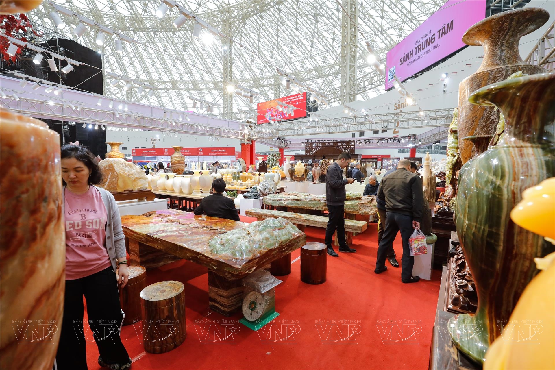 Các doanh nghiệp đều có những sản phẩm đặc sắc riêng của mình để mang đến hội chợ lần này. Ngay tại gian hàng của đá quý Dũng Kiều, tôi mang đến một bức tranh đá rất lớn, cùng bộ bàn ghế bằng đá nguyên khối và nhiều tác phẩm hoa nghệ thuật. Đây đều là những sản phẩm đẹp, phù hợp trưng bày, trang trí trong nhà và mang ý nghĩa phong thủy nên được người dân rất ưa chuộng.