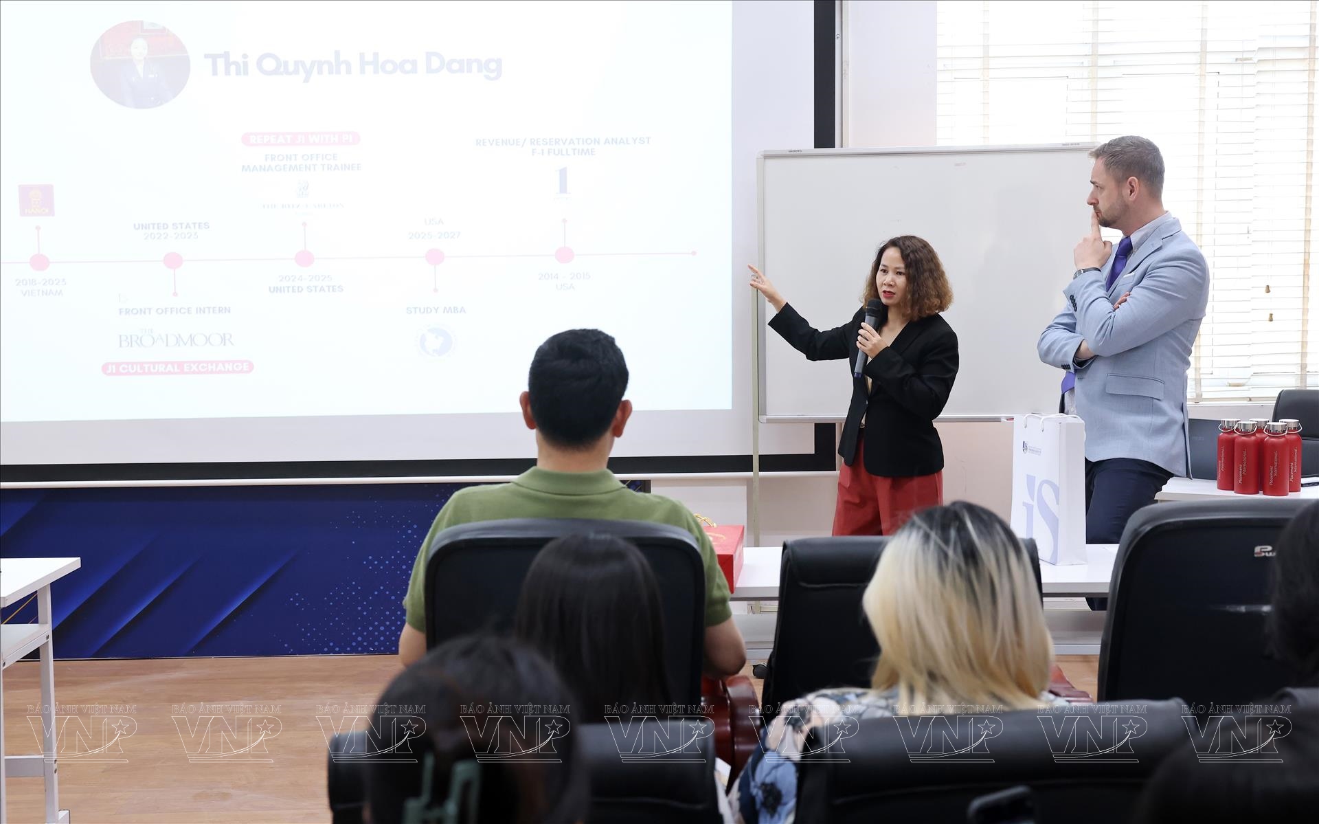 Nhiều bạn sinh viên đã mạnh dạn tự tin đặt câu hỏi với nhà tuyển dụng và thể hiện cá tính, sự cầu thị của mình. Trong màn phỏng vấn 1:1, ông Adam khá hài lòng với trình độ tiếng Anh của các bạn trường quốc tế. Ông cho biết: Các bạn sinh viên lo lắng vì mình sắp tốt nghiệp chưa có kinh nghiệm nhưng ông Adam cho rằng, yếu tố quyết định lại nằm ở thái độ chuyên nghiệp và khả năng thích nghi của ứng viên trong môi trường quốc tế. Các kỹ năng mềm sinh viên cần hoàn thiện là: kỹ năng giao tiếp đa văn hóa, thể hiện ở khả năng lắng nghe, thấu hiểu và phản hồi tích cực với khách hàng đến từ nhiều nền văn hóa khác nhau. Tiếp đó, kỹ năng làm việc nhóm và giải quyết vấn đề linh hoạt giúp sinh viên thích ứng tốt trong môi trường có cường độ cao và yêu cầu phục vụ chuẩn xác. Bên cạnh đó, khả năng quản lý cảm xúc và duy trì thái độ tích cực là yếu tố quan trọng giúp người làm dịch vụ giữ được phong thái chuyên nghiệp dù trong những tình huống áp lực. Cuối cùng, tư duy cầu tiến và tinh thần ham học hỏi sẽ là nền tảng để sinh viên không ngừng hoàn thiện bản thân, sẵn sàng đón nhận những cơ hội phát triển nghề nghiệp trong ngành công nghiệp khách sạn toàn cầu.
