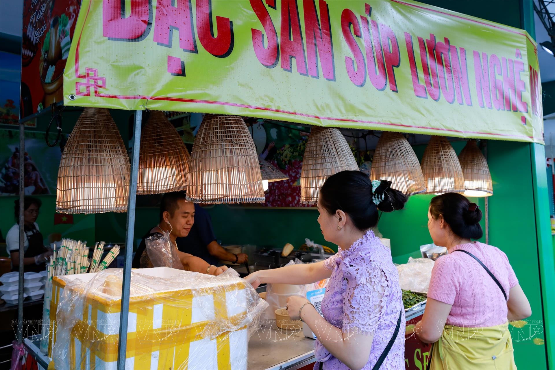 Giữa không gian rực rỡ sắc màu và hương vị, gian ẩm thực của tỉnh Nghệ An nổi bật với mùi thơm cay nồng của súp lươn thu hút đông đảo thực khách. Chị Trần Thanh Mỹ, cán bộ Phòng Du lịch thuộc Sở Văn hóa, Thể thao và Du lịch tỉnh Nghệ An chia sẻ: “Tham gia hội chợ, chúng tôi mang đến nhiều sản phẩm đặc trưng của xứ Nghệ như lươn Nghệ An, giò bê, trà sen, trà dược liệu từ Đô Lương, Kỳ Sơn, cùng tinh bột nghệ, bột sắn dây… Tất cả đều là sản phẩm OCOP đạt chuẩn của tỉnh”.