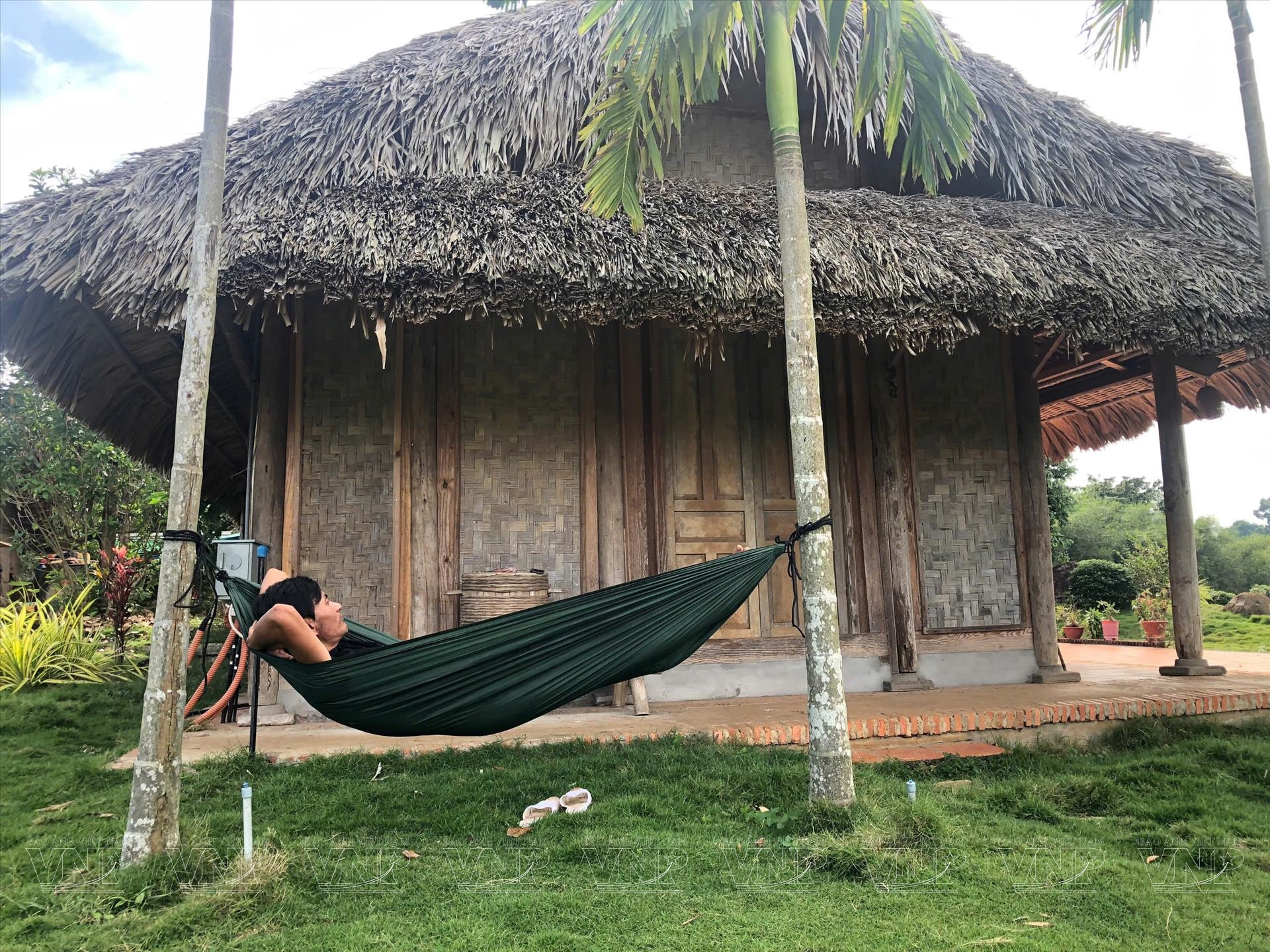 Các gian nhà cổ tại Lan Đình Bến được gia chủ kỳ công tuyển chọn từ Huế, sau đó vận chuyển và lắp dựng lại giữa không gian vườn đồi. Lối sống thanh tịnh, tối giản, gần gũi thiên nhiên cùng việc tự cung tự cấp phần lớn thực phẩm khiến nơi đây mang dáng dấp một “bến trú” yên bình giữa đời sống hiện đại.