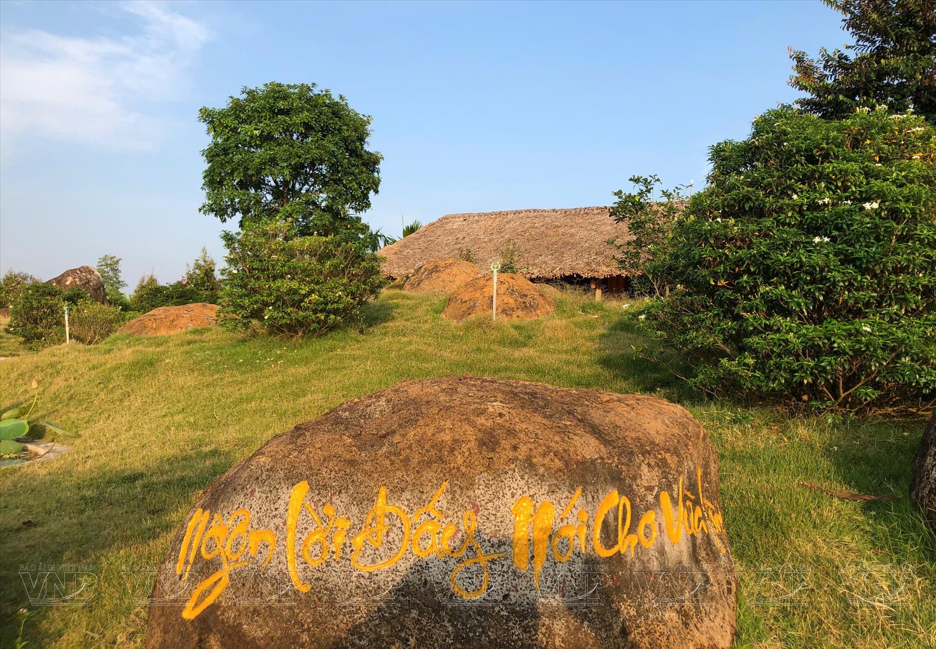 Ngay từ cổng vào, du khách đã ấn tượng với những tảng đá xanh xếp dọc lối đi, trên đó khắc thư pháp Việt. Nội dung khắc họa các tác phẩm của chí sĩ yêu nước Á Nam Trần Tuấn Khải, thân sinh của nữ sĩ Lan Hinh. Xen giữa không gian ấy là hình tượng “12 bến” của đời người theo quan niệm xưa: Sĩ, Nông, Công, Thương, Ngư, Tiều, Canh, Mục, Cầm, Kỳ, Thi, Họa… cùng những “bến” khác được nữ sĩ thể hiện trong tập thơ “Bến nào”. Những biểu tượng ấy không chỉ tạo điểm nhấn thẩm mỹ mà còn gợi mở chiều sâu văn hóa, triết lý nhân sinh.