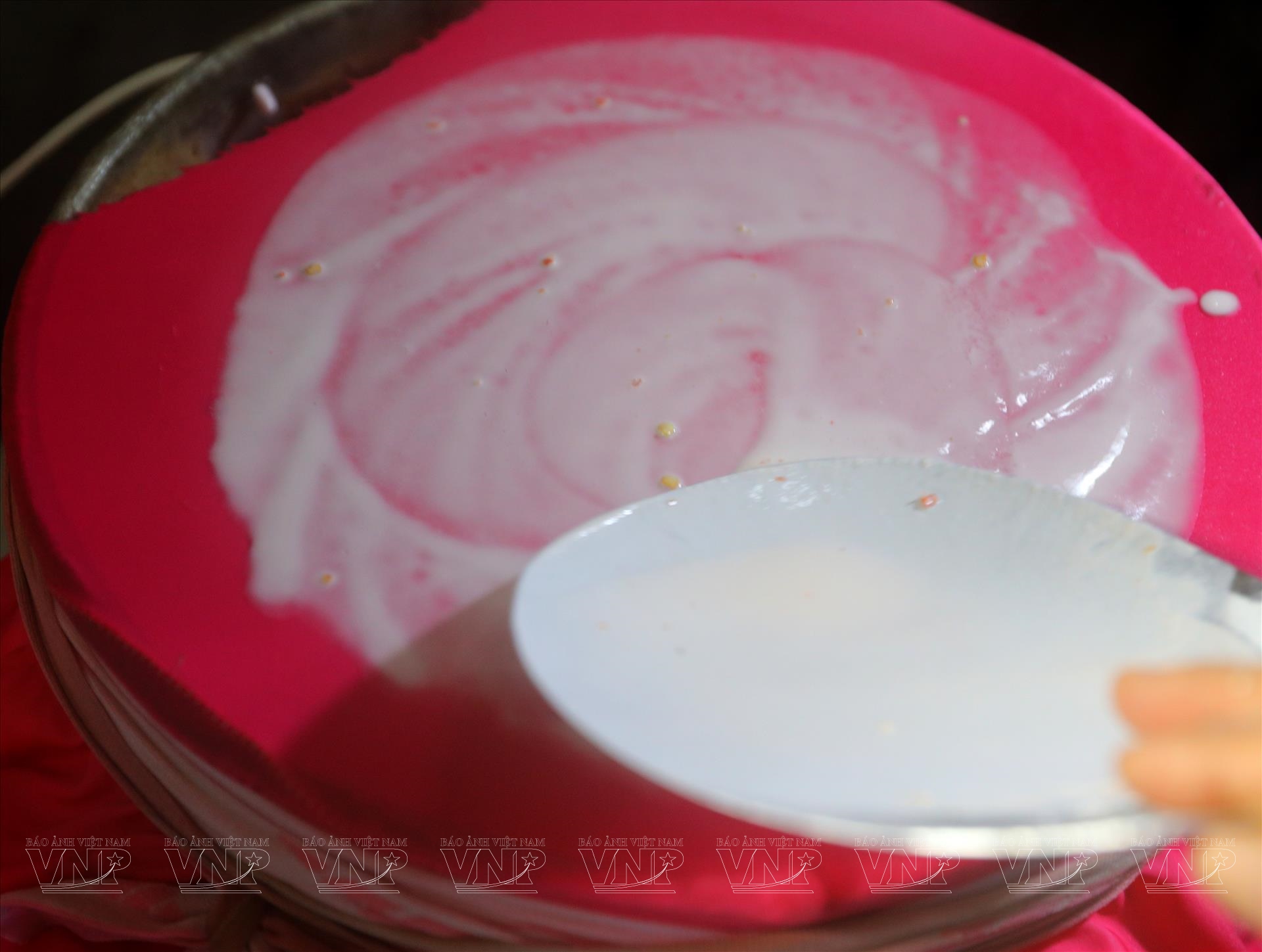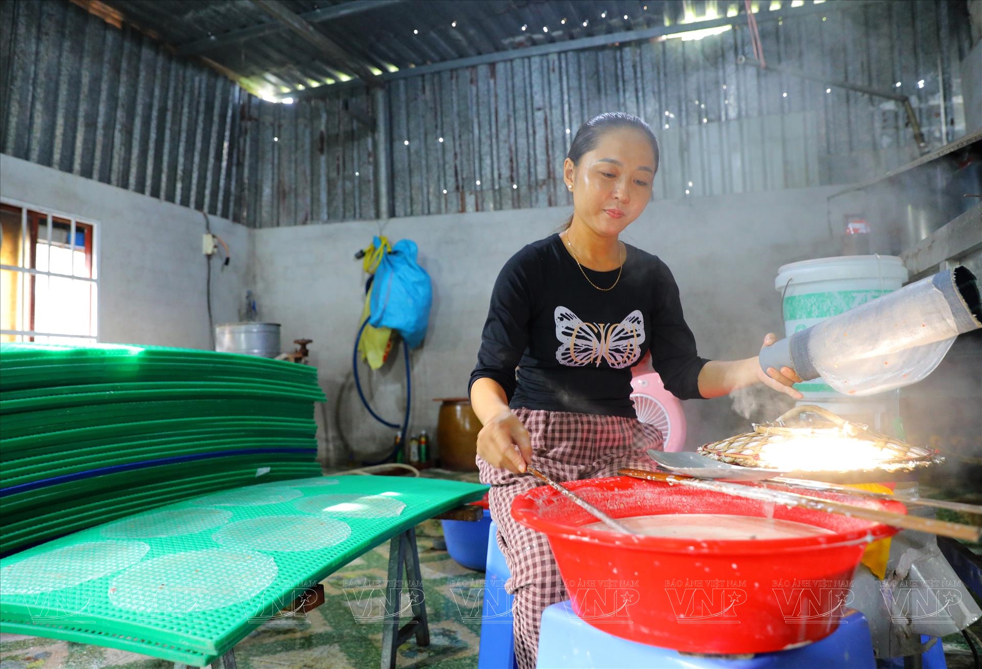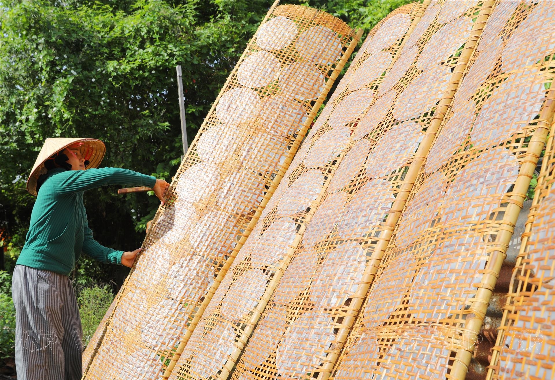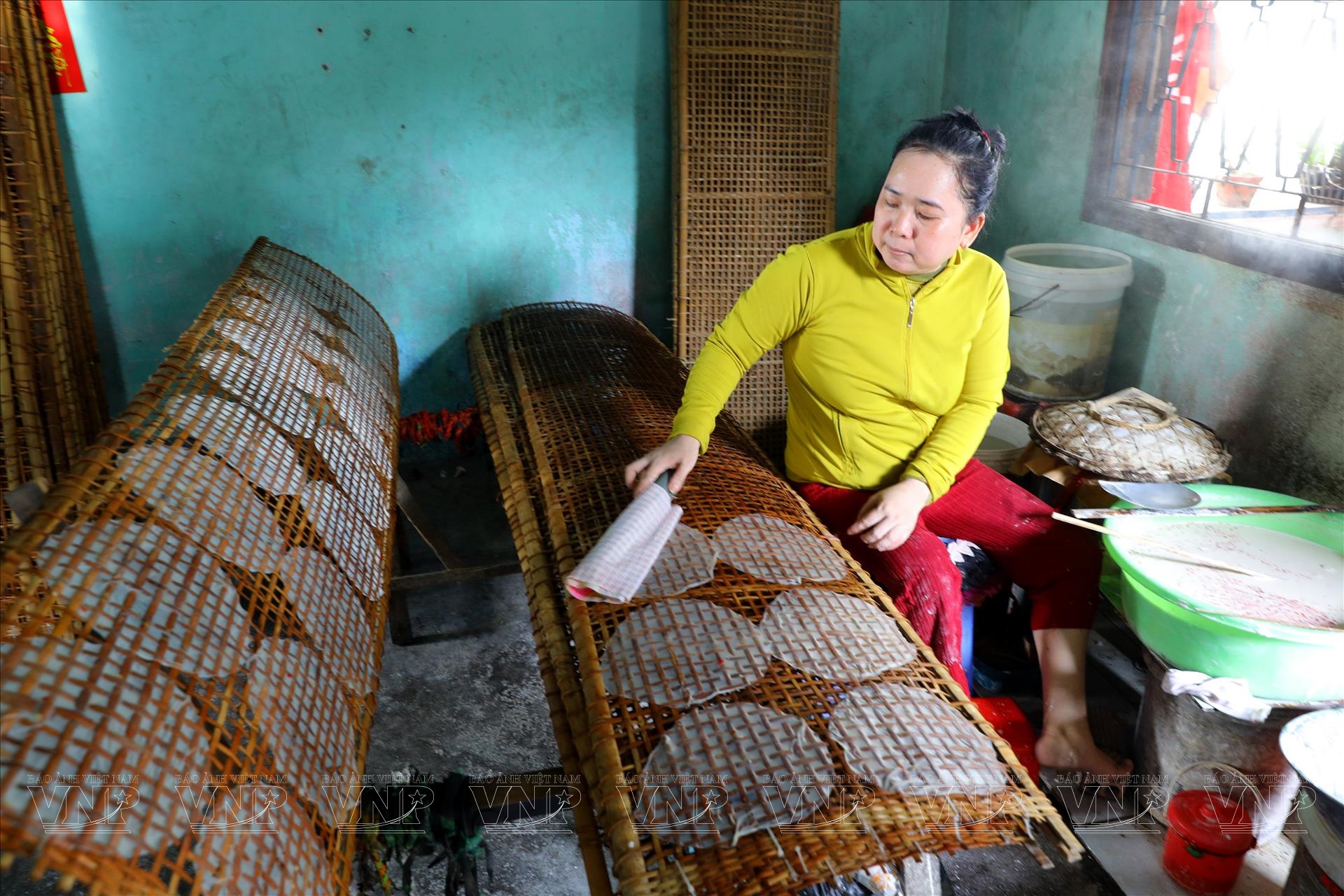 Mỗi sớm tinh mơ, khói bếp từ những lò tráng lại tỏa ra, quyện trong mùi gạo mới thơm nồng. Người thợ cần mẫn múc từng vá bột gạo, dàn đều trên mặt vải căng, chờ hơi nước làm chín, rồi khéo léo nhấc từng tấm bánh mỏng tang đặt lên phên tre đem phơi dưới nắng vàng. Nhịp sống gắn với nghề truyền thống cứ thế tiếp nối, tạo nên bức tranh bình dị mà giàu bản sắc.