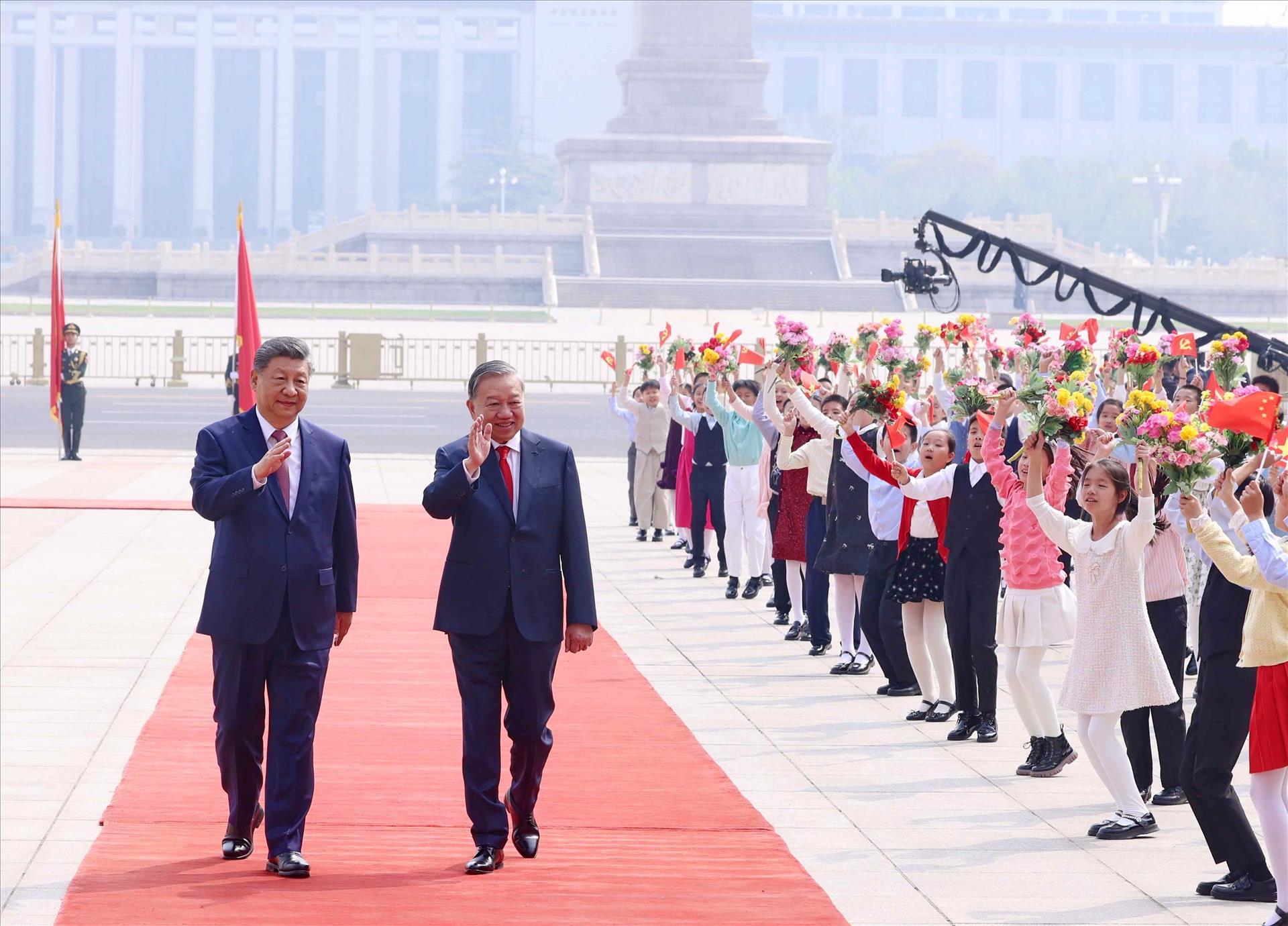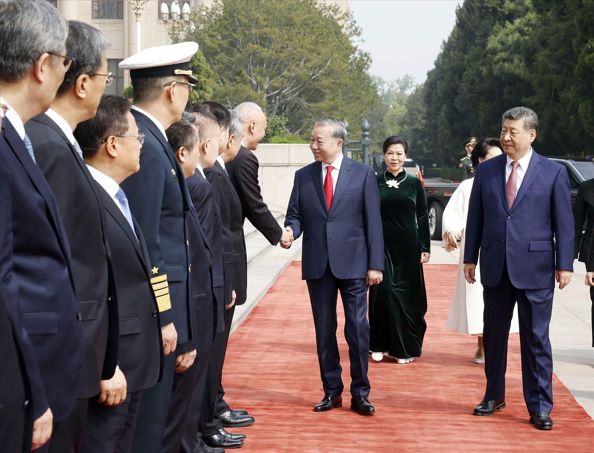 Theo đặc phái viên TTXVN, sáng nay, 15/4, Lễ đón chính thức Tổng Bí thư, Chủ tịch nước Tô Lâm và Phu nhân cùng Đoàn đại biểu cấp cao Việt Nam thăm cấp Nhà nước đến Trung Quốc từ ngày 14 - 17/4/2026 đã được tổ chức trọng thể tại Đại lễ đường Nhân dân ở Thủ đô Bắc Kinh, Trung Quốc theo nghi thức cao nhất dành cho nguyên thủ quốc gia với 21 loạt đại bác chào mừng. Tổng Bí thư, Chủ tịch Trung Quốc Tập Cận Bình và Phu nhân chủ trì Lễ đón.
