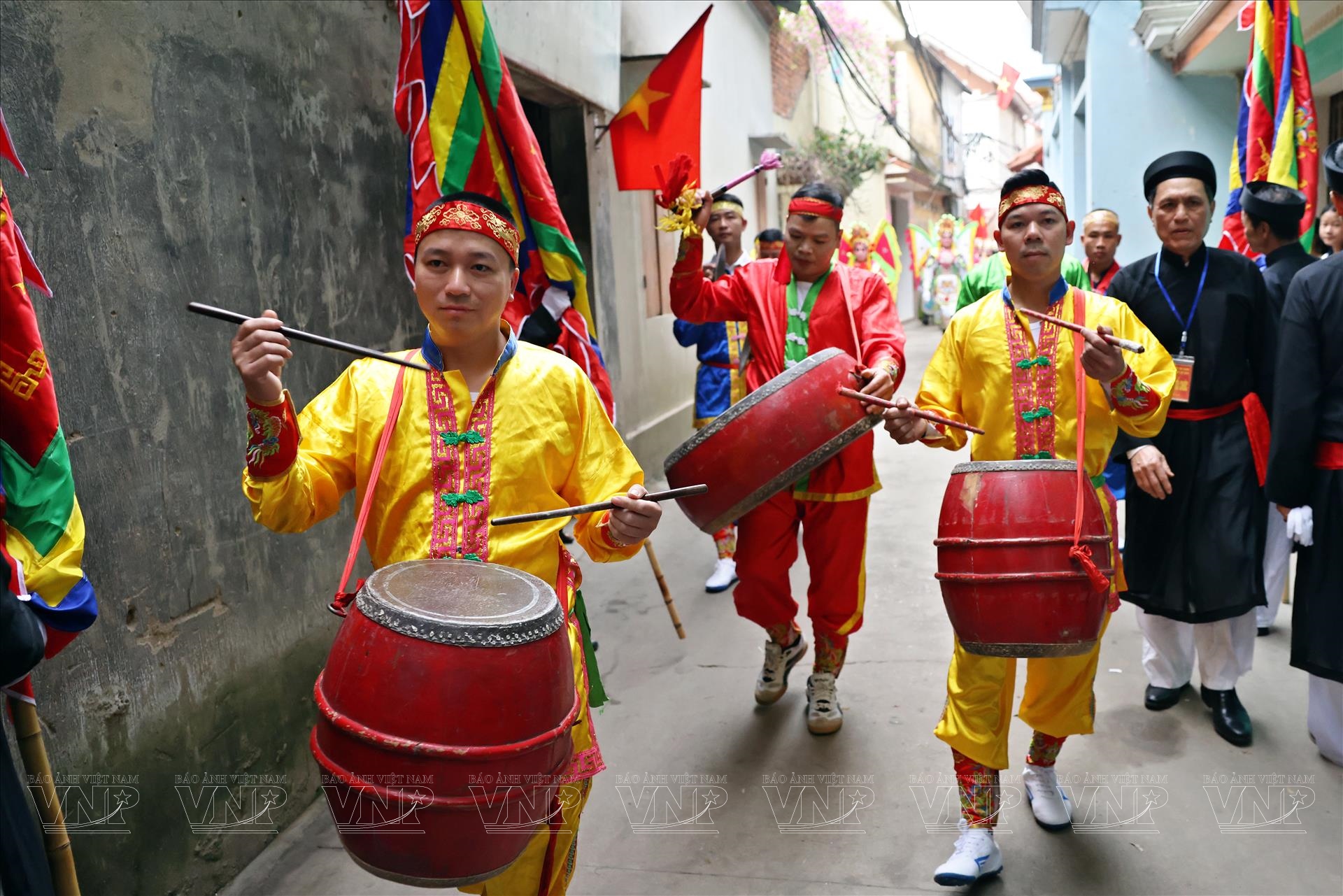 Khung cảnh lễ rước càng trở nên sinh động khi các đoàn người mặc áo the, khăn xếp, áo dài truyền thống sải bước trong nhịp trống rộn ràng. Những lá cờ hội tung bay trong gió xuân, xen giữa những bức tường gạch đỏ và mái ngói cổ kính của làng gốm xưa, tạo nên bức tranh lễ hội đậm chất văn hóa Kinh Bắc.