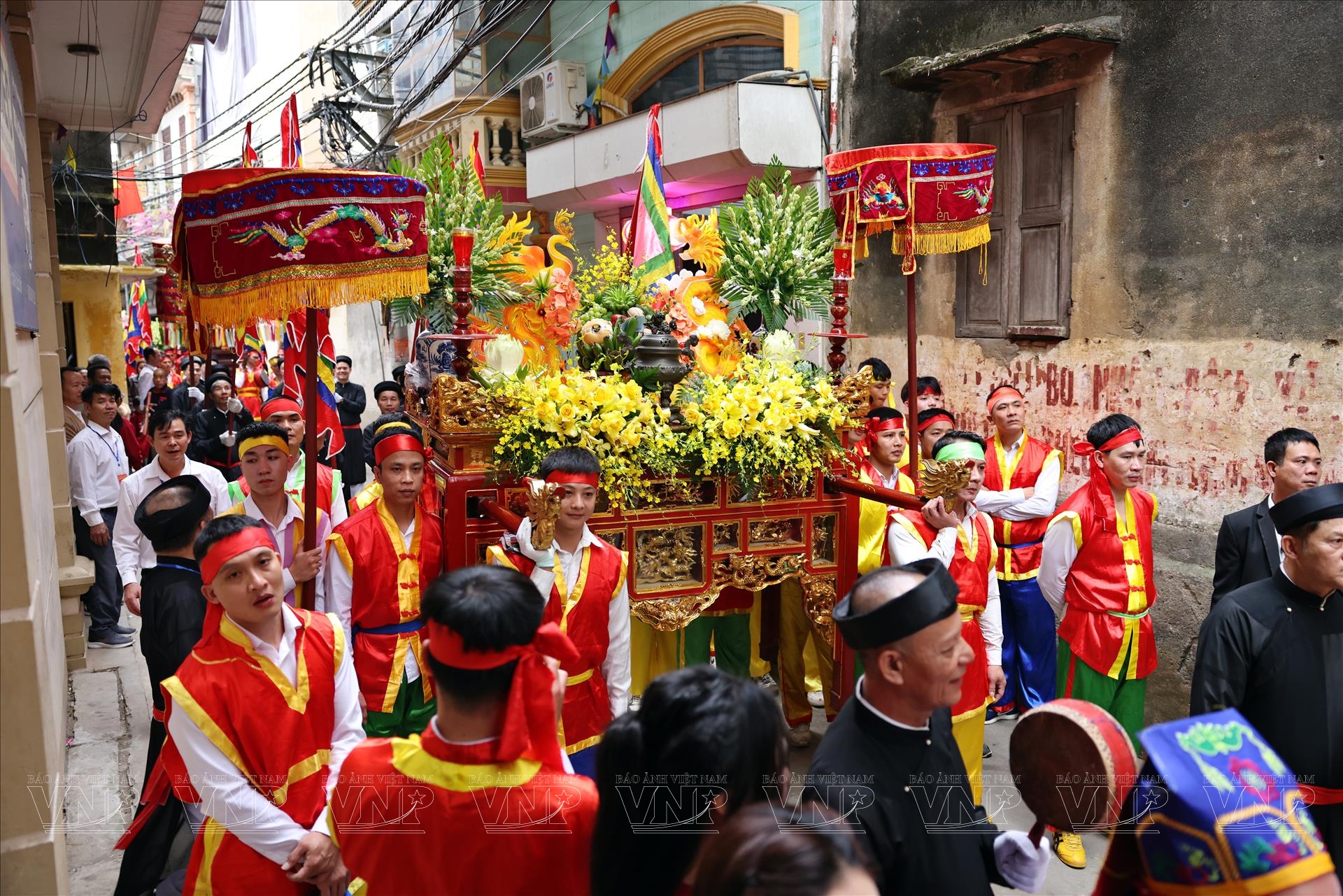 Ngay từ sáng sớm, không gian quanh Đình Thổ Hà đã rực rỡ cờ hội, cờ ngũ sắc và dòng người trẩy hội tấp nập. Tiếng trống hội vang lên từng hồi giục giã, hòa cùng tiếng nói cười rộn ràng tạo nên bầu không khí xuân náo nức. Người dân trong làng diện trang phục truyền thống, chuẩn bị cho các nghi thức rước kiệu và tế lễ - những nghi lễ quan trọng nhất của lễ hội.