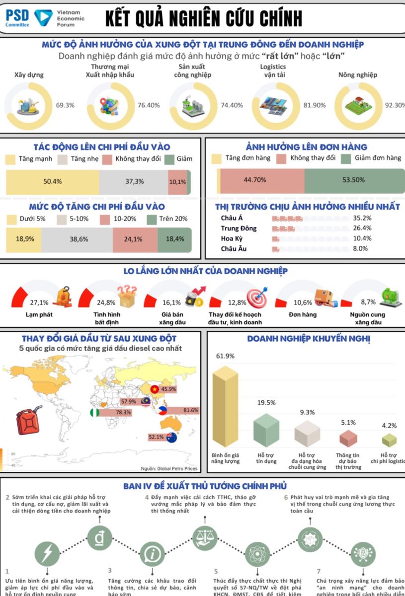 Khảo sát hơn 200 doanh nghiệp của Ban Nghiên cứu phát triển kinh tế tư nhân (Ban IV, Hội đồng Tư vấn cải cách thủ tục hành chính của Thủ tướng Chính phủ) 2 tuần cuối tháng 3/2026 cho thấy, gần 65% doanh nghiệp đang chịu ảnh hưởng bởi giá nhiên liệu tăng, tác động trực tiếp vào các quy trình vận tải, xuất nhập khẩu, sản xuất công nghiệp, nông nghiệp và chuỗi cung ứng quốc tế, đặt ra các yêu cầu cấp bách phải tái cơ cấu, cắt giảm nguồn lực và linh hoạt các giải pháp ứng phó, bình ổn đầu vào, đầu ra thị trường...
