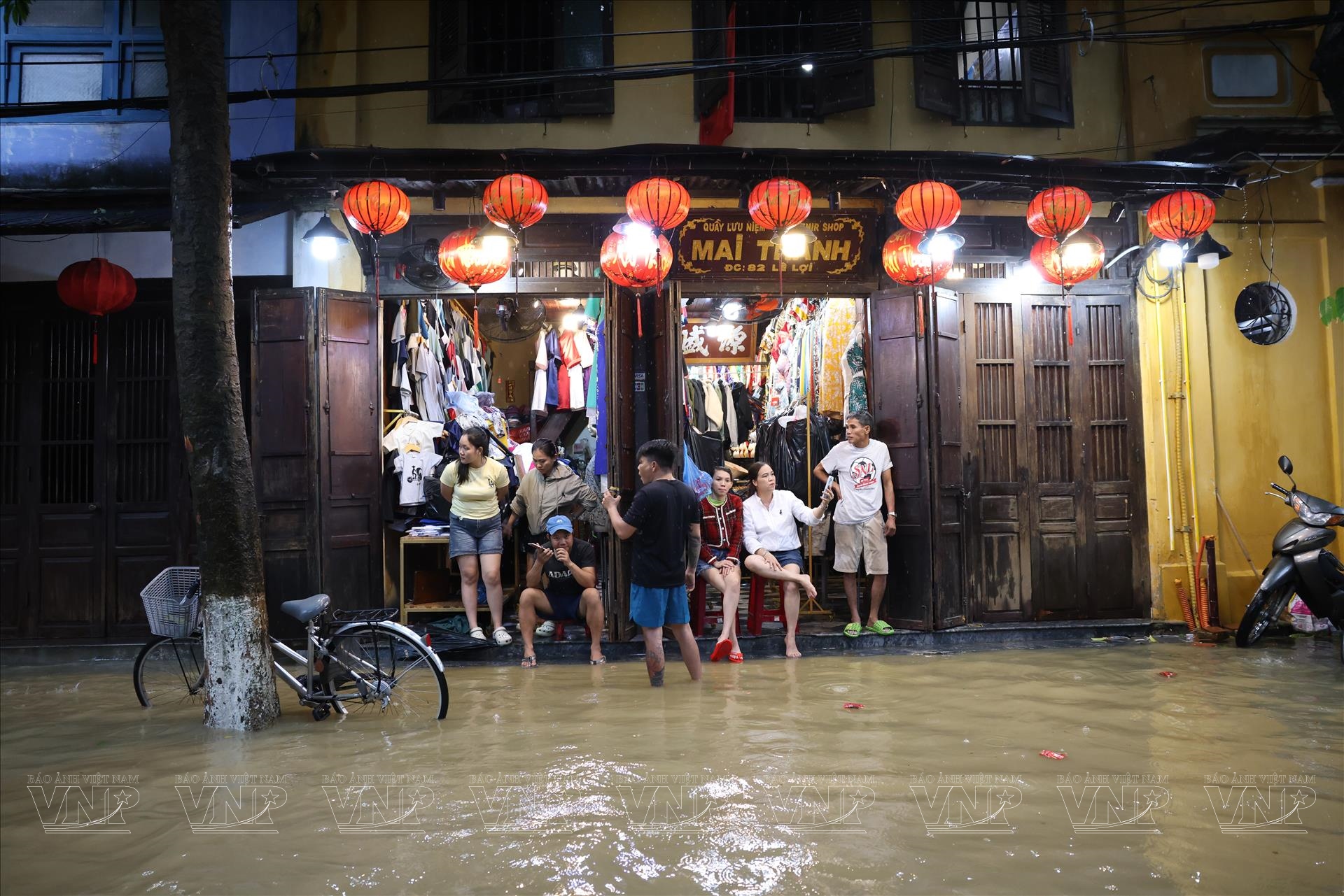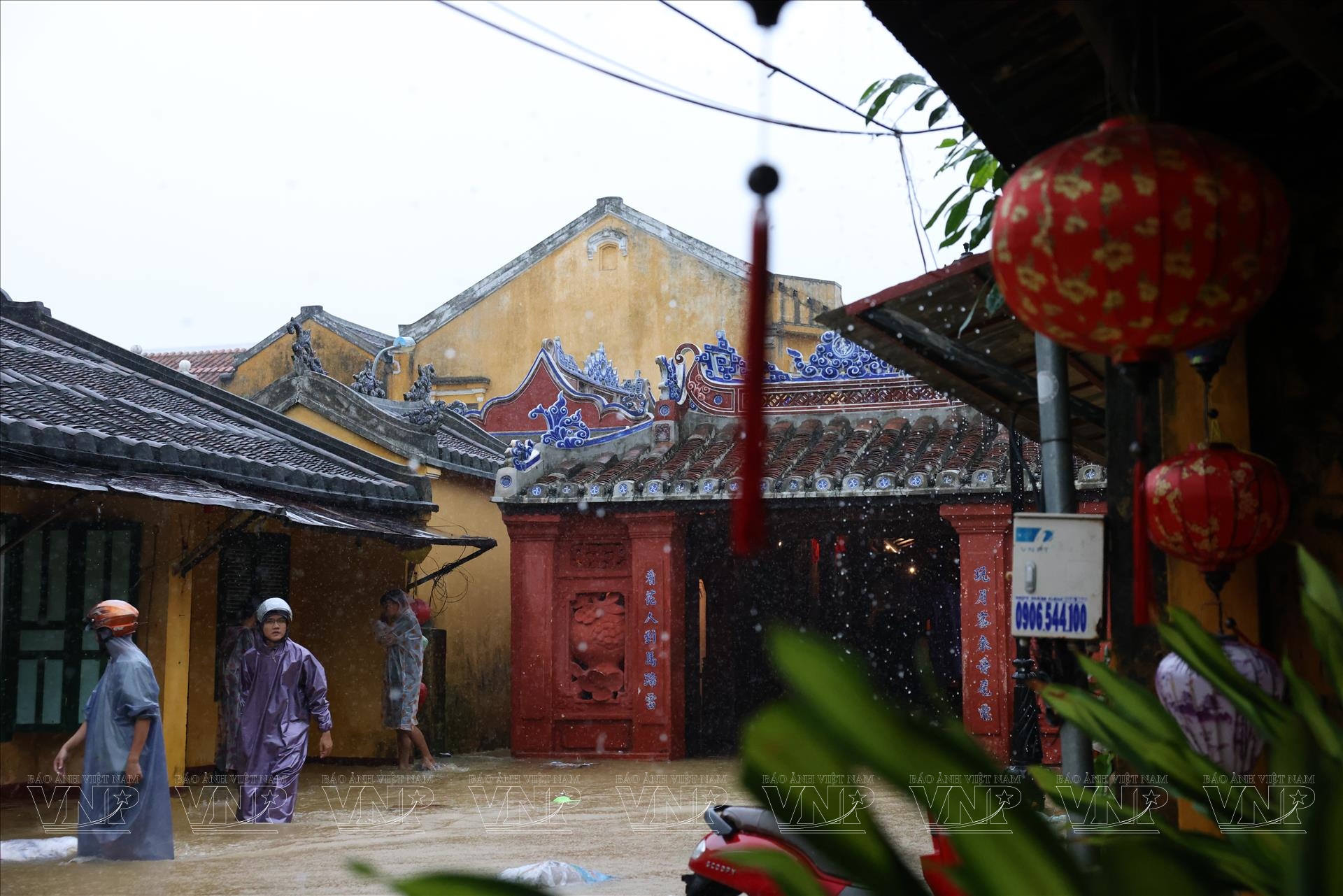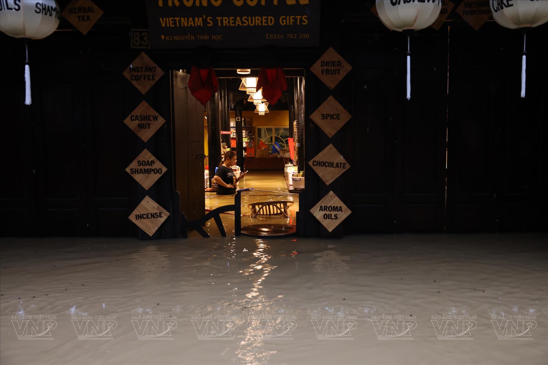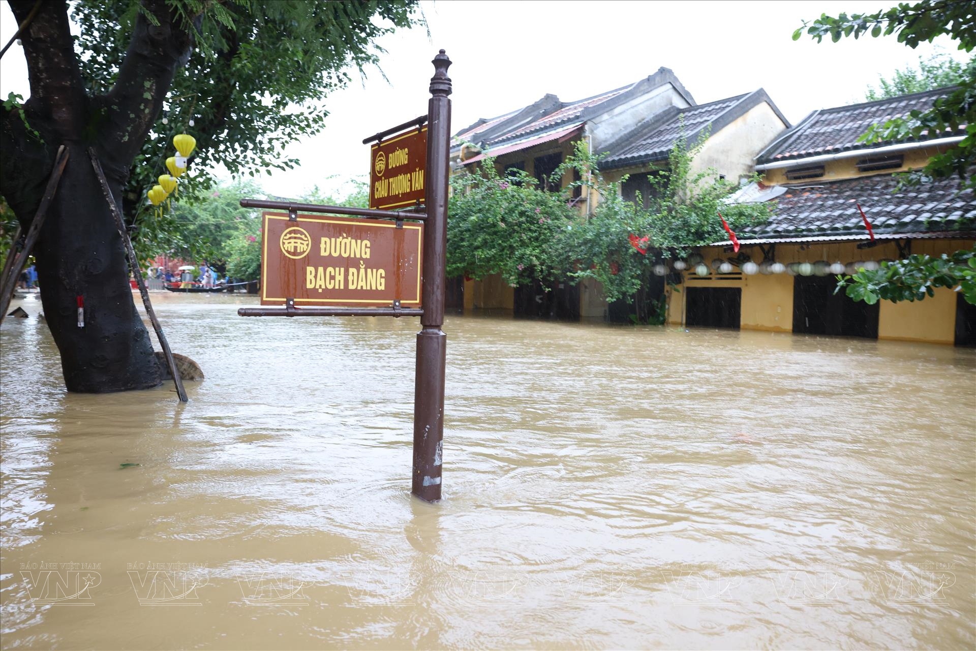Chiều 26/10, tại phố cổ Hội An, nước từ sông Hoài dâng cao tràn lên đường Bạch Đằng, đến nữa đêm nước đã dâng cao hơn 1m khiến nhiều nhà cửa ven sông bị ngập nặng.