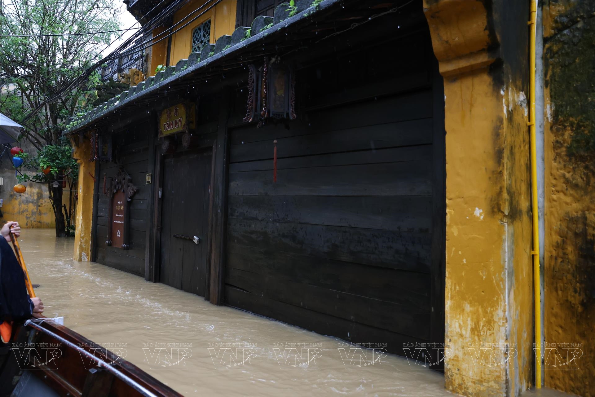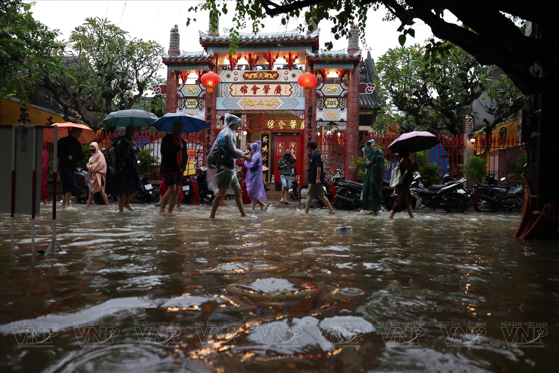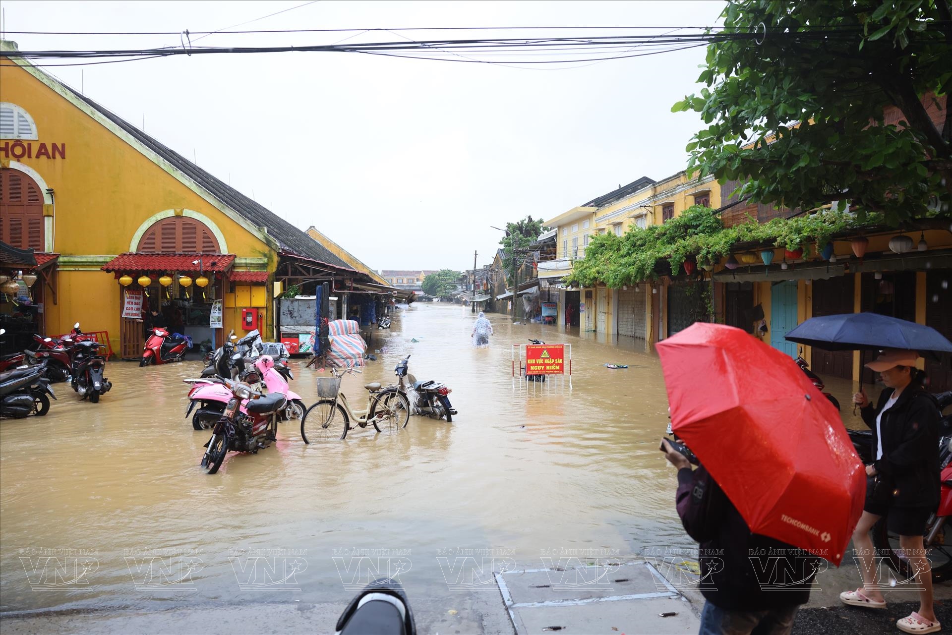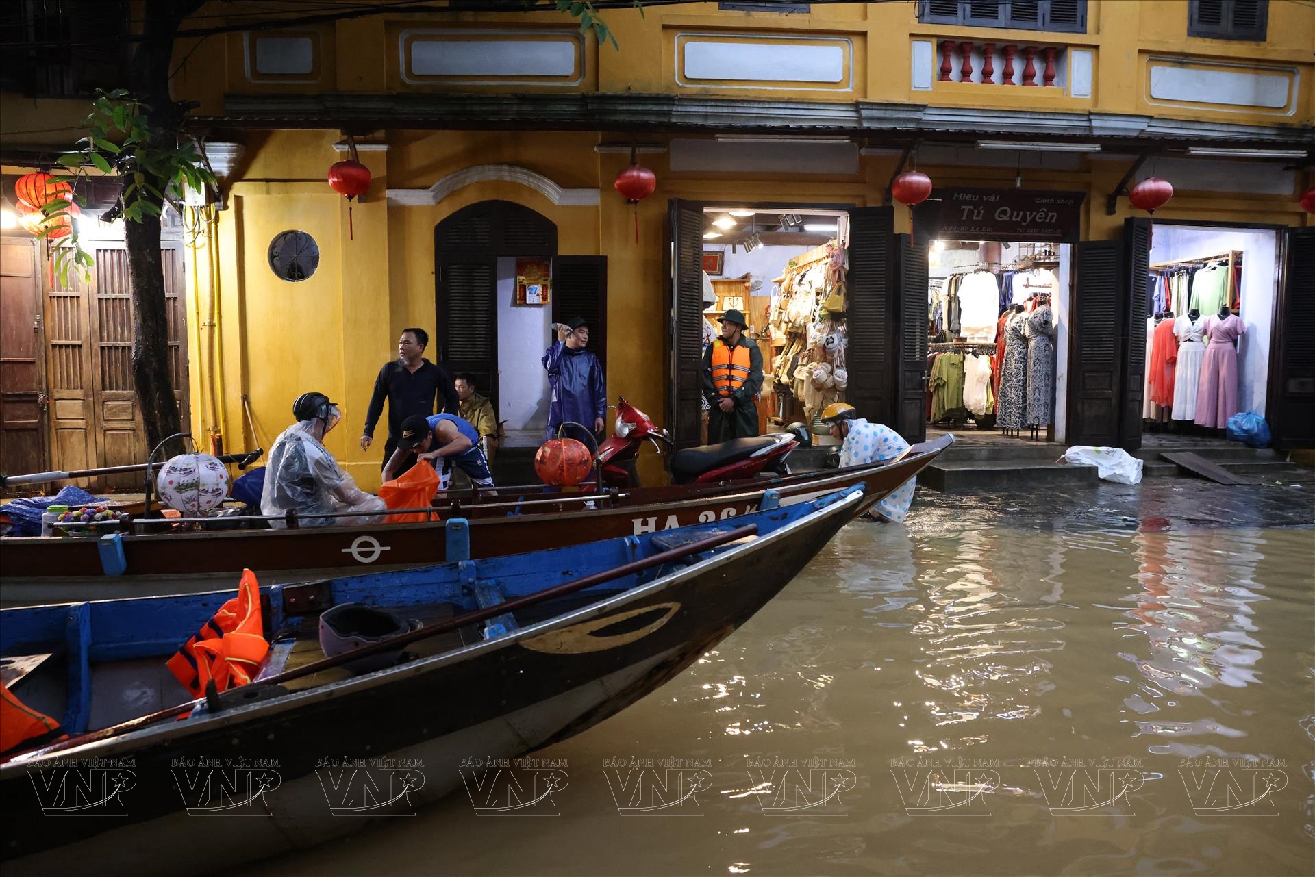 Chiều 26/10, tại phố cổ Hội An, nước từ sông Hoài dâng cao tràn lên đường Bạch Đằng, đến nữa đêm nước đã dâng cao hơn 1m khiến nhiều nhà cửa ven sông bị ngập nặng.