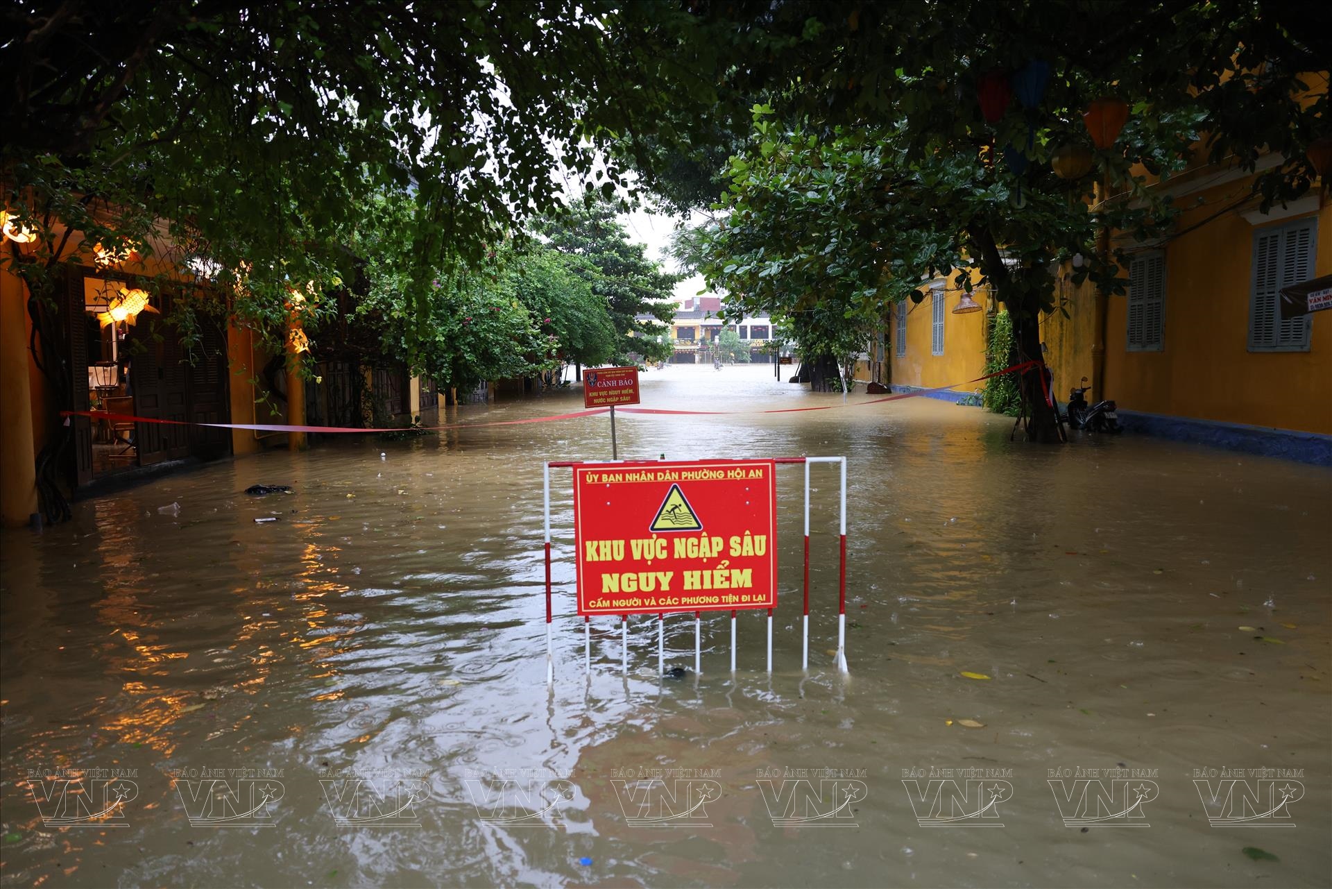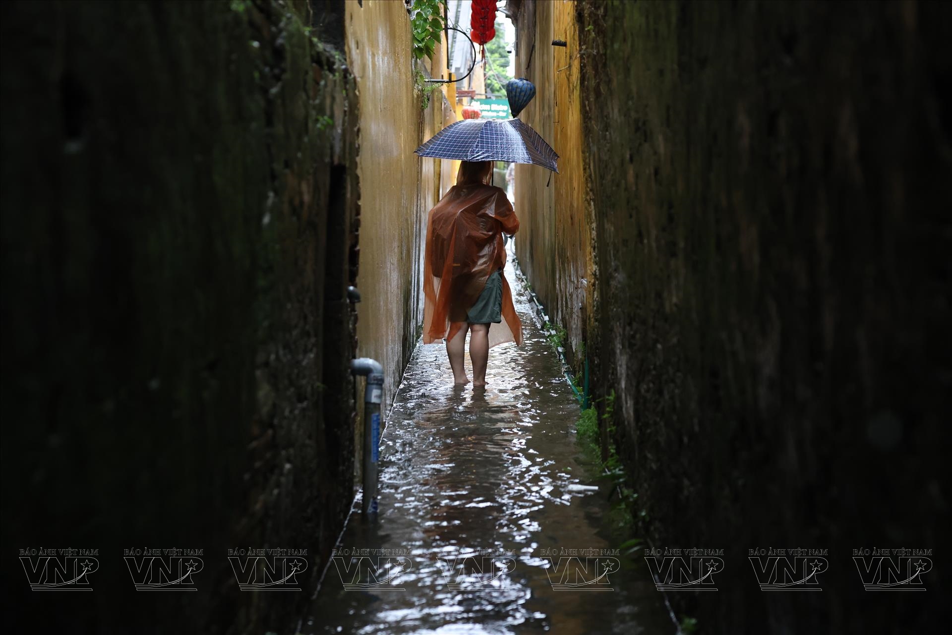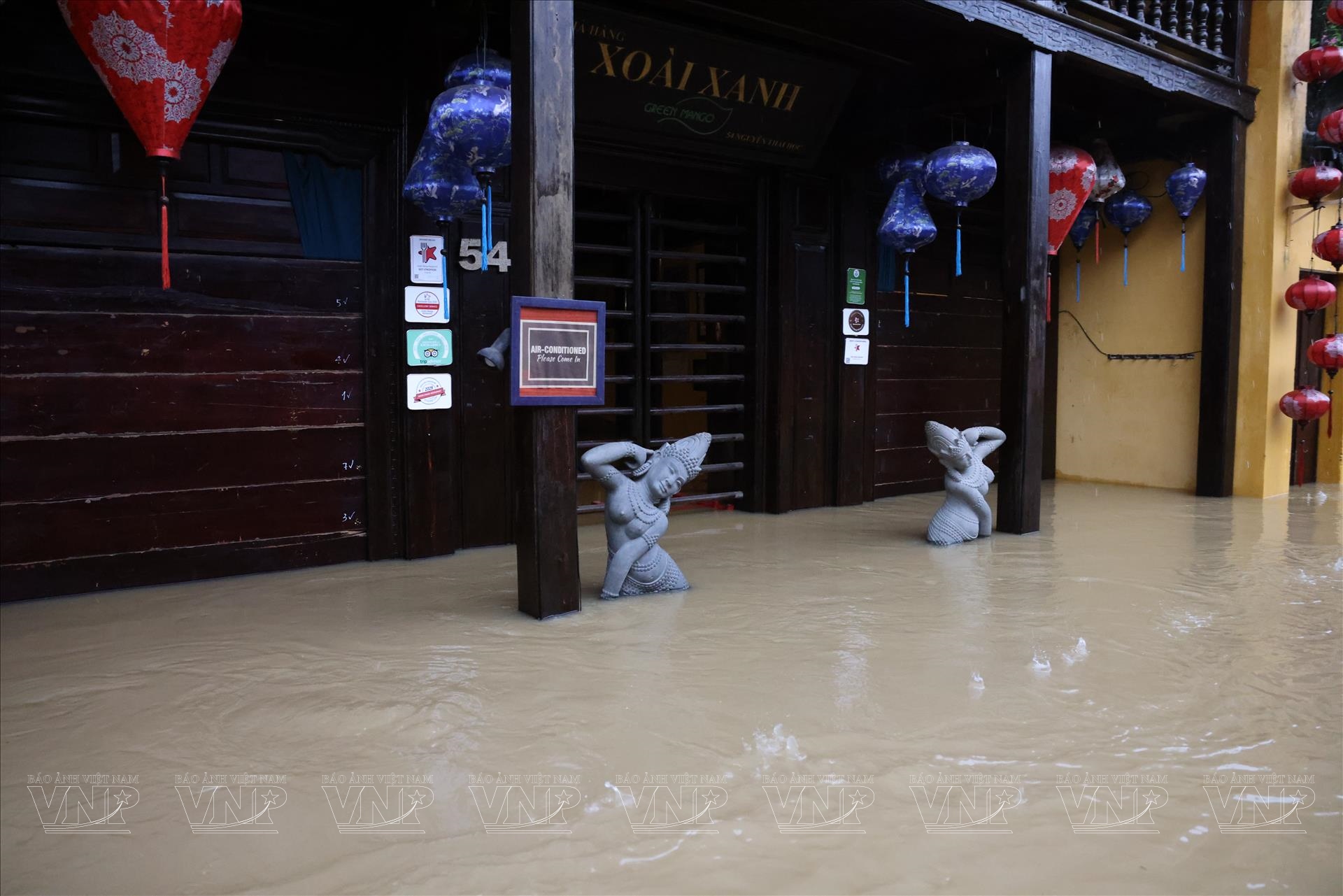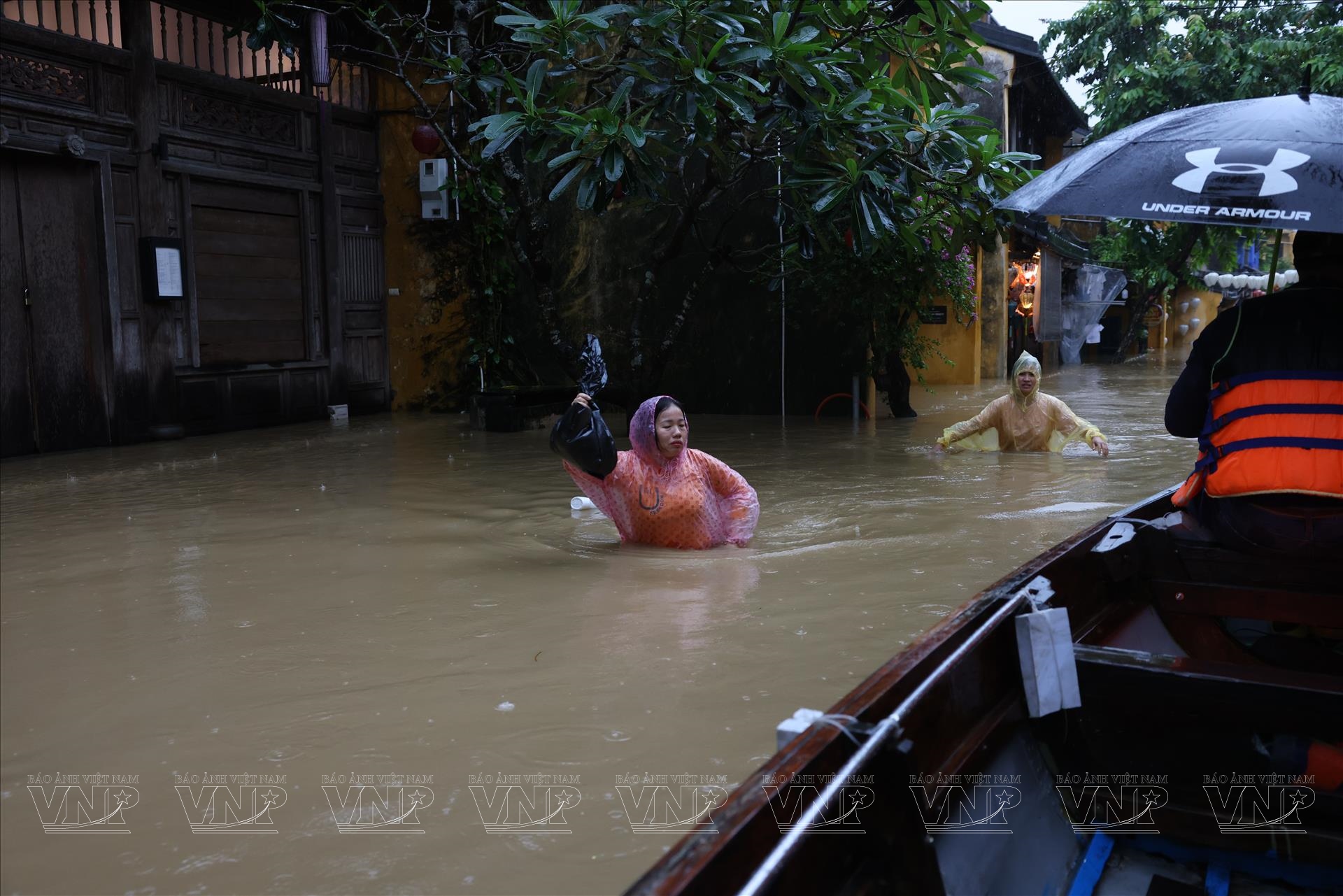 Chiều 26/10, tại phố cổ Hội An, nước từ sông Hoài dâng cao tràn lên đường Bạch Đằng, đến nữa đêm nước đã dâng cao hơn 1m khiến nhiều nhà cửa ven sông bị ngập nặng.