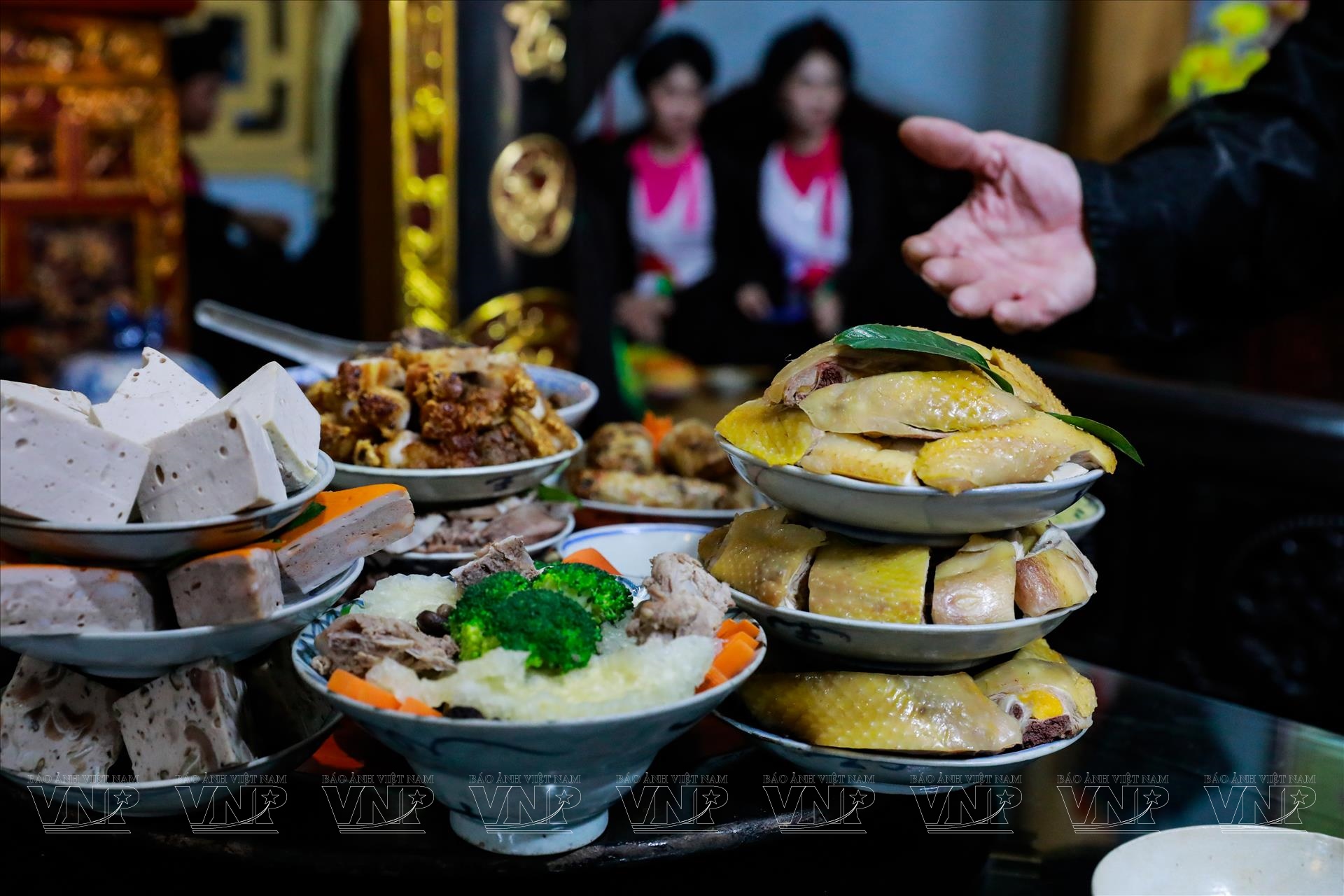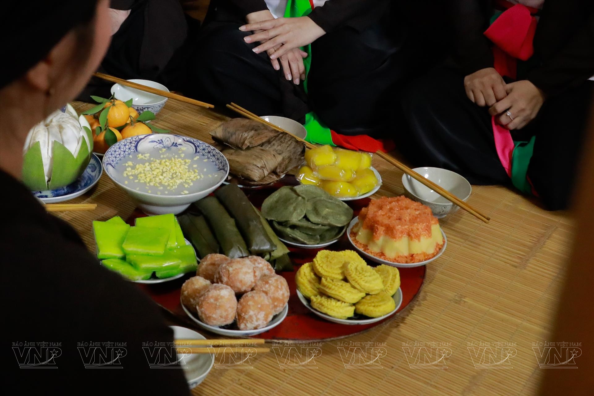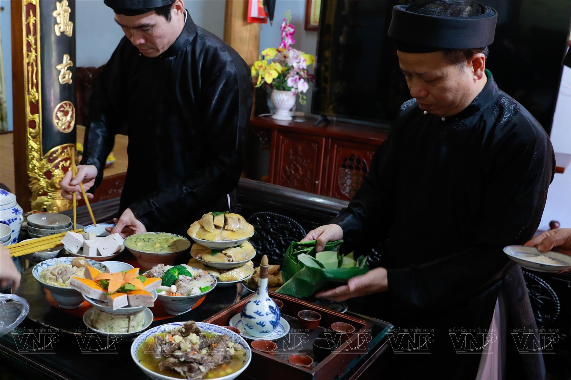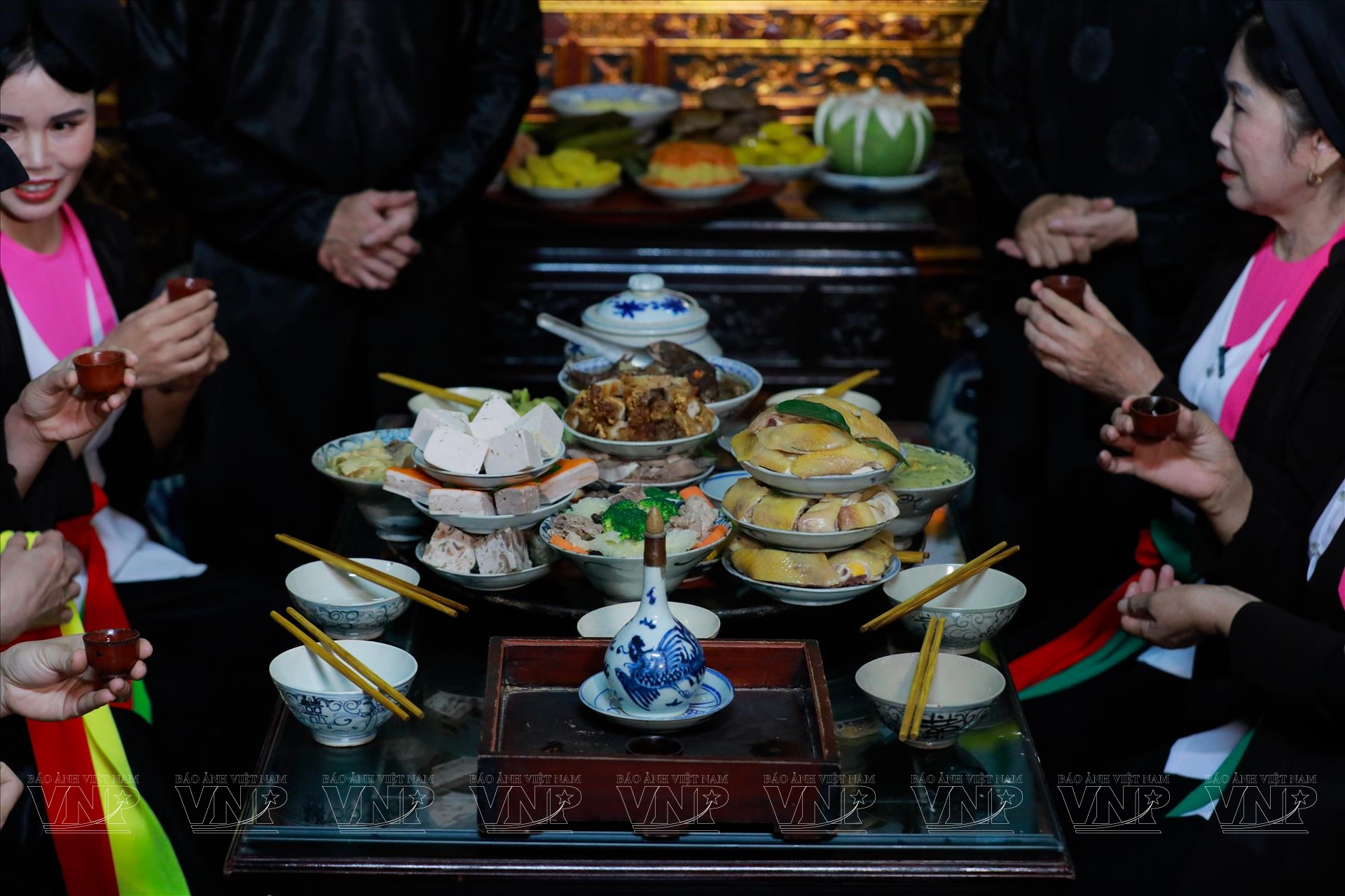 Mâm cơm Quan họ có thể bày một tầng hoặc ba tầng tùy điều kiện từng gia đình. Tuy nhiên, bốn món chính luôn phải có gồm thịt gà, giò - chả, chim bồ câu hầm và lưỡi lợn luộc. Ngoài ra, gia chủ có thể chuẩn bị thêm các món phụ như tim cật xào, cá hoặc thịt áp chảo, tùy mùa và điều kiện. Đáng chú ý là món cá thường được băm làm chả. Việc "giấu" nguyên liệu này giúp bạn hát không cảm thấy áp lực hay ái ngại nếu lần sau họ không có điều kiện chuẩn bị loại cá sang trọng tương tự để đáp lễ - một cách ứng xử đầy tinh tế của người Quan họ.