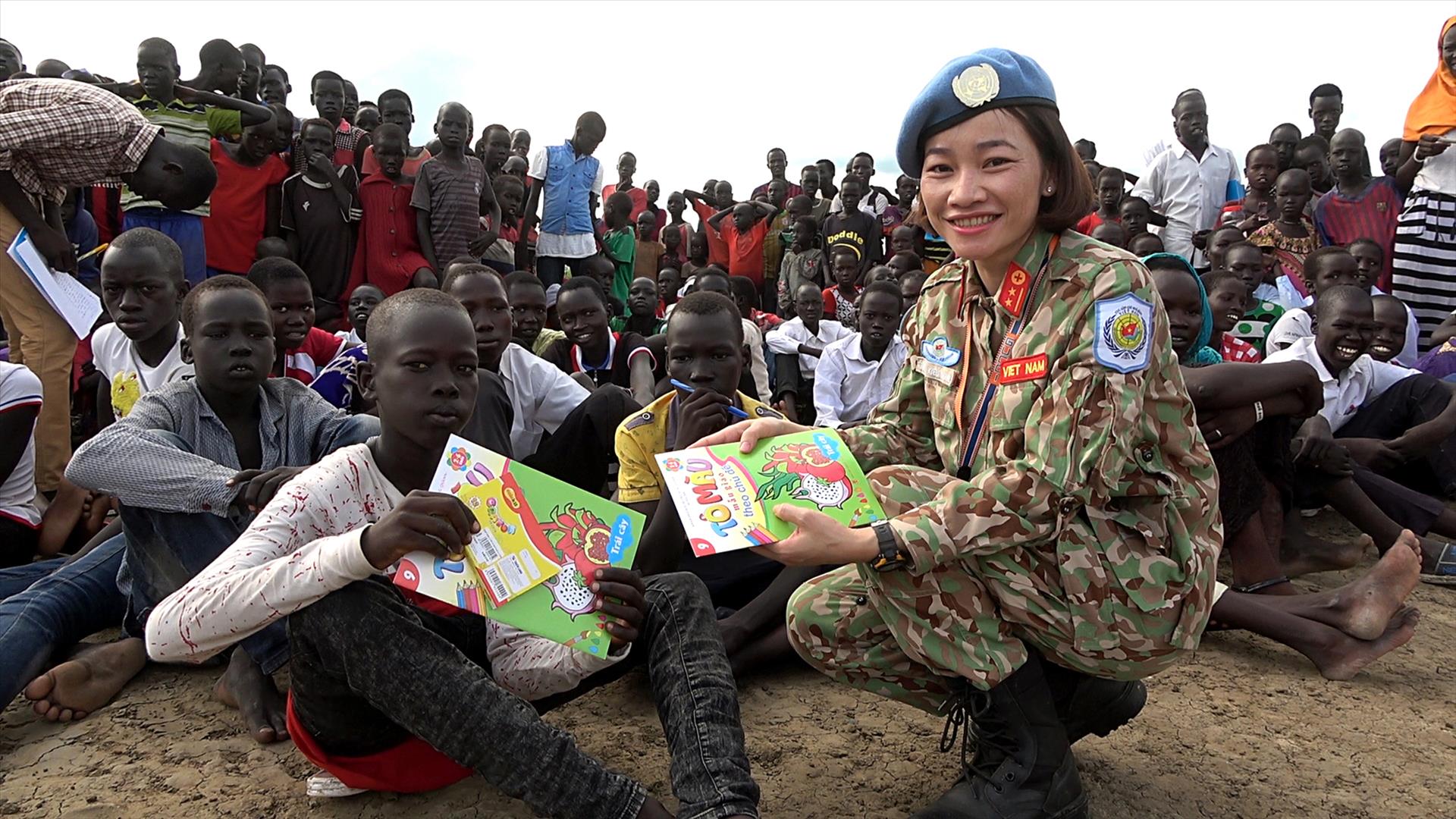 Tại một trường tiểu học trong khu vực trợ giúp dân thường của Liên hợp quốc, một lớp học đặc biệt được tổ chức dưới bóng cây giữa sân trường dành cho giáo viên, học sinh và cả các phụ huynh học sinh. Không bảng lớn, không thiết bị hiện đại - chỉ có những thân bồn bồn quen thuộc và sự tận tâm hướng dẫn của những Chiến sĩ Mũ nồi xanh Việt Nam.