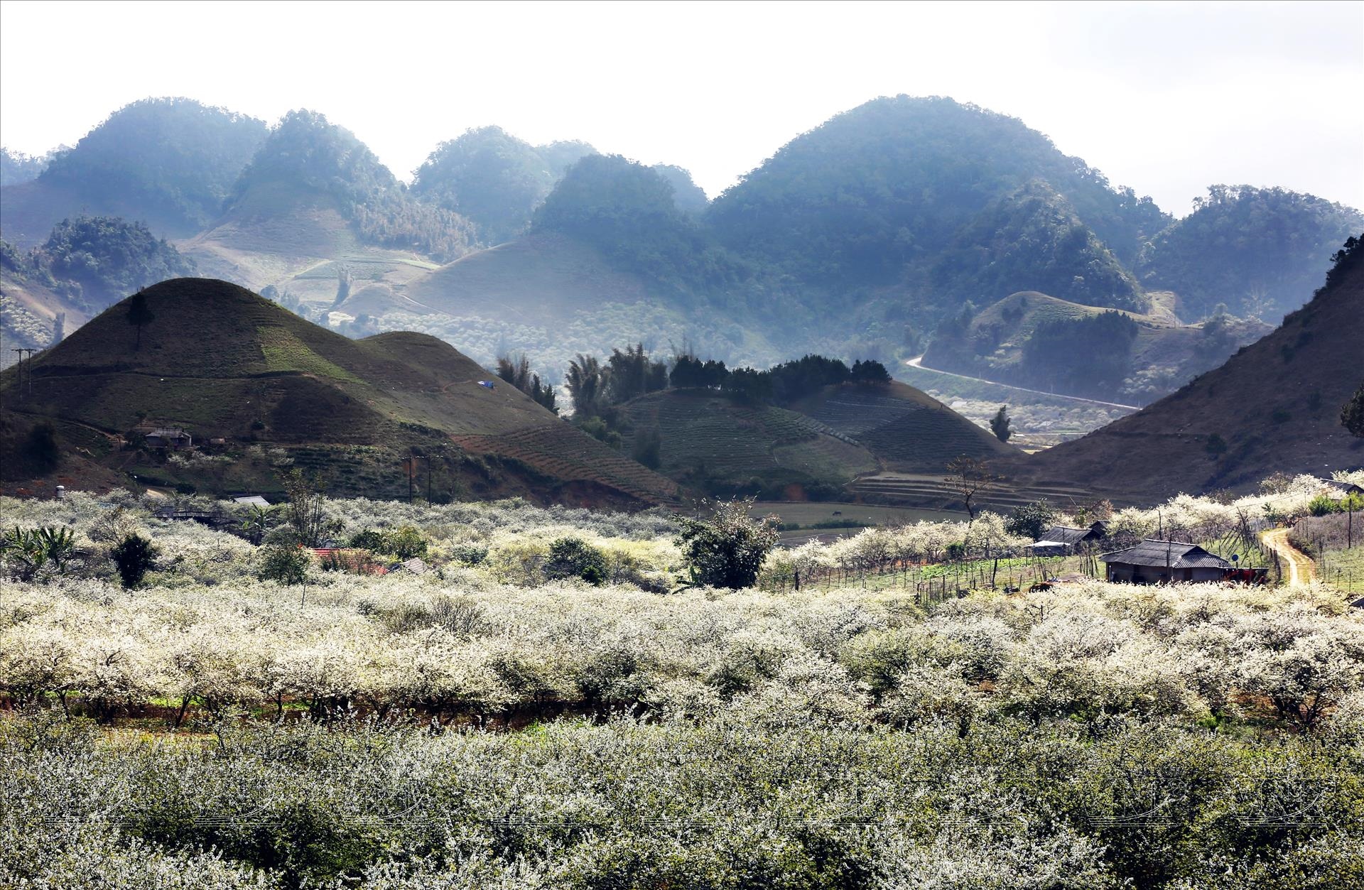 Mộc Châu mùa Xuân được ví như một “nàng thơ” dịu dàng, khoác lên mình những gam màu tinh khôi và rực rỡ nhất. Hoa mận trắng muốt bung nở khắp các sườn đồi, thung lũng, tựa như những đám mây bồng bềnh phủ kín đất trời. Xen lẫn vào đó là sắc hồng phớt dịu dàng của hoa đào rừng, tô điểm thêm cho khung cảnh thêm phần lãng mạn. Và không thể không nhắc đến những cánh đồng hoa cải trắng và vàng rực, trải dài tít tắp, tạo nên một bức tranh thiên nhiên hùng vĩ và thơ mộng.