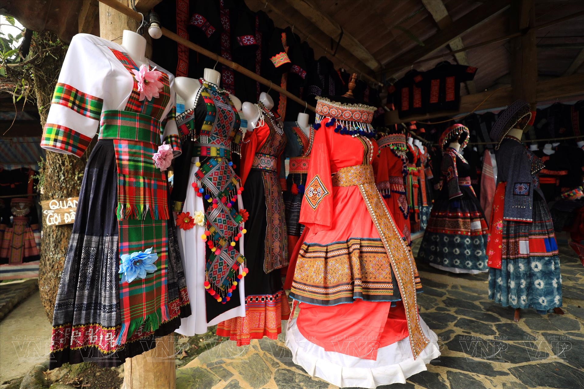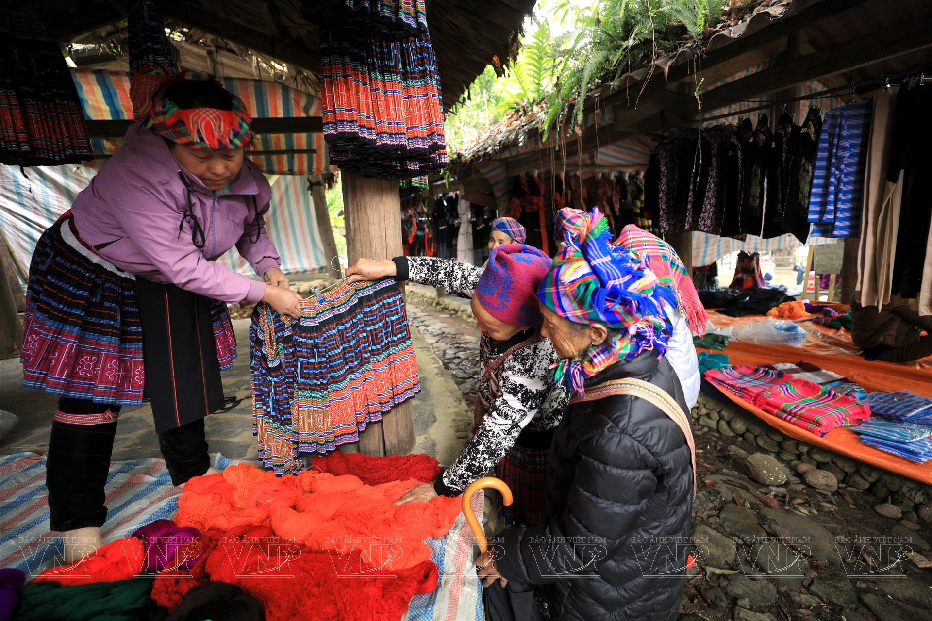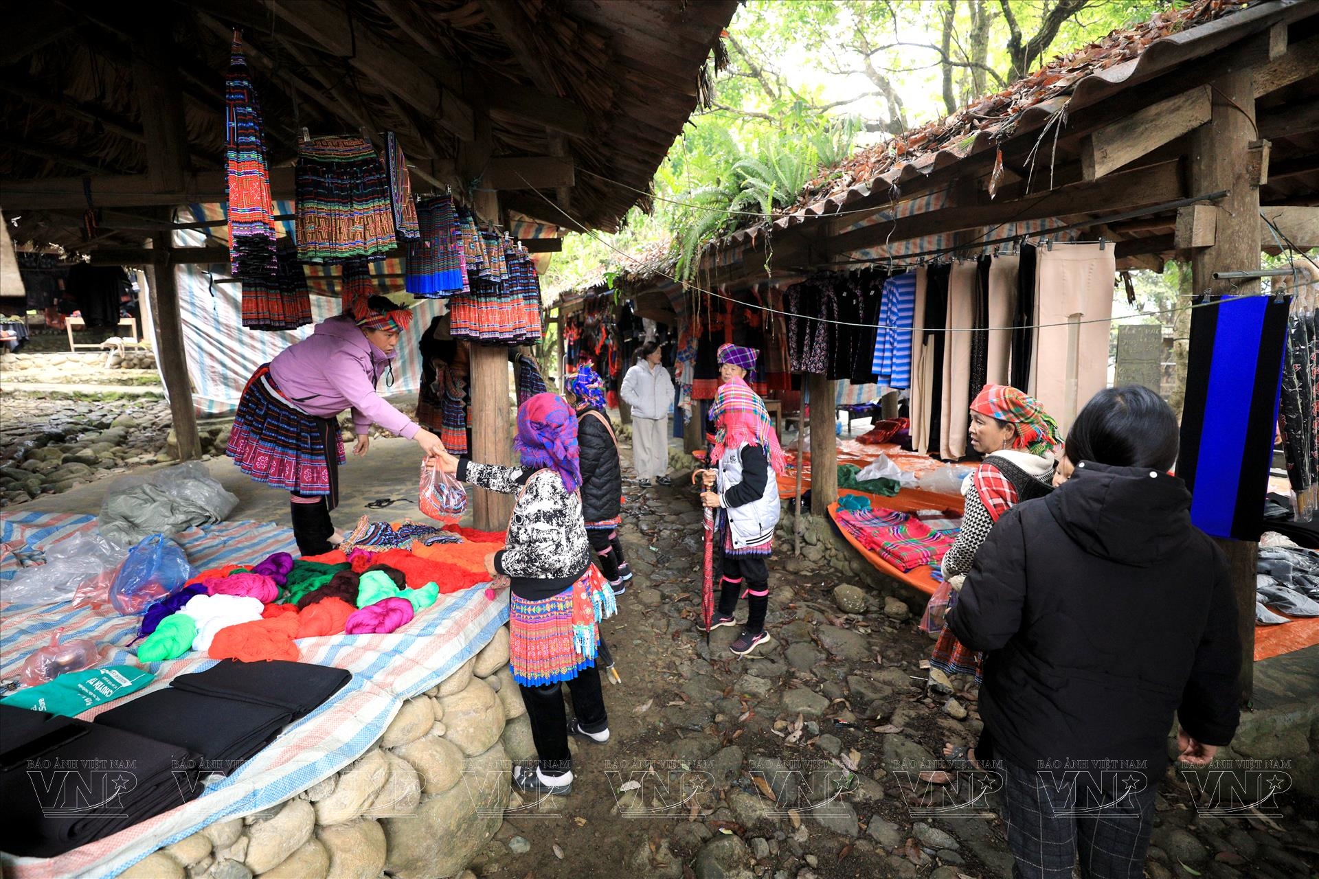 Không chỉ dừng lại ở nông sản, chợ còn là không gian trưng bày và trao đổi các sản phẩm thủ công truyền thống. Những chiếc váy thổ cẩm rực rỡ, tấm vải lanh nhuộm chàm, hay các vật dụng sinh hoạt như gùi, rổ… đều được làm thủ công tỉ mỉ, chứa đựng tinh hoa văn hóa được truyền qua nhiều thế hệ.