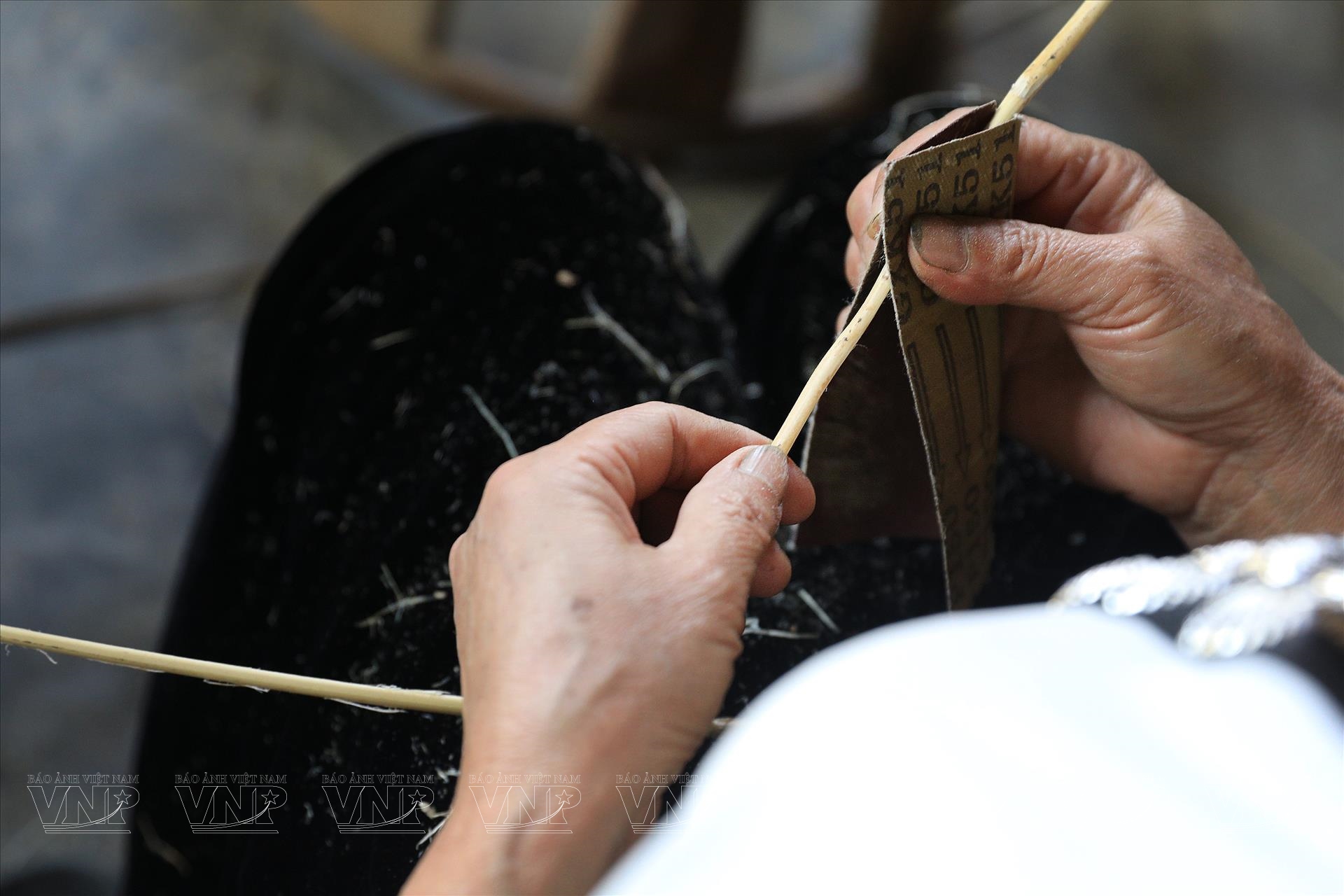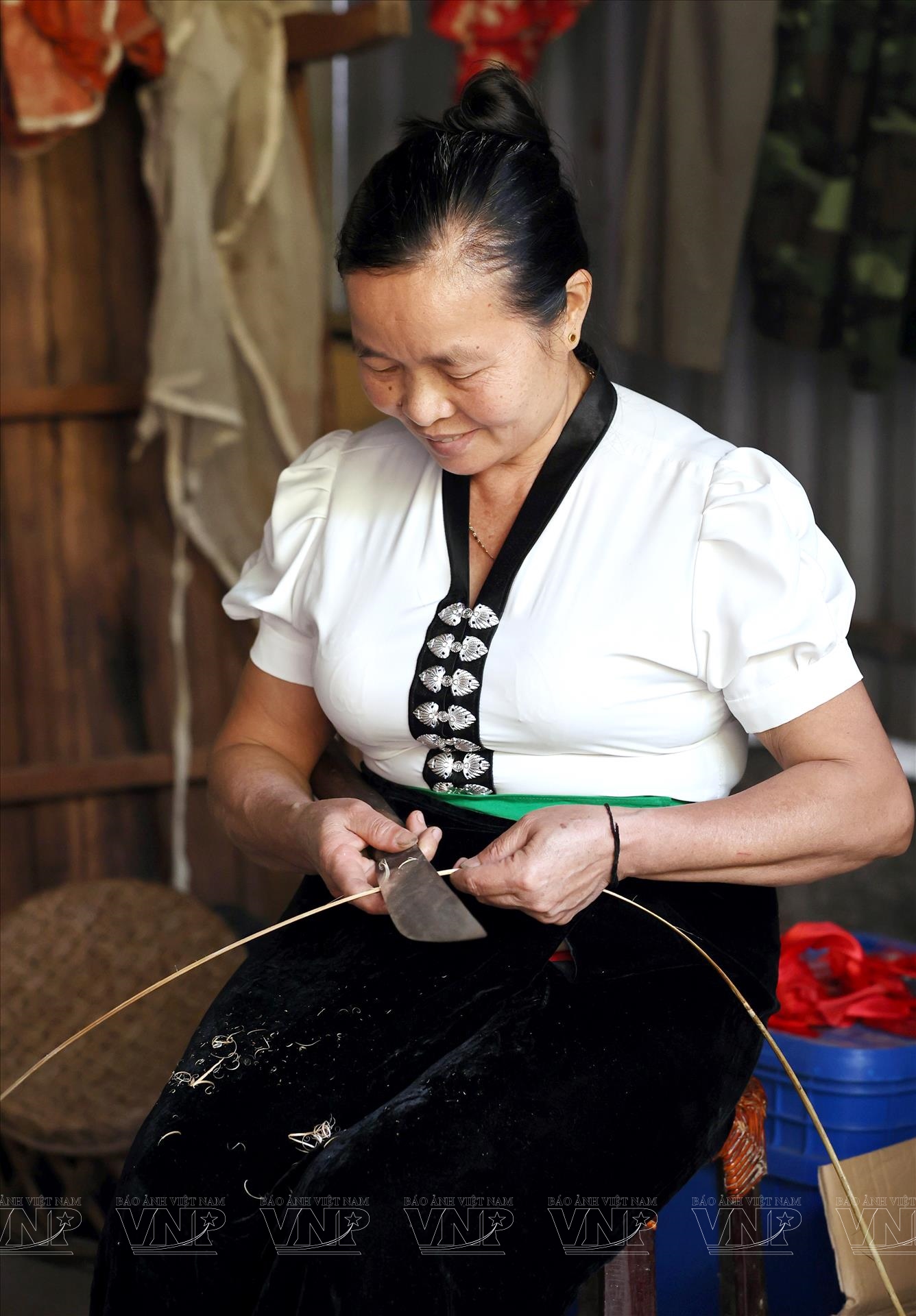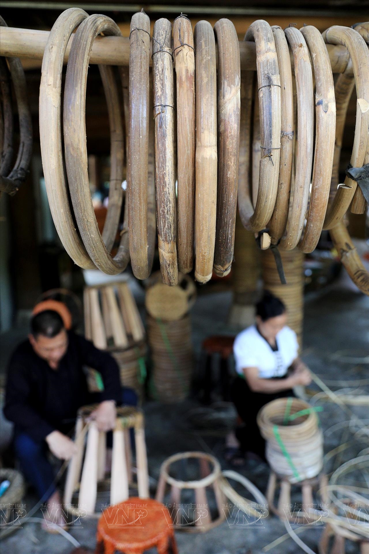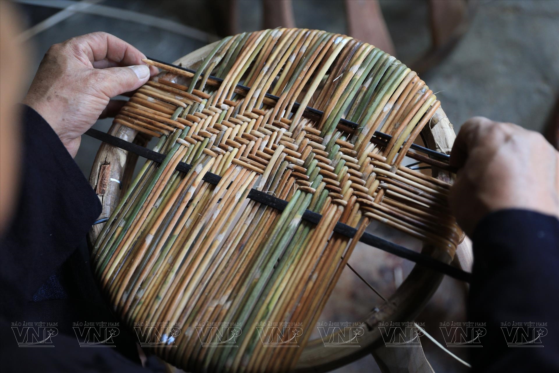 Một trong những công đoạn quan trọng là vót nan mây thường do phụ nữ đảm nhiệm. Bà Điêu Thị Xương cho biết, mây được vót mịn theo chiều dọc, sau đó bó lại và treo trên gác bếp từ 6 tháng trở lên. Chính quá trình này giúp nan mây có màu vàng óng tự nhiên và tăng độ bền; thời gian treo bếp càng lâu, nan càng đẹp và chắc.