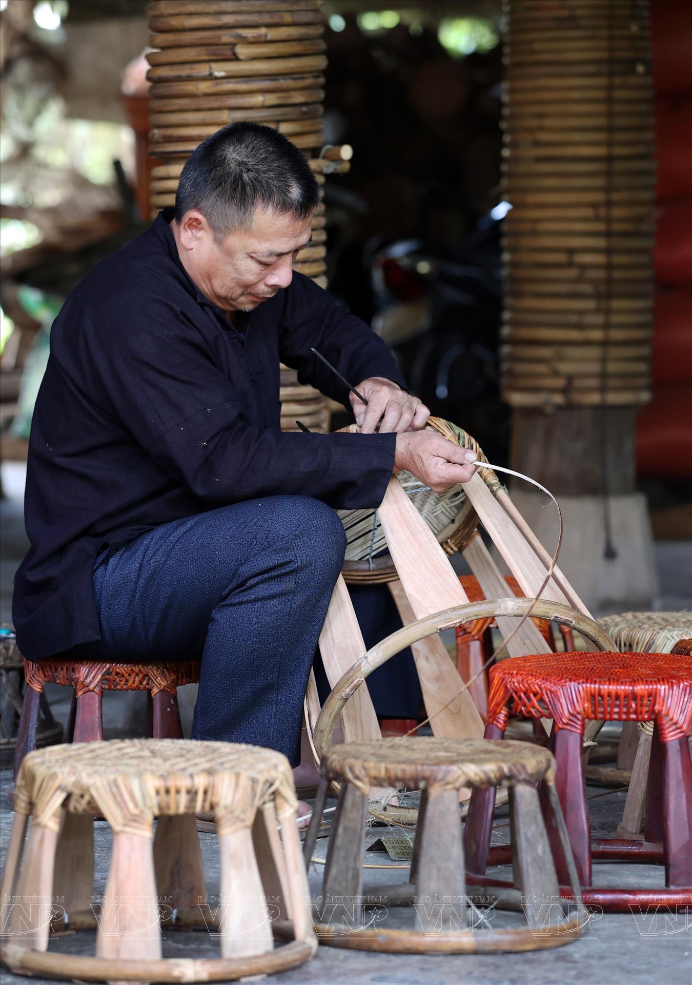 Khi khung ghế đã hoàn thiện, người thợ bắt đầu công đoạn đan. Một vòng mây nhỏ được đặt dưới mặt ghế, sau đó các nan mây được đan theo hình mạng nhện để cố định toàn bộ khung. Tiếp đó, nghệ nhân tiếp tục đan hoàn thiện mặt ghế bằng kỹ thuật đan nong đôi cho đến khi phủ kín bề mặt.