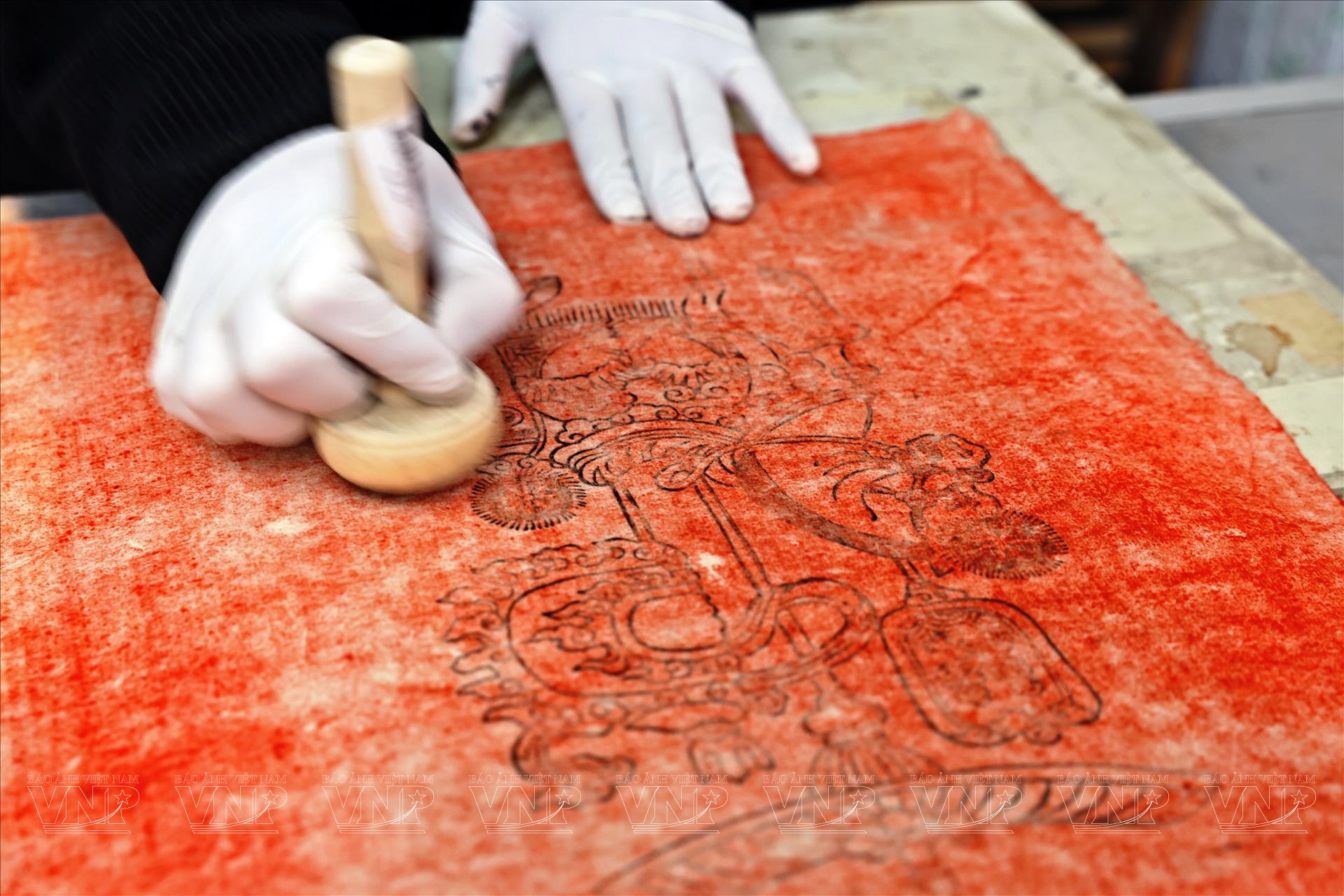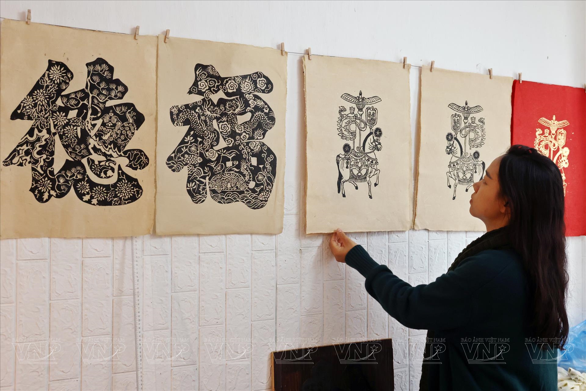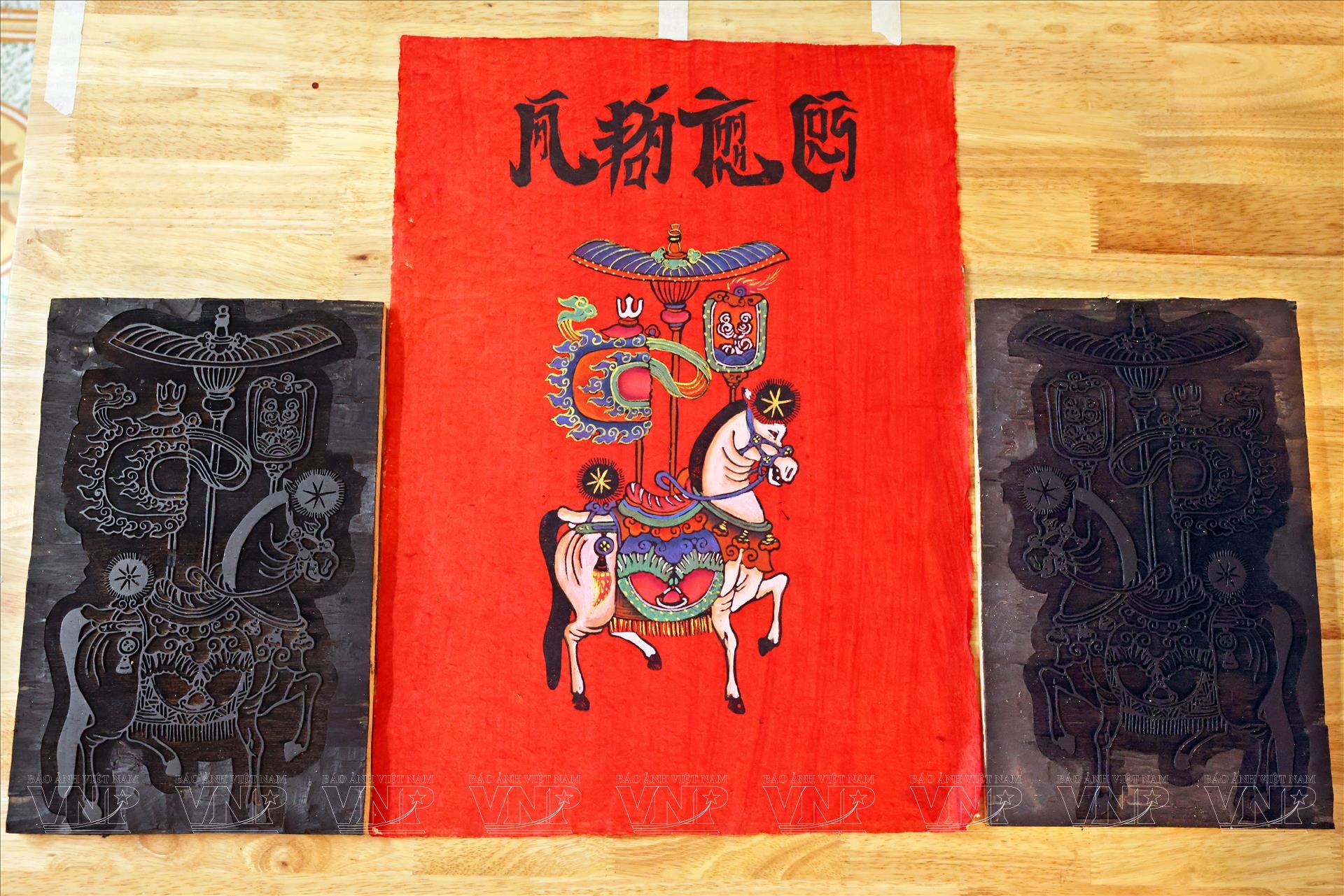 Quá trình tạo ra một bức tranh ngựa Kim Hoàng không đơn giản là vẽ một hình con ngựa lên giấy. Đó là chuỗi công đoạn đòi hỏi sự tỉ mỉ, hiểu nghề và kiên nhẫn, bởi mỗi tác phẩm là sự kết hợp giữa kỹ thuật in mộc bản truyền thống và vẽ tay thủ công để hoàn thiện. Bước đầu tiên là in tranh từ mộc bản. Trên những tấm ván gỗ được khắc tinh xảo, họa sĩ quét mực, đặt giấy lên và ép đều để các đường nét hiện ra. Từ đó, hình dáng ngựa với dáng đứng hiên ngang, mạnh mẽ dần xuất hiện trên nền giấy đỏ hoặc giấy màu đặc trưng của tranh Kim Hoàng.