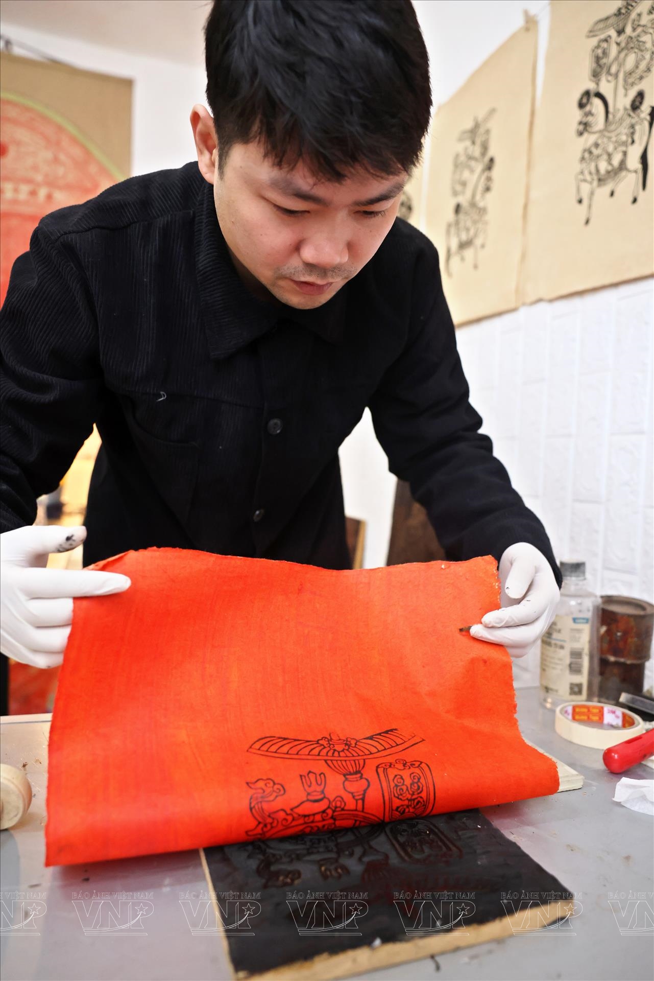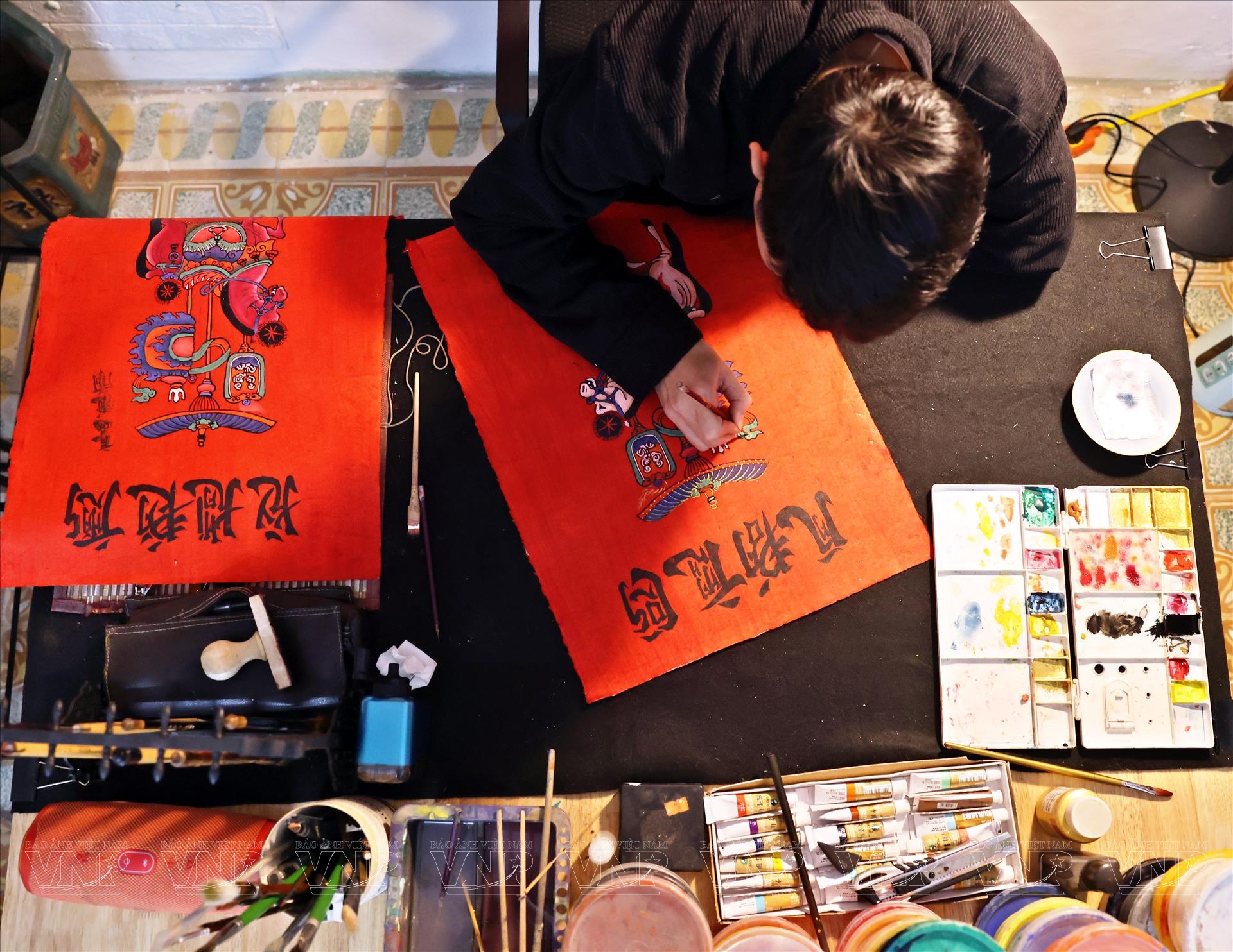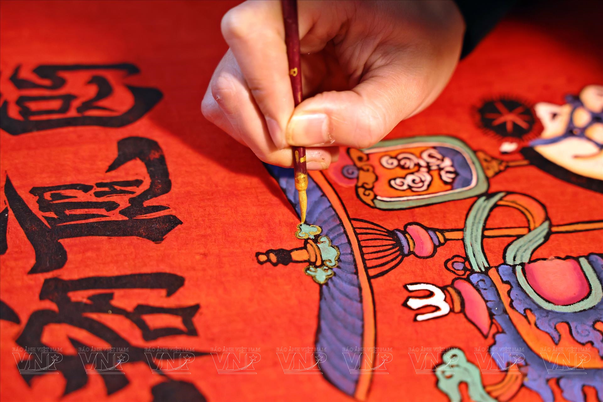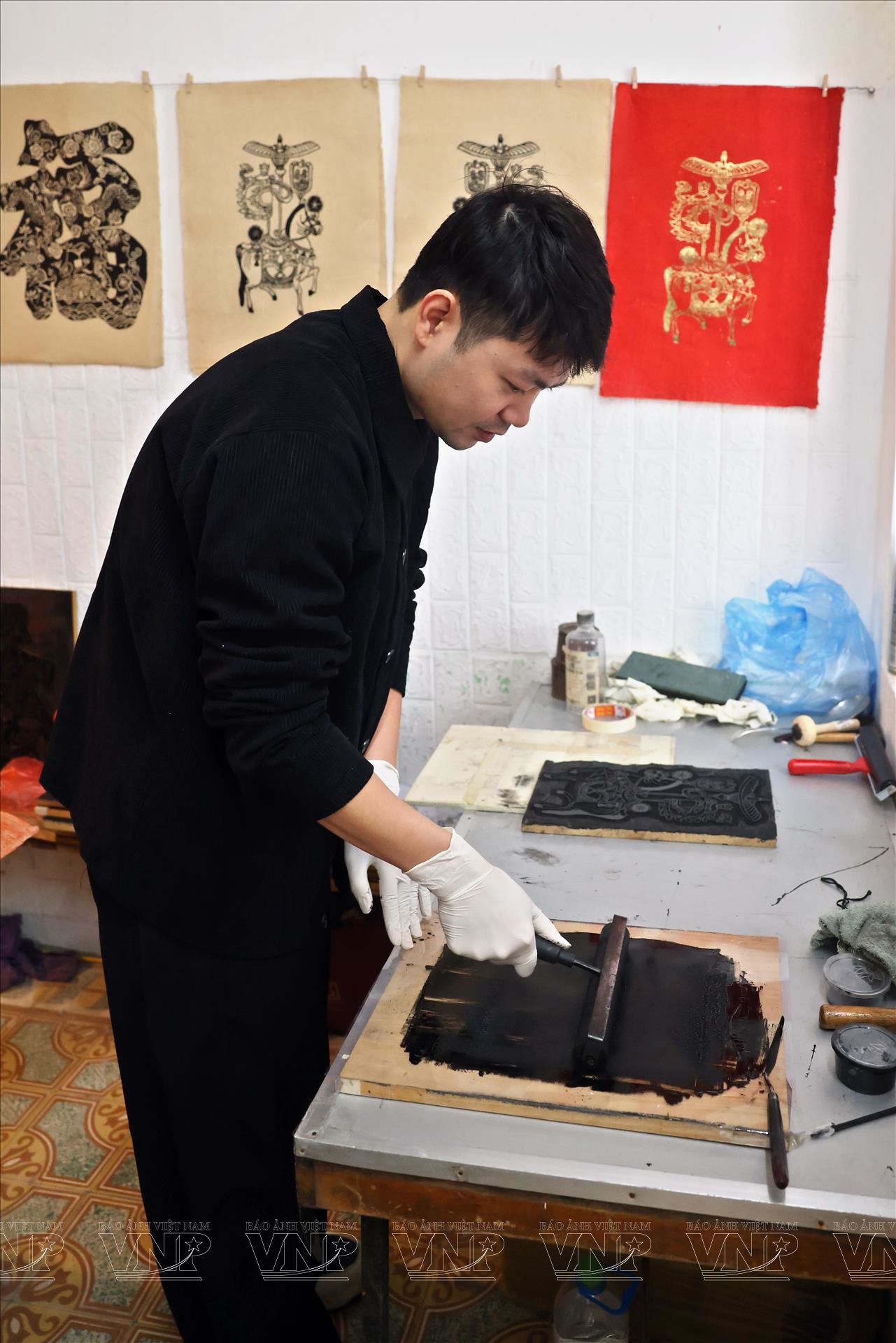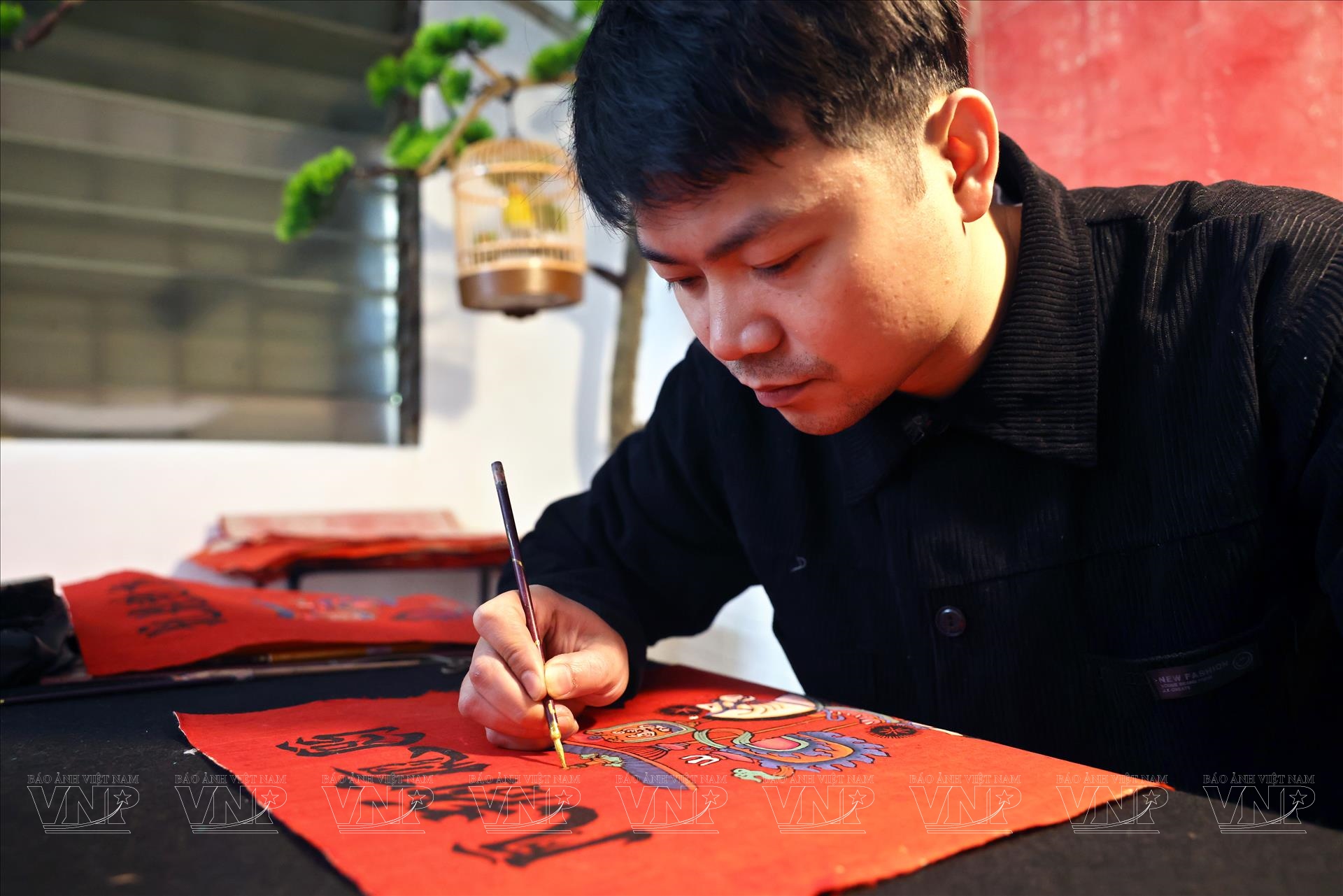 Tiếp đó là công đoạn vẽ lại các nét của tranh. Dù đã có bản in từ mộc bản, nhưng để bức tranh có hồn, người nghệ sĩ vẫn phải dùng bút vẽ tay, chỉnh sửa và nhấn nhá từng đường nét. Đây là lúc tài năng và cảm xúc cá nhân của họa sĩ thể hiện rõ nhất. Trần Quốc Đức khéo léo giữ nguyên tinh thần tạo hình truyền thống của tranh Kim Hoàng, đồng thời thổi vào đó một nhịp thở mới: đường nét mềm mại hơn, bố cục hài hòa hơn, màu sắc được tiết chế nhưng vẫn rực rỡ, mang không khí Tết.