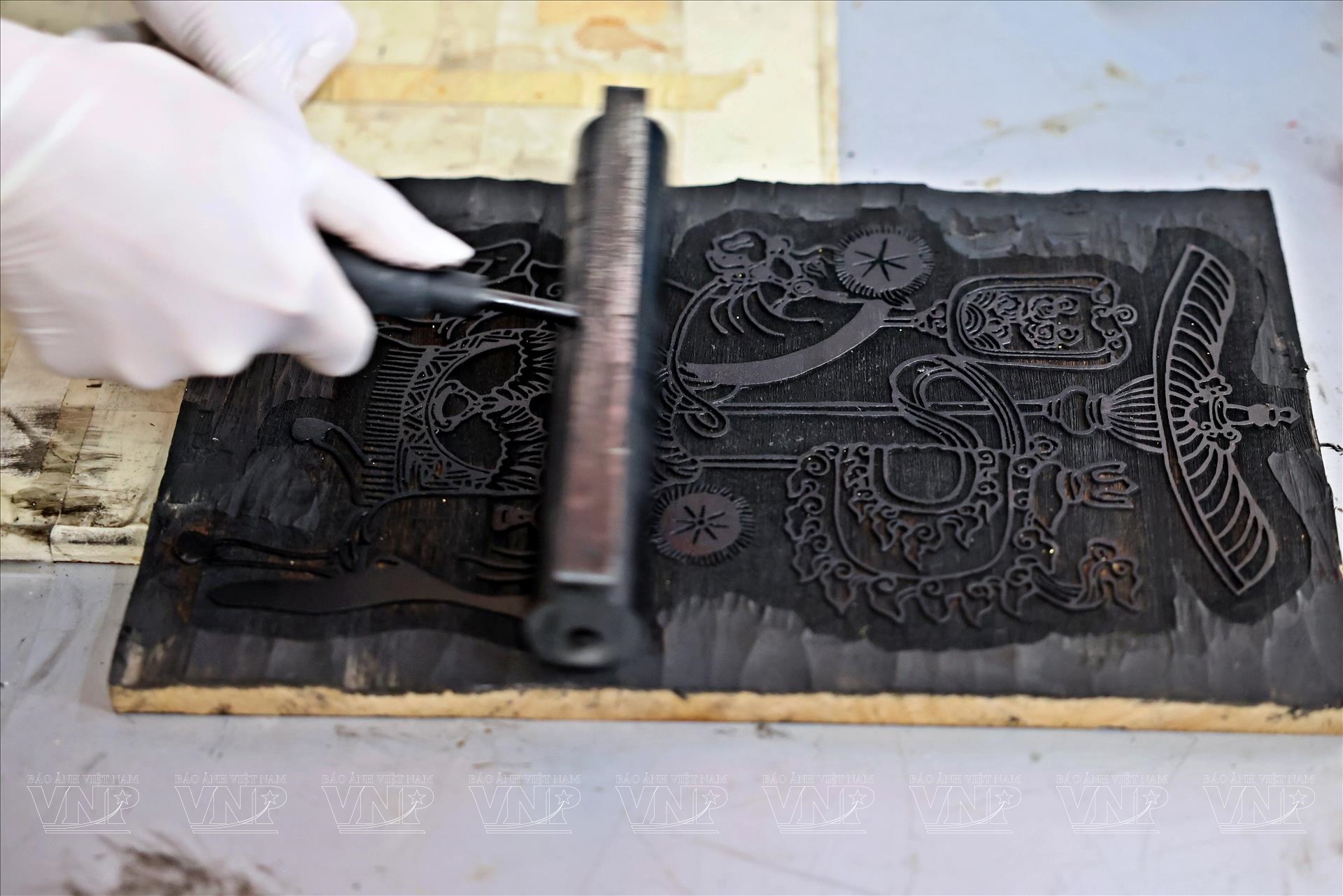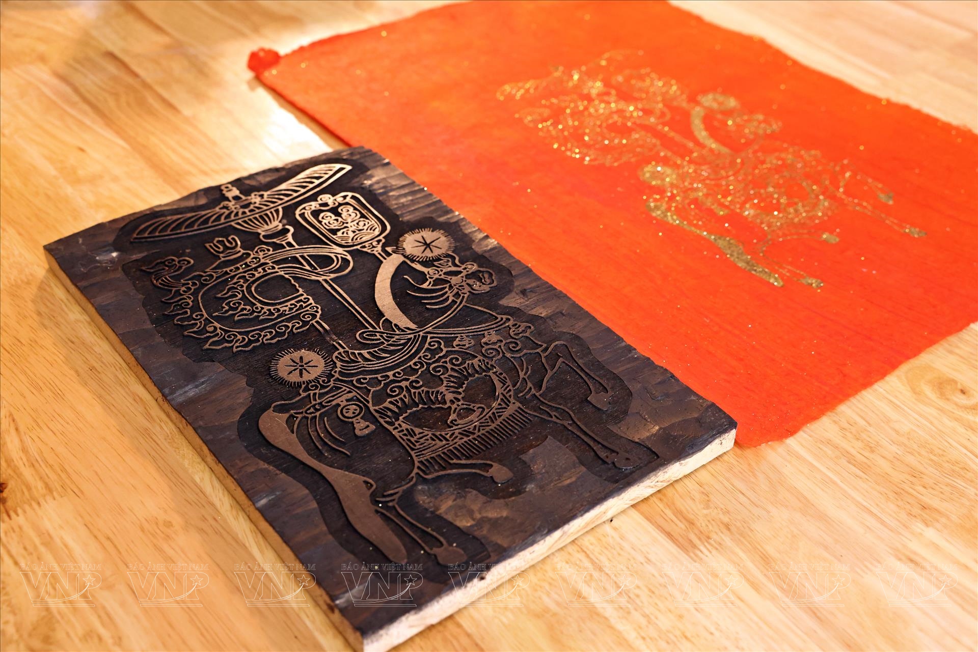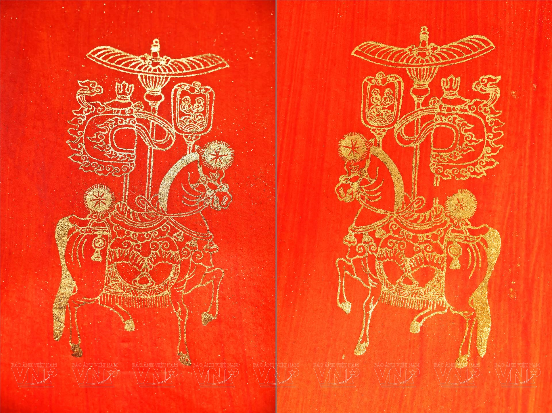 Sau khi có bản in, họa sĩ chuyển sang công đoạn quan trọng: dát vàng lên tranh. Lá vàng mỏng được đặt cẩn thận lên từng mảng nền hoặc chi tiết trang trí, tạo nên điểm nhấn lấp lánh, vừa sang trọng vừa gợi cảm giác linh thiêng. Dưới ánh sáng, lớp vàng ánh lên, khiến hình tượng ngựa trong tranh trở nên nổi bật, mang dáng vẻ như một linh vật chở theo may mắn và tài lộc đầu năm.