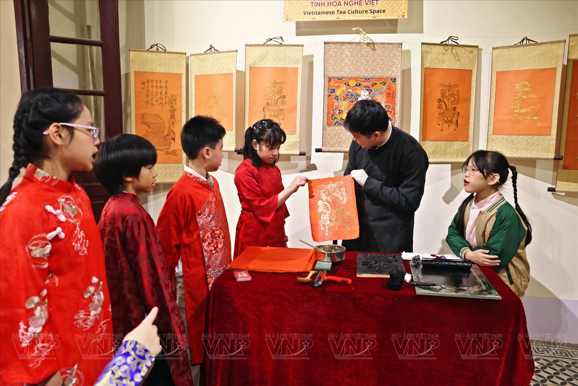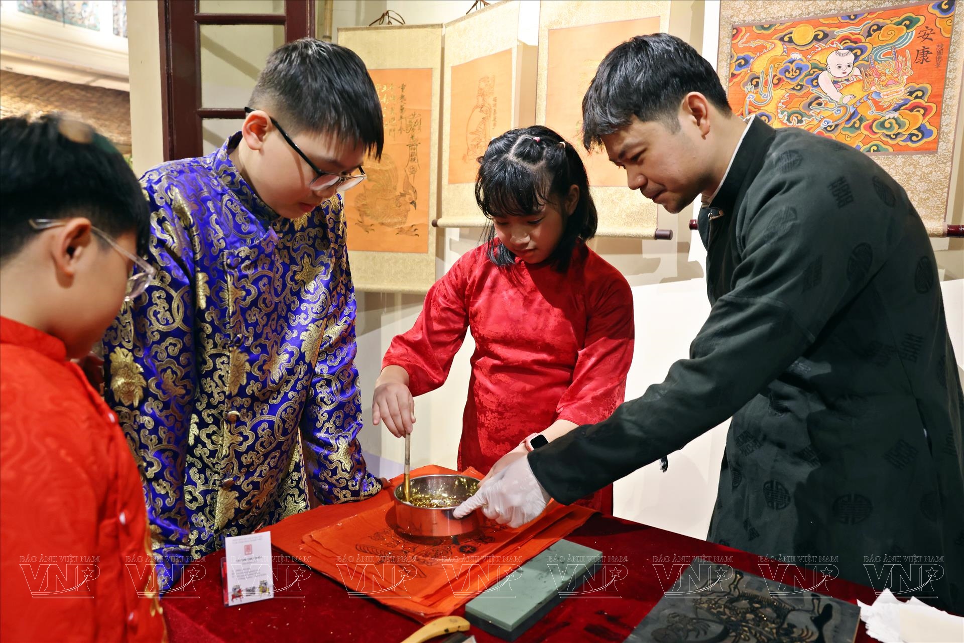 Điều đáng chú ý là, bên cạnh việc sáng tác và trưng bày, họa sĩ Trần Quốc Đức còn tổ chức các hoạt động trải nghiệm để trẻ em trực tiếp tham gia làm tranh Kim Hoàng. Trong không gian nghệ thuật tại 22 Hàng Buồm, các em nhỏ được hướng dẫn in tranh từ mộc bản, tô màu, tập đi nét và quan sát công đoạn dát vàng. Những đôi tay nhỏ háo hức chạm vào giấy đỏ, mực in, bút vẽ… tạo nên một bức tranh sinh động về hành trình di sản được truyền lại qua thế hệ.