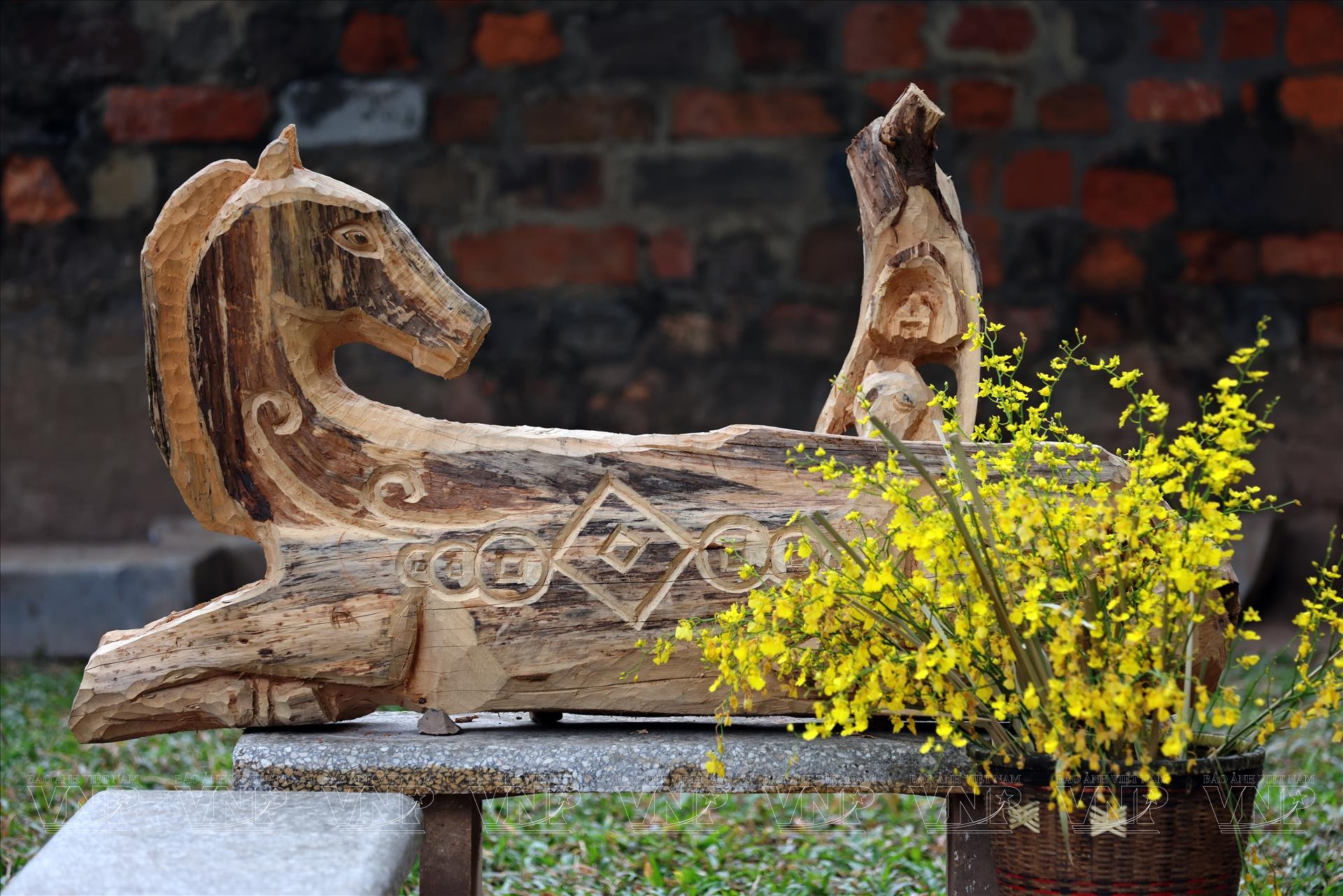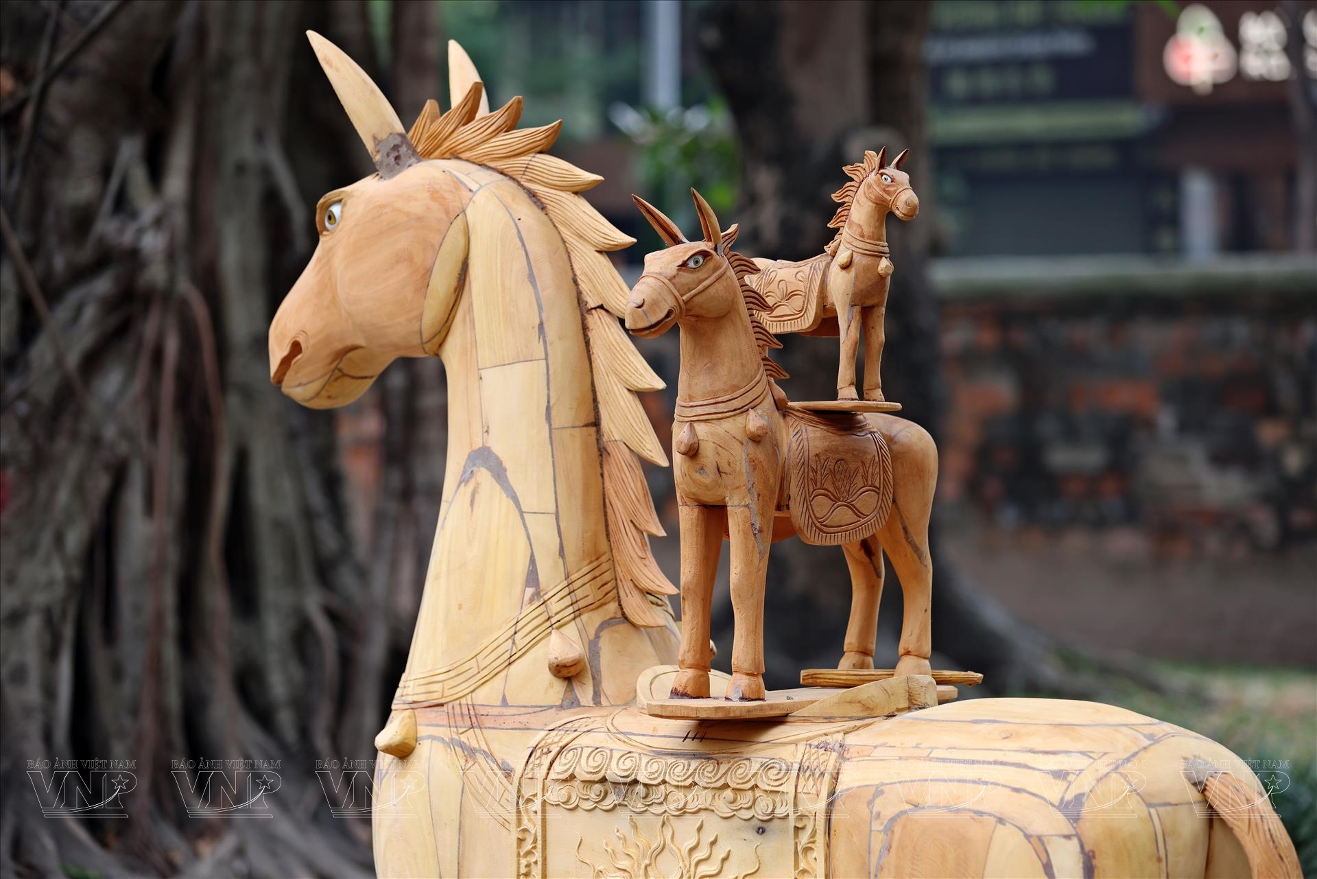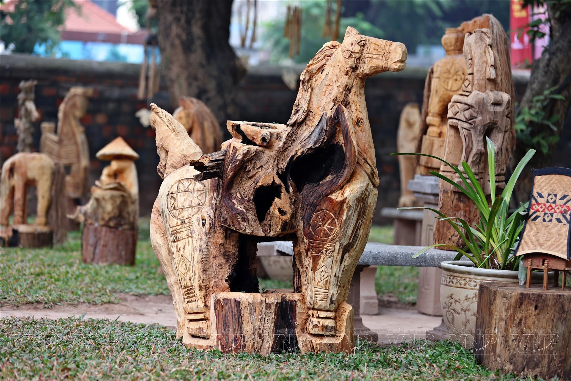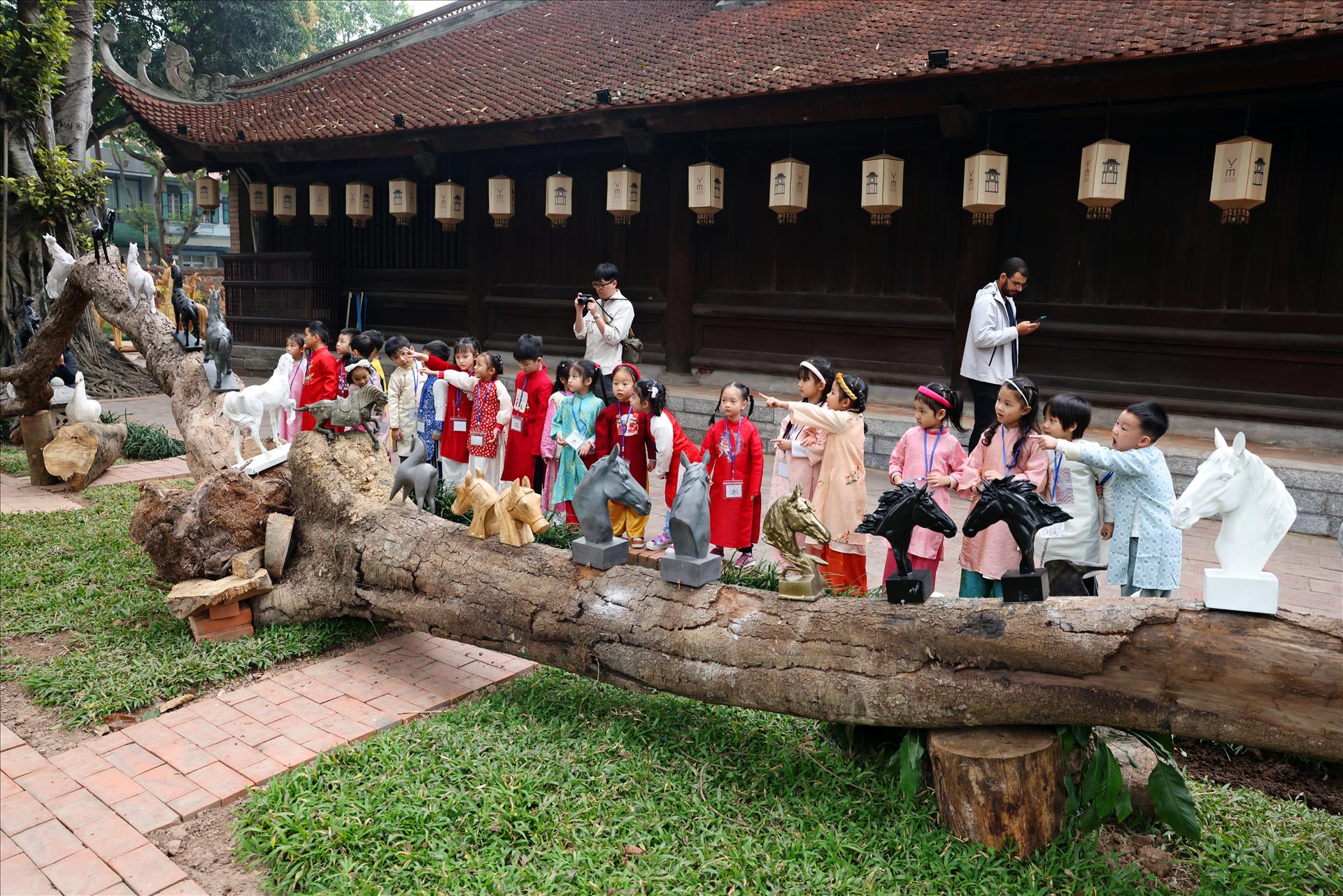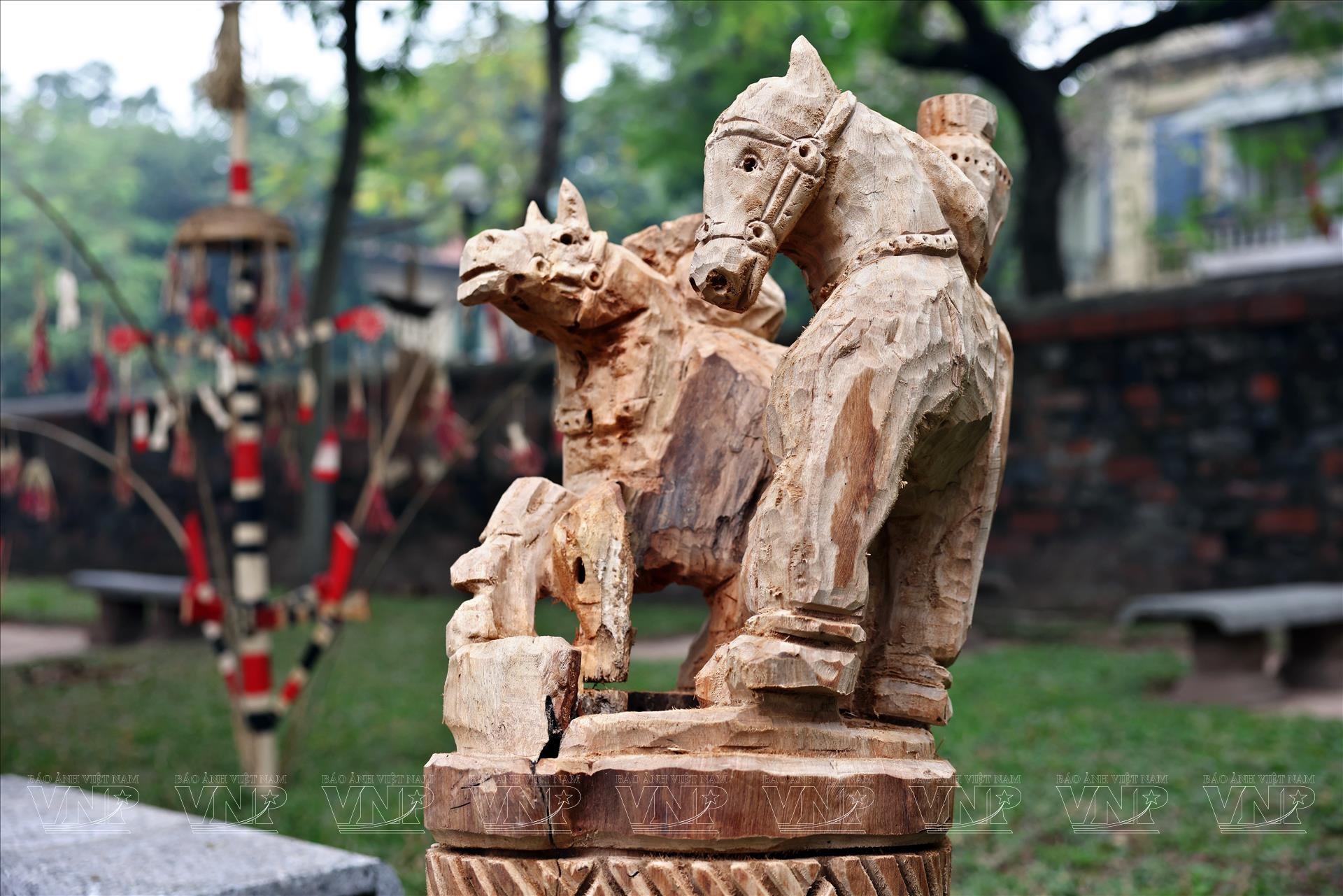 Những tác phẩm tượng ngựa nổi bật giữa mái ngói rêu phong của di tích ngàn năm. Ảnh: Công Đạt/Báo ảnh Việt Nam
