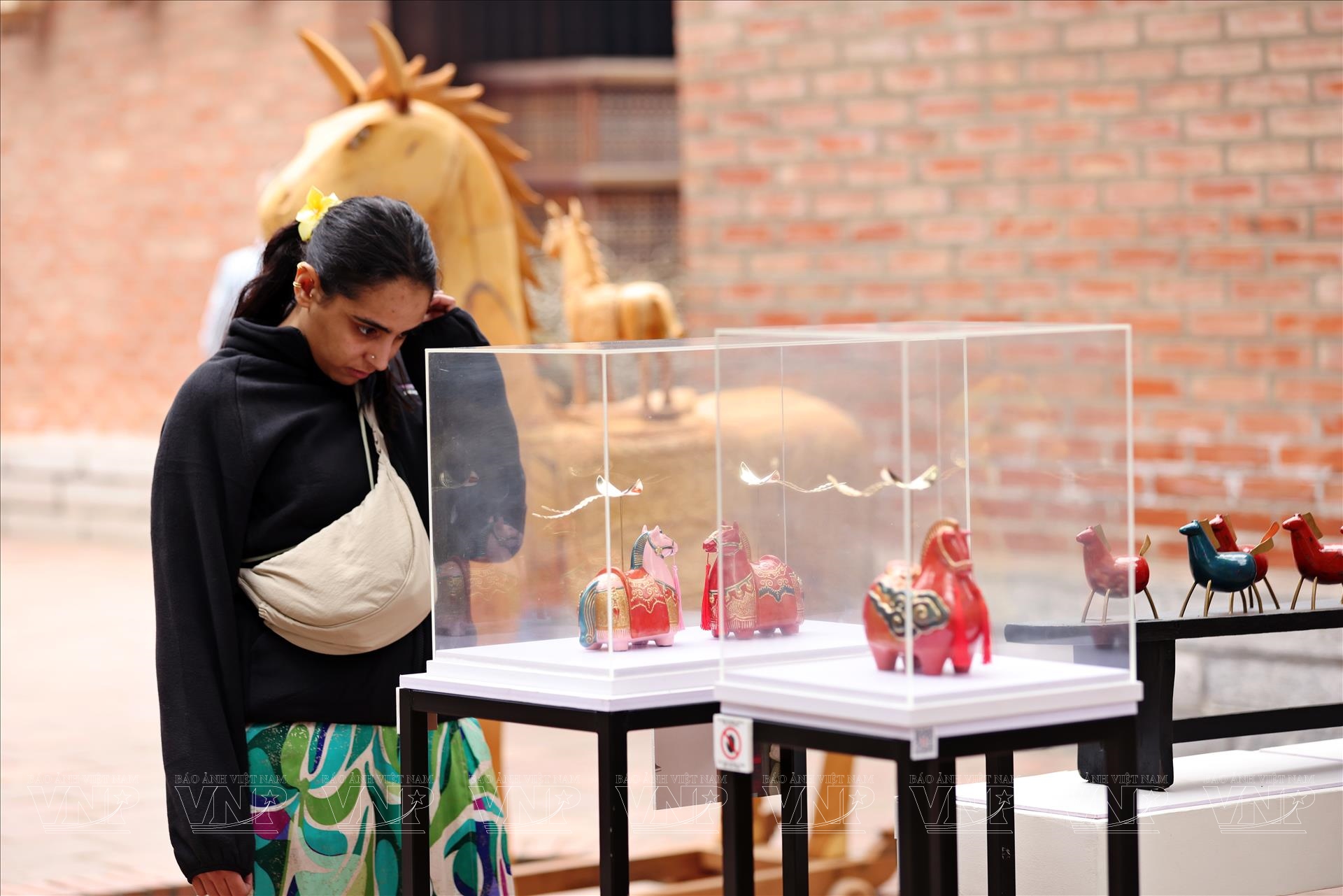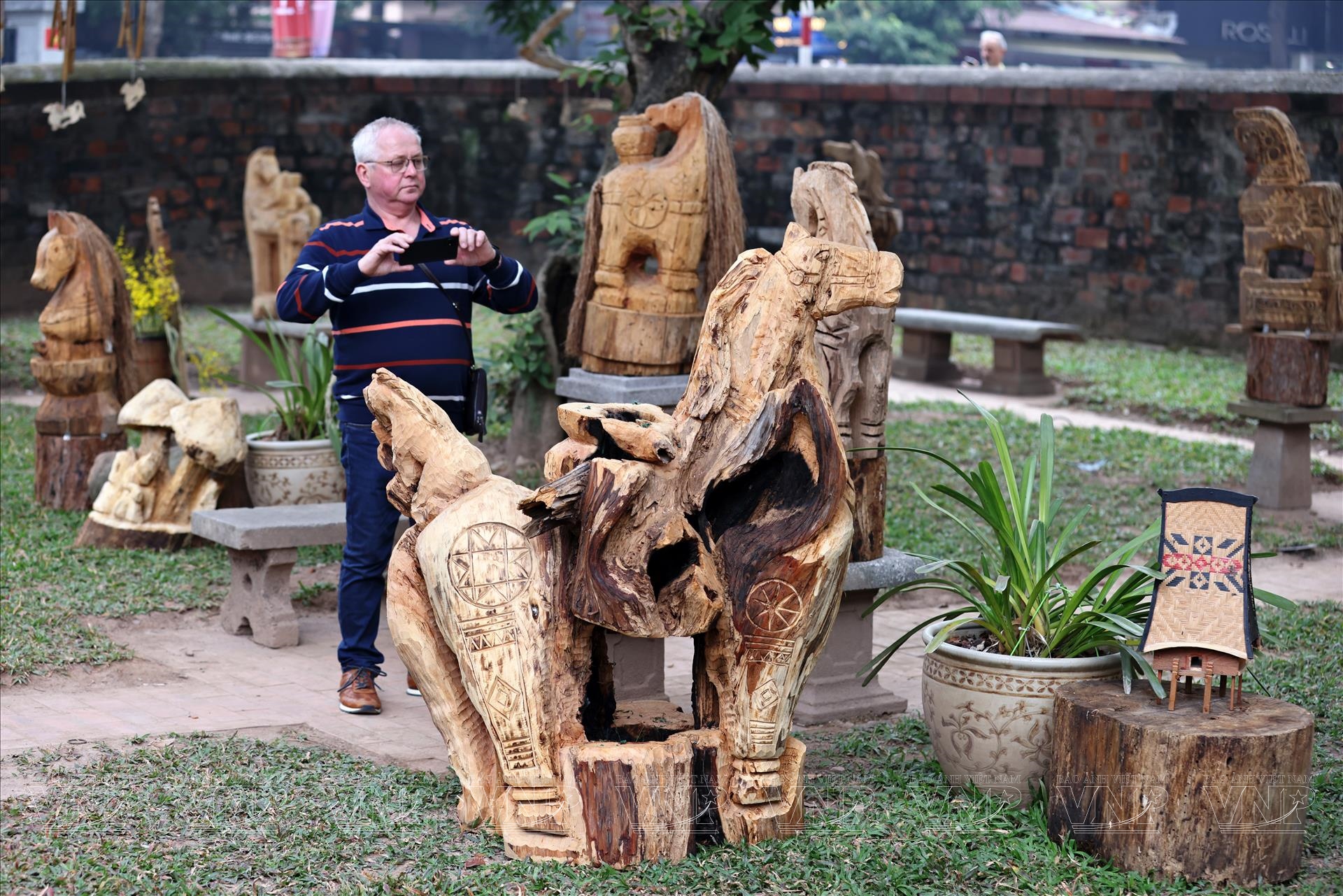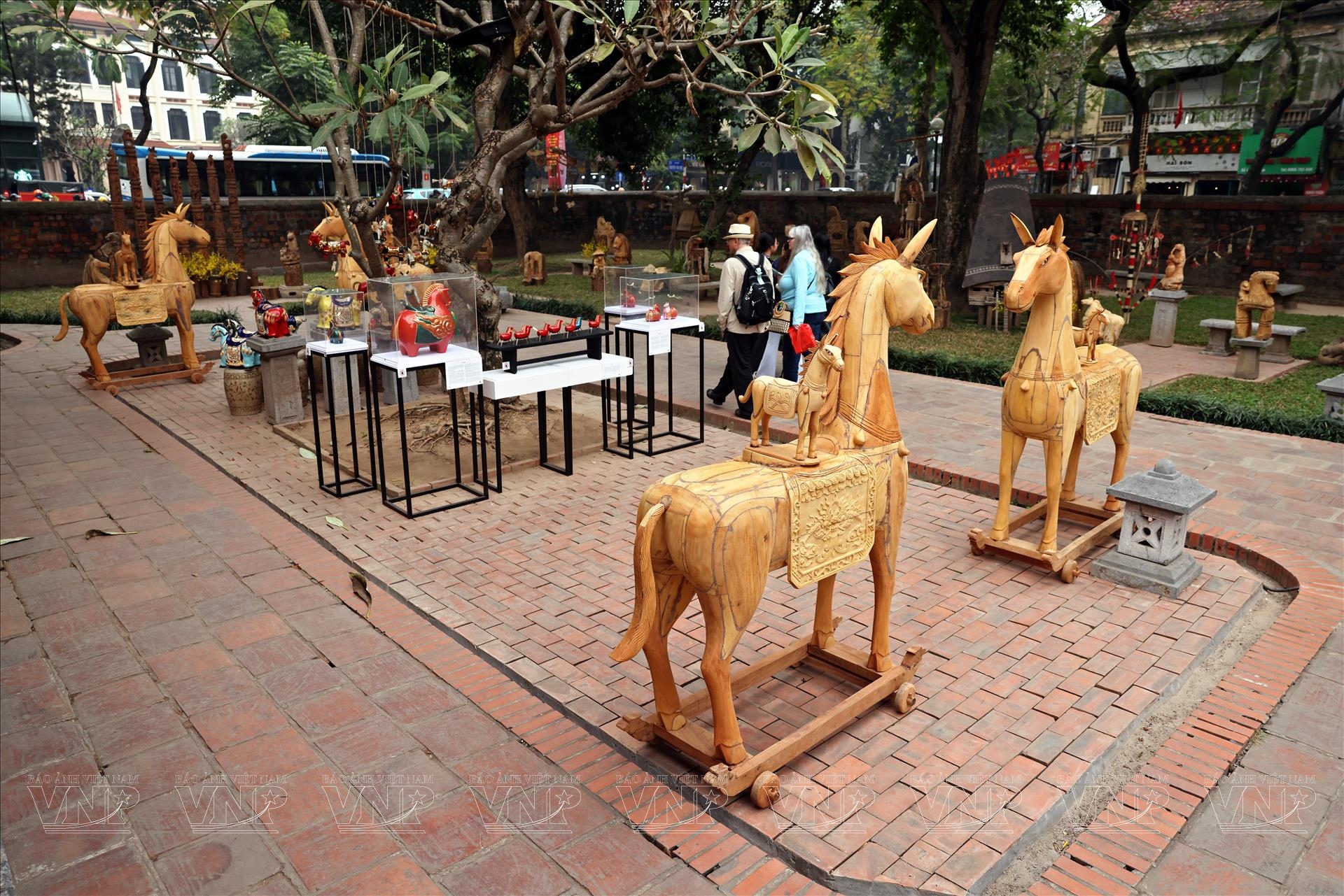 Du khách nước ngoài chiêm ngưỡng tượng ngựa gỗ tại Văn Miếu. Ảnh: Công Đạt/Báo ảnh Việt Nam