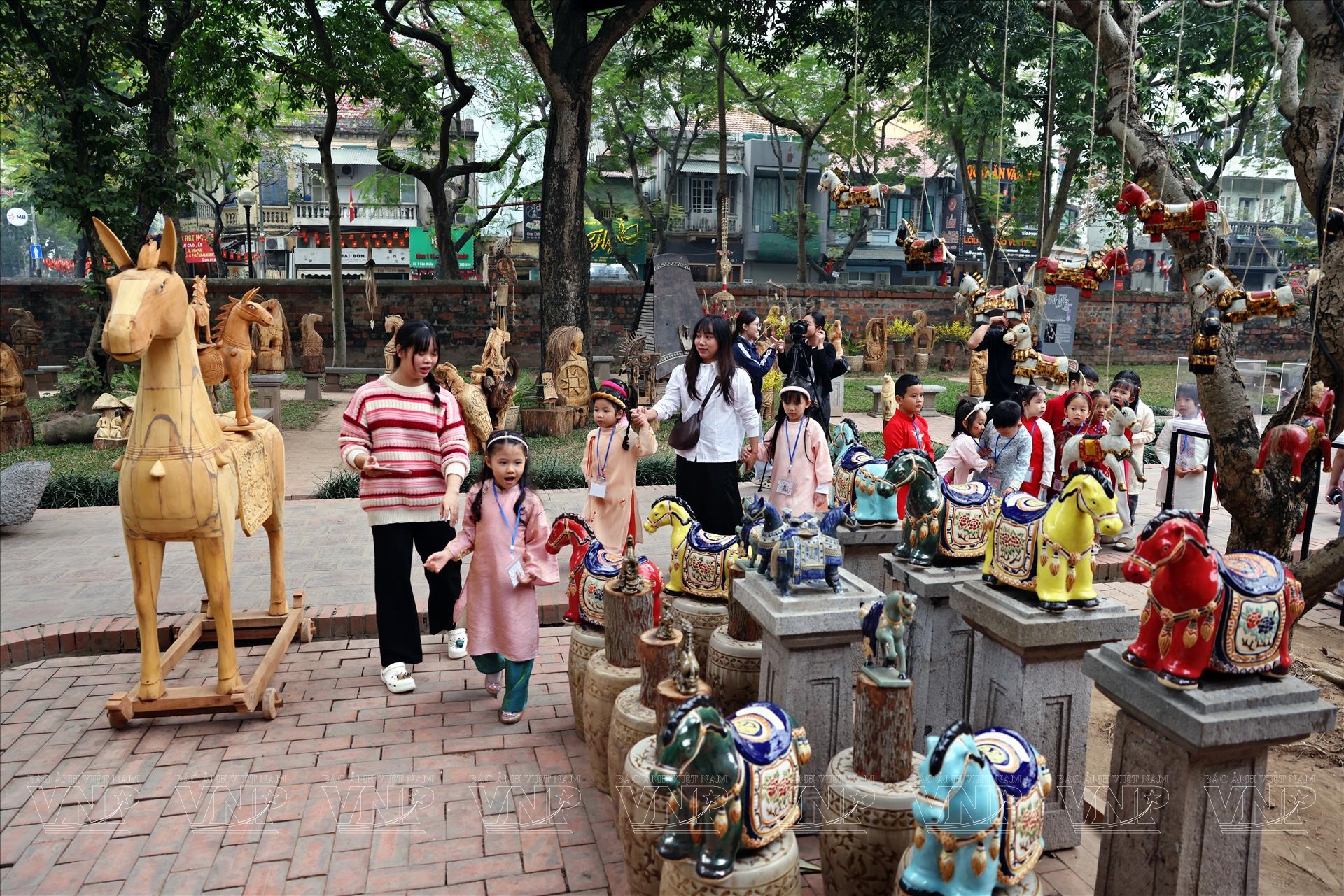 Toàn cảnh không gian triển lãm “Ngựa về phố” tại Văn Miếu – Quốc Tử Giám, nơi nghệ thuật đương đại tiếp tục đối thoại sống động với di sản ngàn năm văn hiến giữa lòng Thủ đô. Ảnh: Công Đạt/Báo ảnh Việt Nam