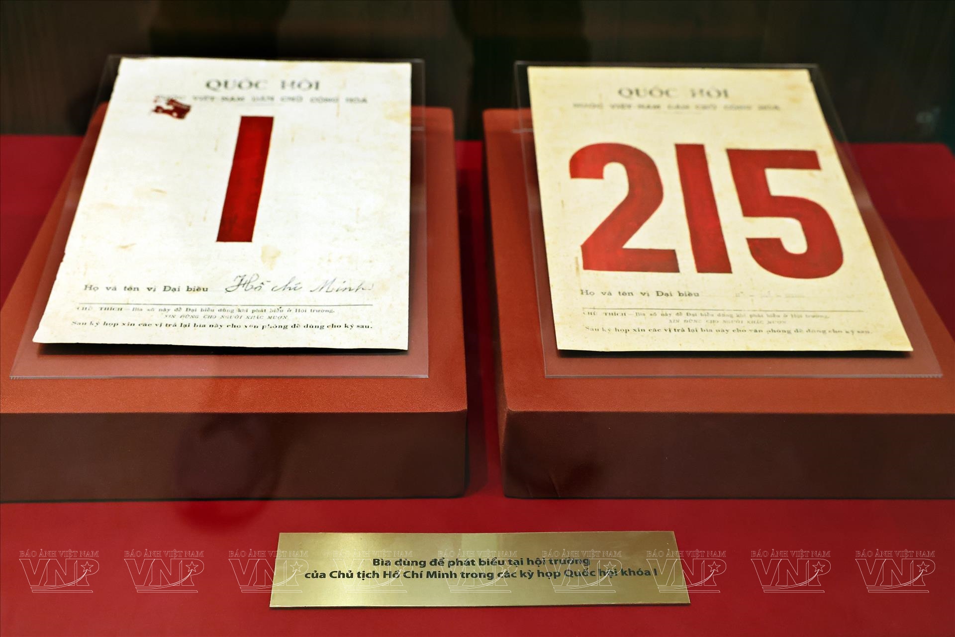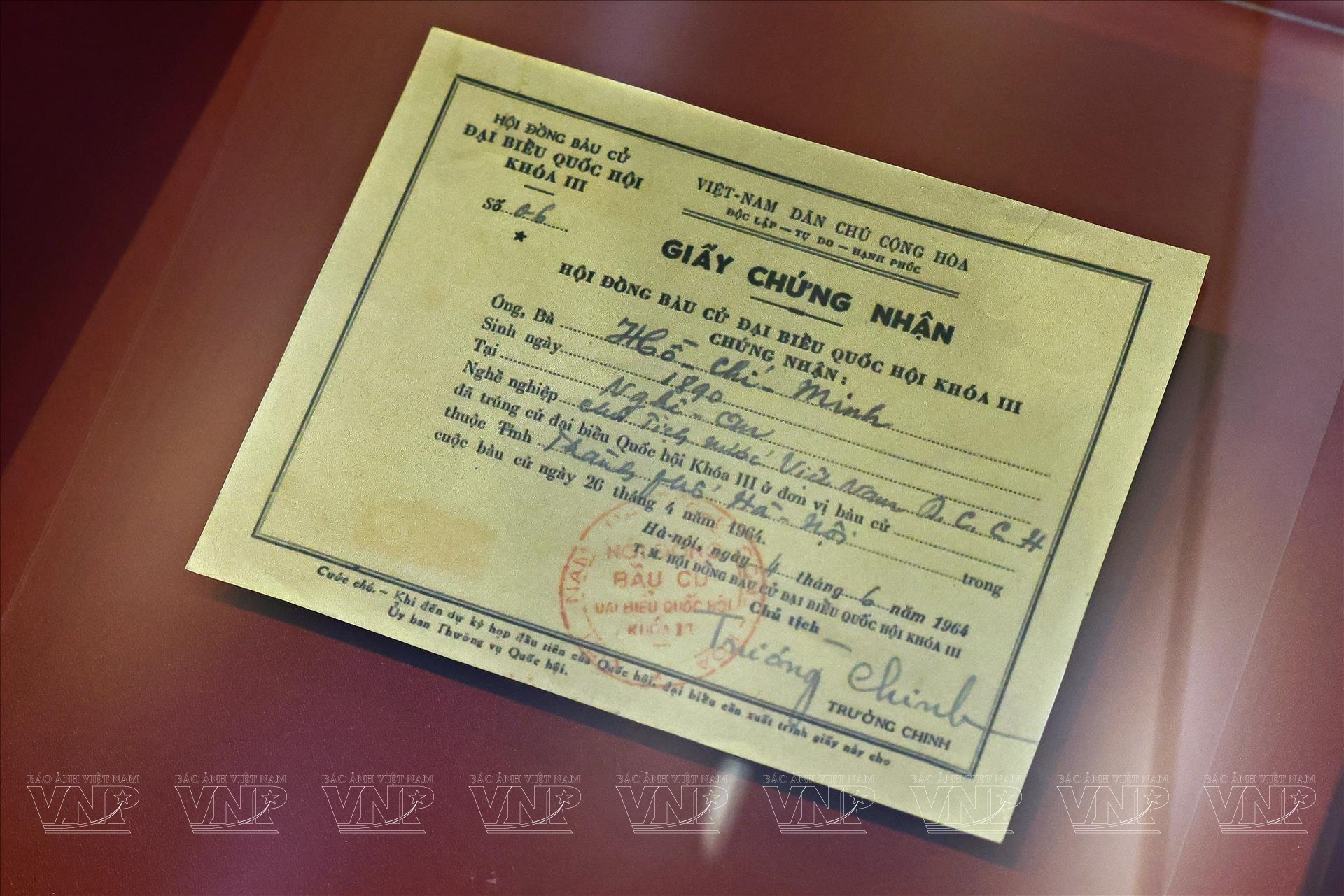 Trong không gian trưng bày, nhiều hiện vật gắn với Chủ tịch Hồ Chí Minh – vị đại biểu Quốc hội đặc biệt của dân tộc – được lưu giữ cẩn trọng. Đó là bìa dùng để phát biểu tại hội trường của Người trong các kỳ họp Quốc hội khóa I, giấy chứng nhận trúng cử đại biểu Quốc hội khóa III năm 1964, cùng nhiều văn bản có bút tích của Người trong giai đoạn 1958–1964. Những tư liệu này không chỉ mang giá trị lịch sử mà còn phản ánh sự quan tâm sâu sắc của Chủ tịch Hồ Chí Minh đối với hoạt động của Quốc hội và việc phát huy quyền làm chủ của nhân dân.