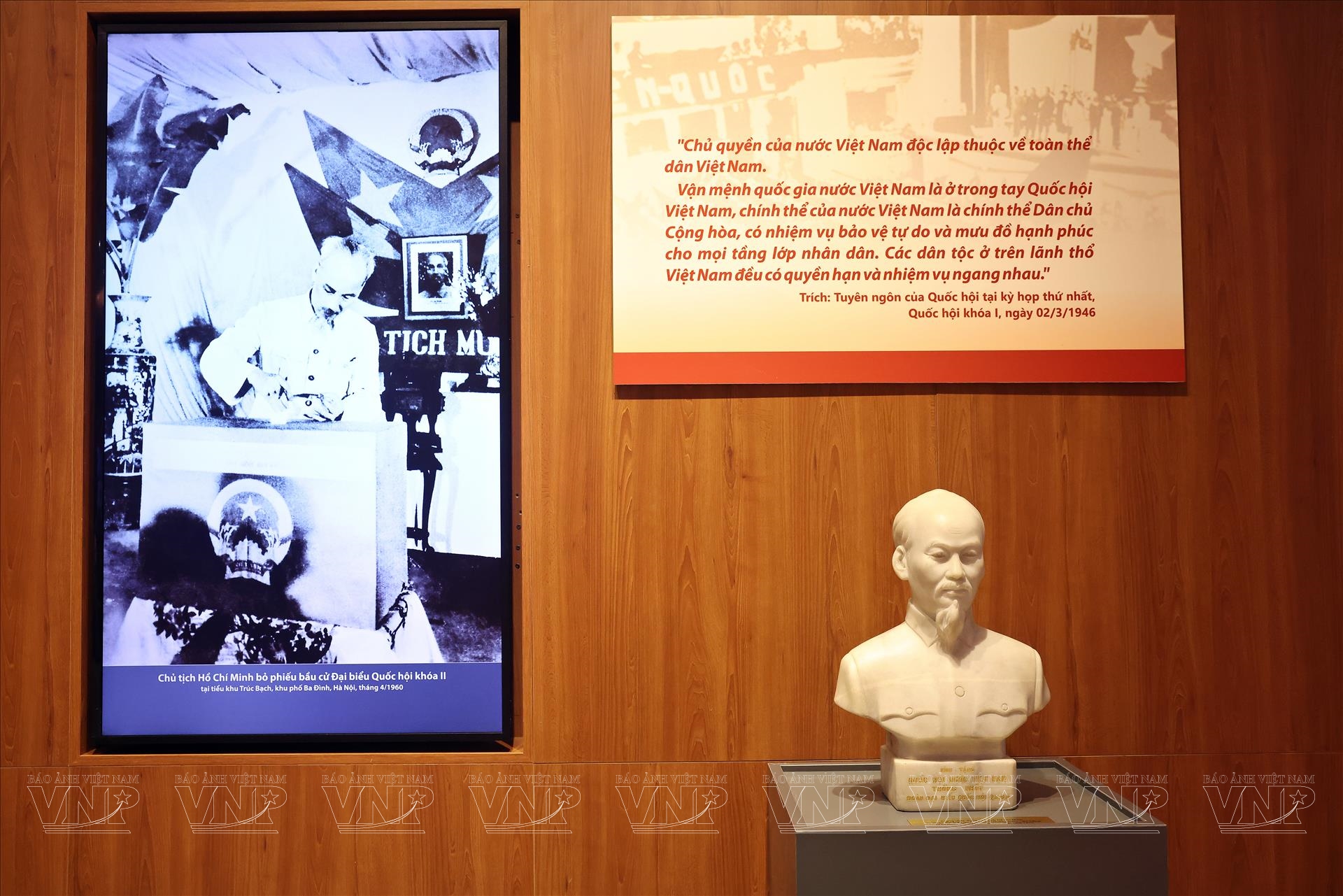Một trong những dấu mốc quan trọng nhất của nền dân chủ Việt Nam là cuộc Tổng tuyển cử đầu tiên bầu Quốc hội khóa I vào tháng 1/1946. Sắc lệnh của Chủ tịch Chính phủ lâm thời nước Việt Nam Dân chủ Cộng hòa về việc tổ chức tổng tuyển cử được trưng bày trang trọng như một minh chứng lịch sử về quyết tâm xây dựng nhà nước của dân, do dân và vì dân. Những hòm phiếu bầu cử và hình ảnh cử tri đi bỏ phiếu năm 1946 giúp người xem hình dung rõ hơn không khí sôi nổi của ngày hội toàn dân, khi lần đầu tiên trong lịch sử, người dân Việt Nam trực tiếp lựa chọn đại biểu đại diện cho mình trong cơ quan quyền lực nhà nước cao nhất.