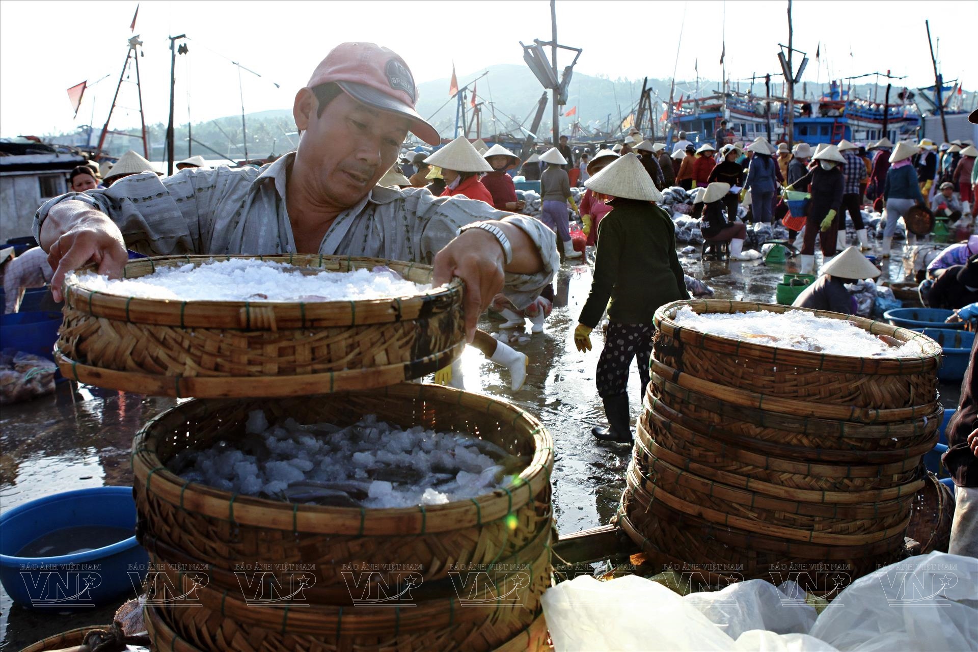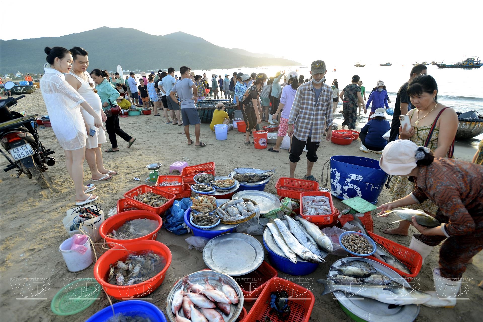 Hải sản ở chợ sáng luôn tươi rói, đa dạng, trở thành nguồn cung quan trọng cho gia đình, nhà hàng và cả những chuyến hàng đi xa. Âm thanh của sóng biển, tiếng máy thuyền và lời gọi nhau mua bán hòa quyện, tạo nên nhịp điệu đặc trưng. Trong dòng người tấp nập là hình ảnh quen thuộc: phụ nữ đội nón lá thoăn thoắt lựa cá, ngư dân tất bật phân loại hải sản, trẻ nhỏ theo chân cha mẹ háo hức quan sát.