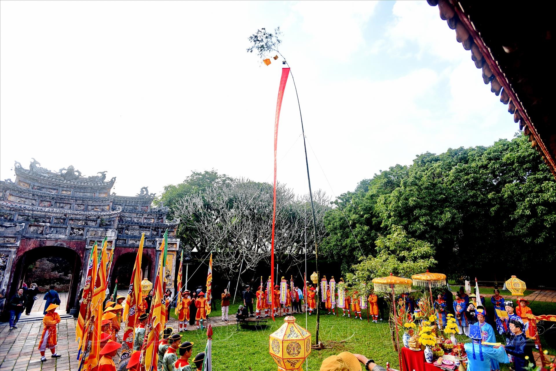 Áng chừng đến giờ tốt, chiêng trống nổi lên, đoàn rước cây nêu tiến vô Đại Nội, khí thế rất trang nghiêm, hùng dũng. Đoàn đi mãi một lúc lâu thì vô tới Thế Miếu, nơi thờ các vị vua nhà Nguyễn. Nơi bãi cỏ trước sân Thế Miếu một hương án đã bày sẵn, khói hương nghi ngút. Bên hương án, các vị chức sắc mình vận áo lễ kính cẩn dân hương. Lễ xong thì đến giờ thướng tiêu. Cả chục người hò reo, kẻ đẩy người kéo một lúc sau thì dựng được cây nêu đứng thẳng giữa sân. Khi ngọn nêu cất cao tung bay trong gió ai nấy đều hân hoan phấn khởi. Vậy là Tết đã chính thức về nơi cung cấm.