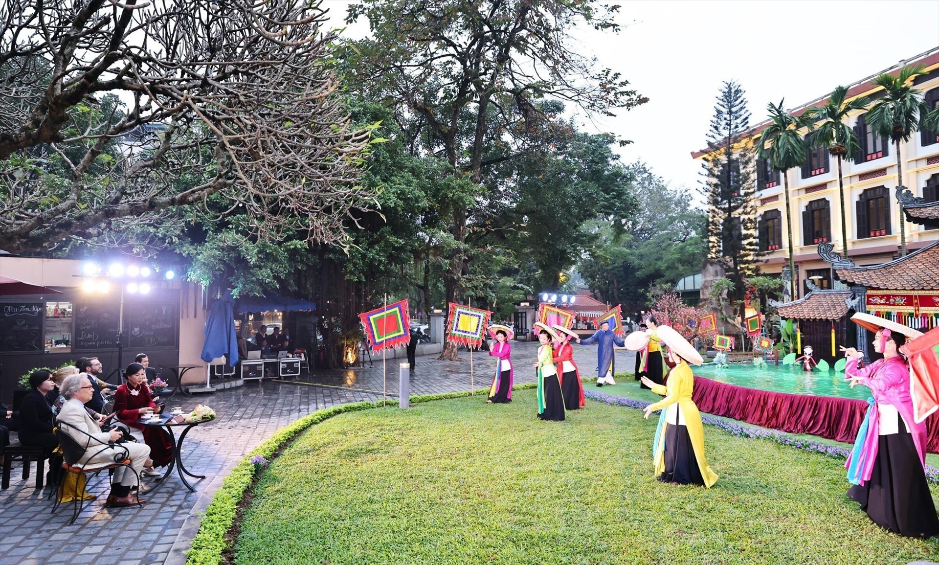 Phu nhân Ngô Phương Ly và ngài Charles Henry Gordon-Lennox, Công tước xứ Richmond cùng Phu nhân thưởng trà và xem các tiết mục đặc sắc tại sân trước Bảo tàng Mỹ thuật Việt Nam. Ảnh: Minh Đức – TTXVN