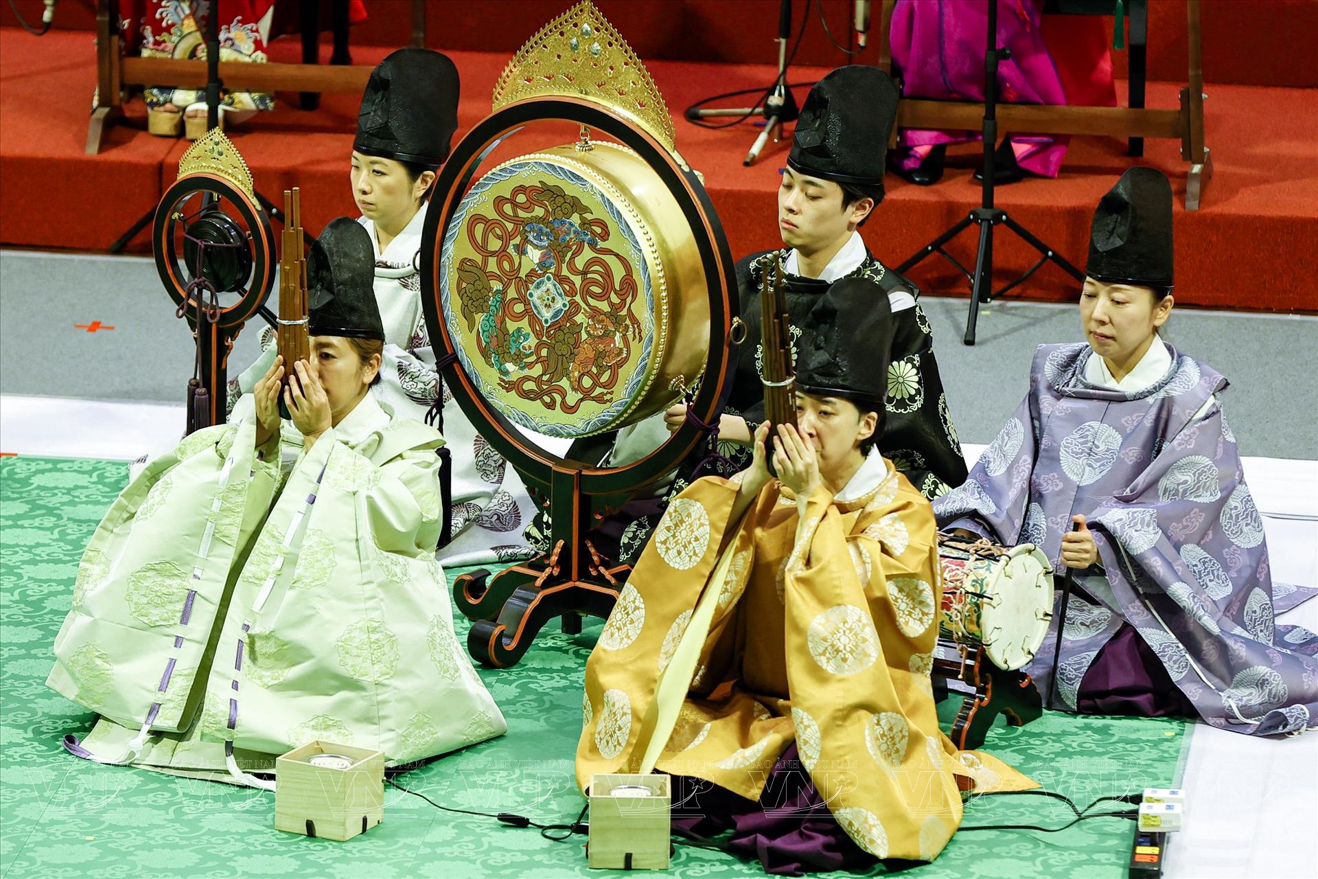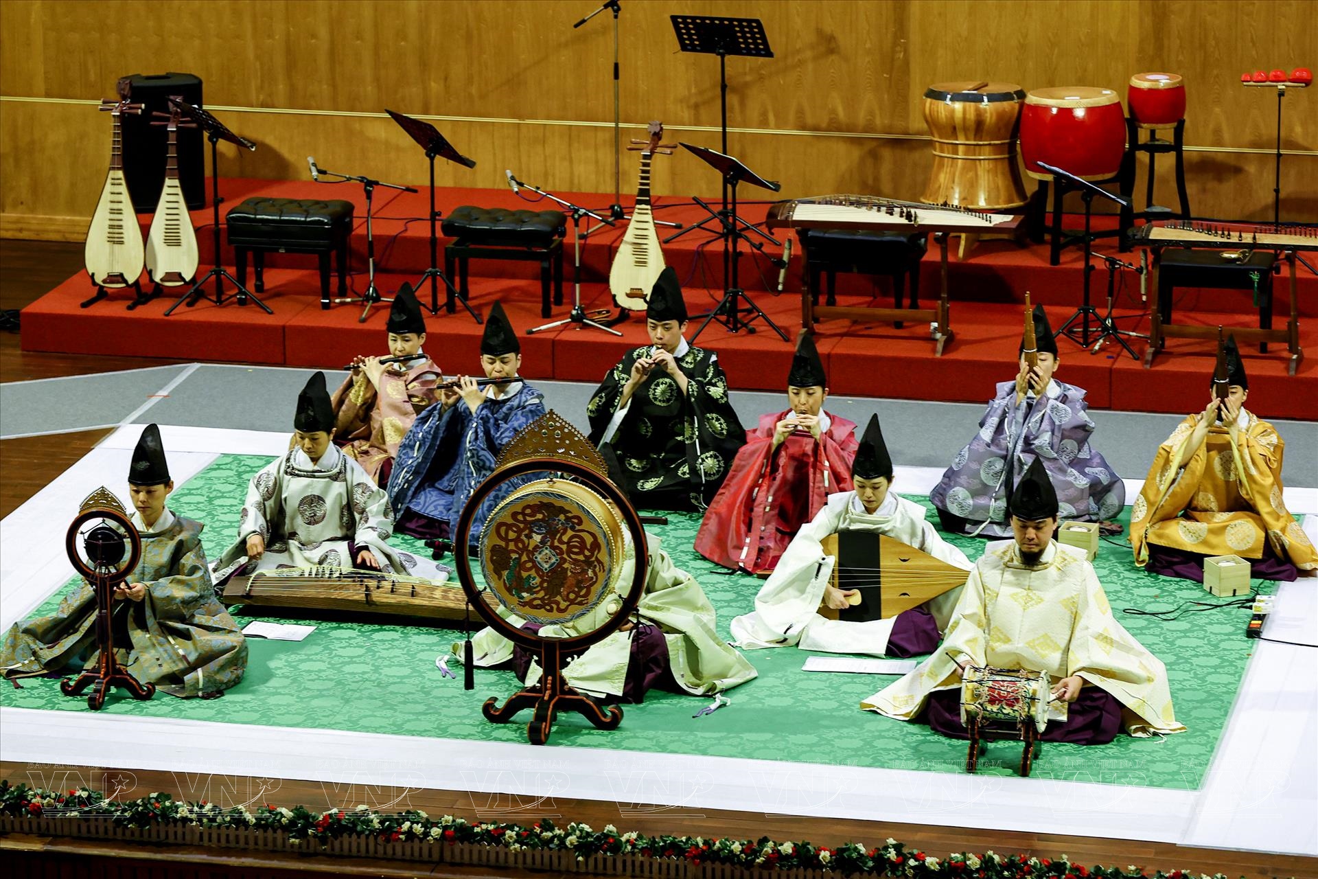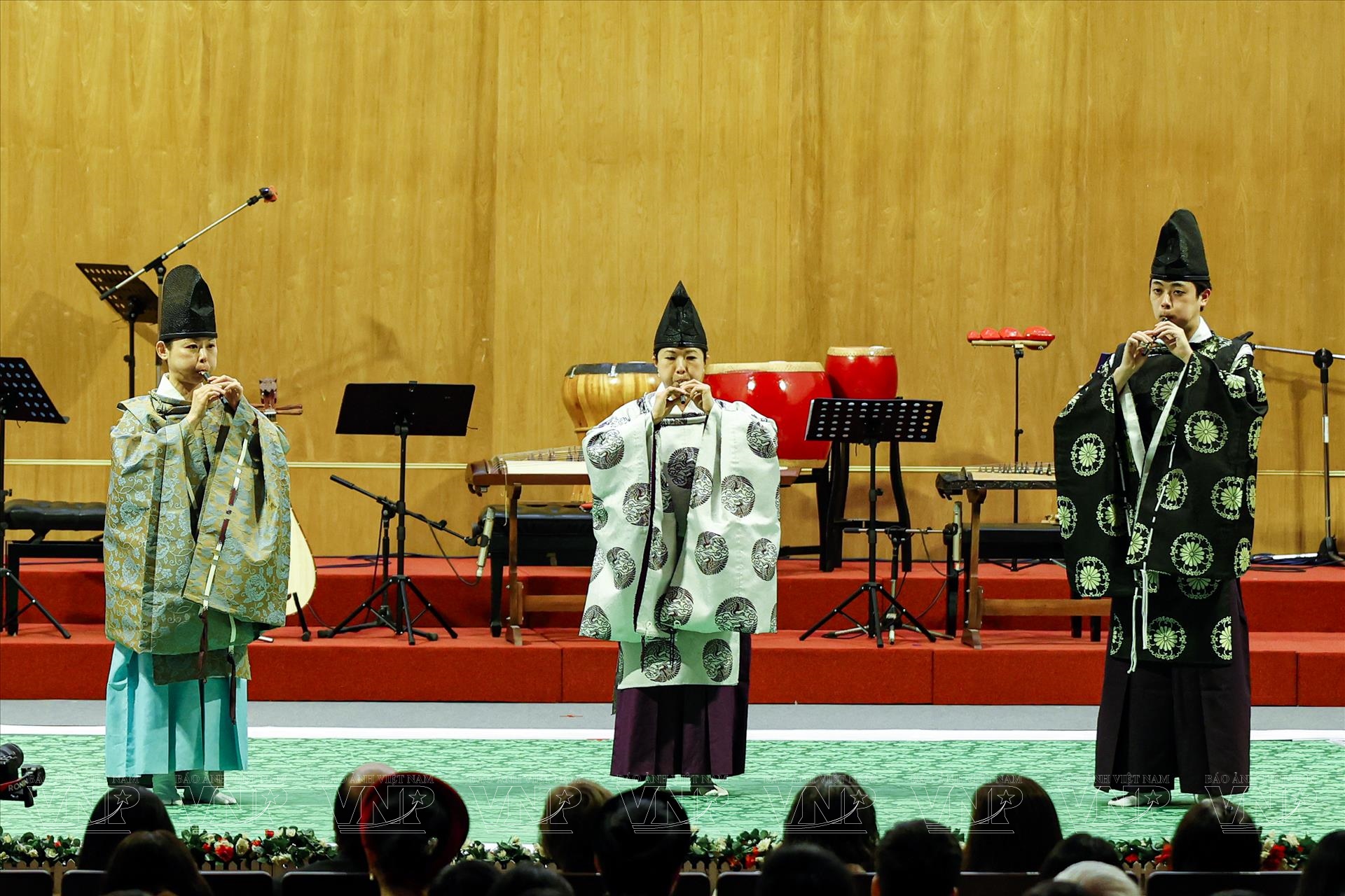Trong đêm diễn, khán giả đã được thưởng thức những tác phẩm tiêu biểu như “Ichikotsucho netori”, “Konju”, “Karyobin” của Gagaku; cùng “Thập thủ liên hoàn (Mười bản Ngự)”, “Phụng Vũ” của Nhã nhạc. Mỗi tiết mục là một lát cắt lịch sử, phản ánh quan niệm thẩm mỹ và đời sống tinh thần của triều đình xưa. Đặc biệt, phần trình diễn múa Ryoo thuộc thể loại Bugaku đã tạo điểm nhấn ấn tượng. Trong trang phục rực rỡ, động tác chậm rãi nhưng dứt khoát, các nghệ sĩ tái hiện không khí cung đình Nhật Bản cổ kính, khiến khán giả như được bước vào một không gian nghệ thuật vượt thời gian.