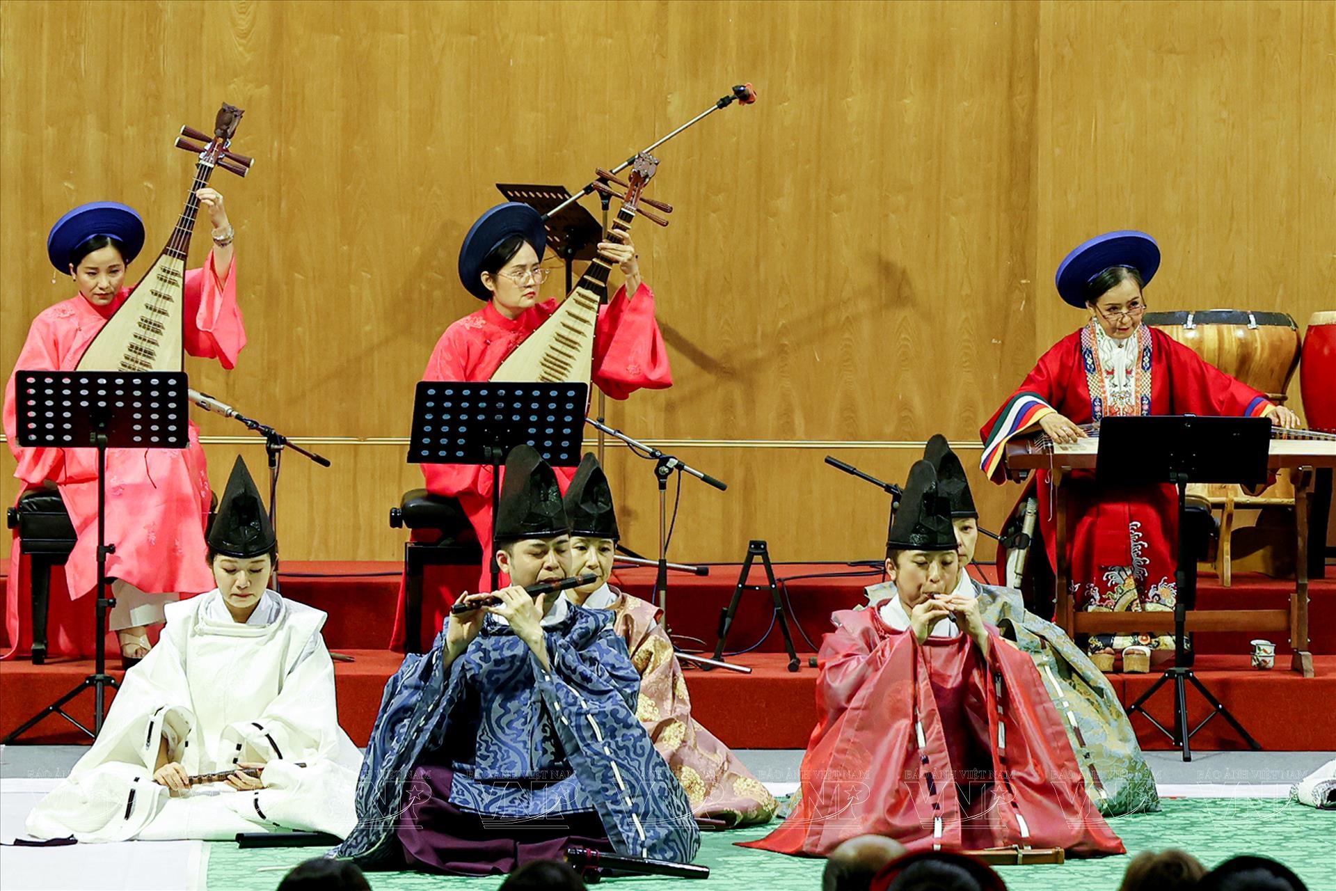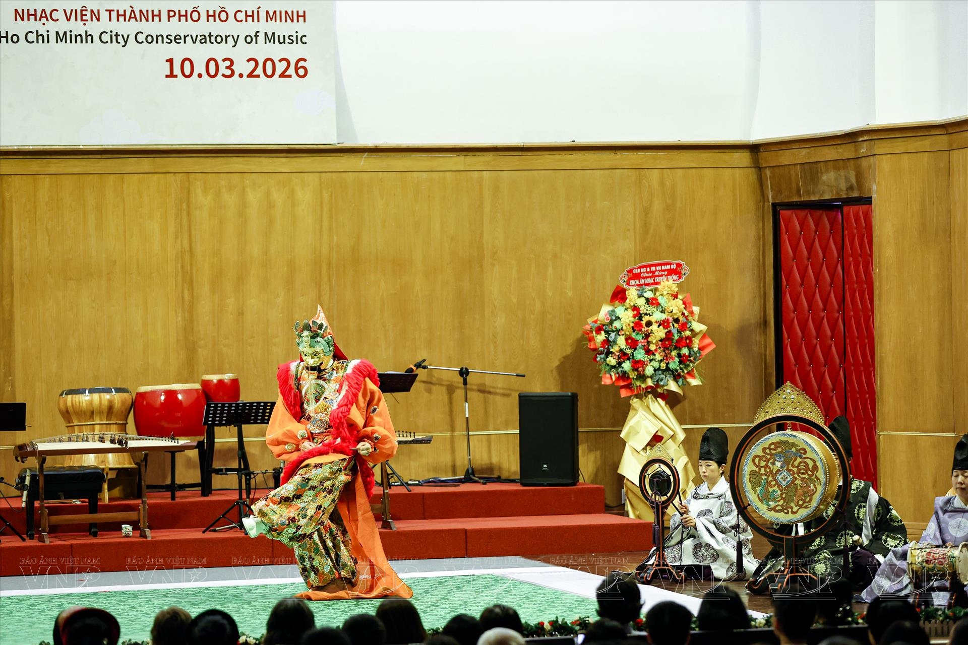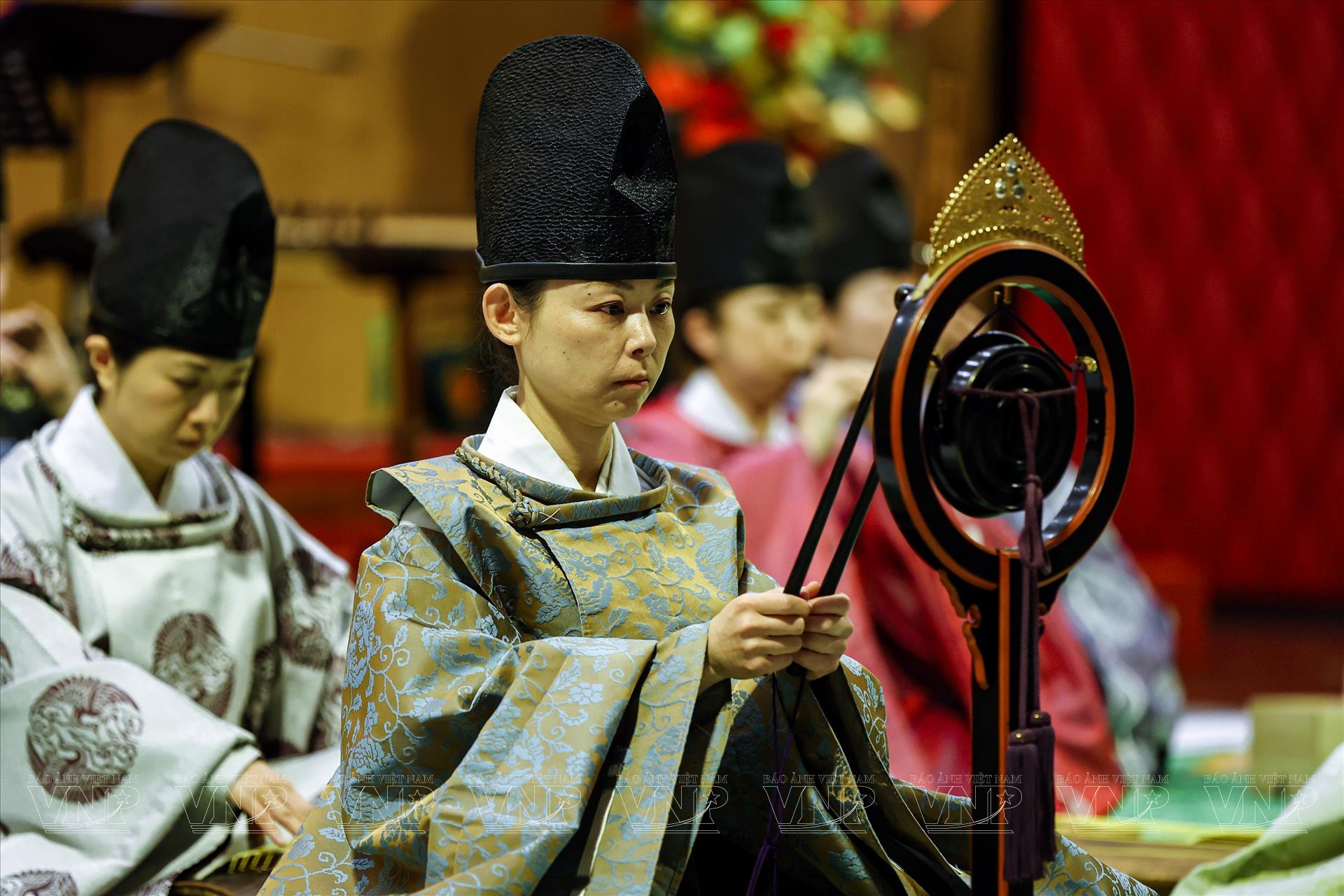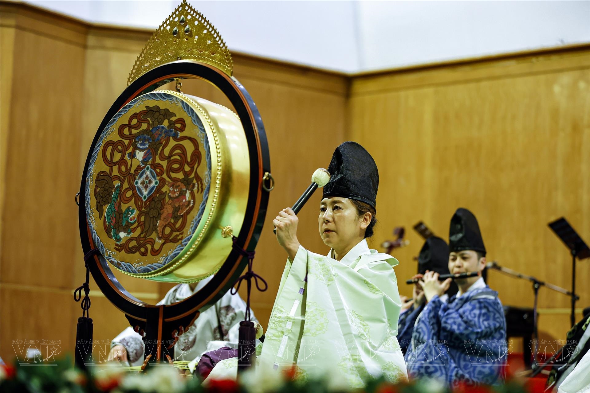 Trong đêm diễn, khán giả đã được thưởng thức những tác phẩm tiêu biểu như “Ichikotsucho netori”, “Konju”, “Karyobin” của Gagaku; cùng “Thập thủ liên hoàn (Mười bản Ngự)”, “Phụng Vũ” của Nhã nhạc. Mỗi tiết mục là một lát cắt lịch sử, phản ánh quan niệm thẩm mỹ và đời sống tinh thần của triều đình xưa. Đặc biệt, phần trình diễn múa Ryoo thuộc thể loại Bugaku đã tạo điểm nhấn ấn tượng. Trong trang phục rực rỡ, động tác chậm rãi nhưng dứt khoát, các nghệ sĩ tái hiện không khí cung đình Nhật Bản cổ kính, khiến khán giả như được bước vào một không gian nghệ thuật vượt thời gian.