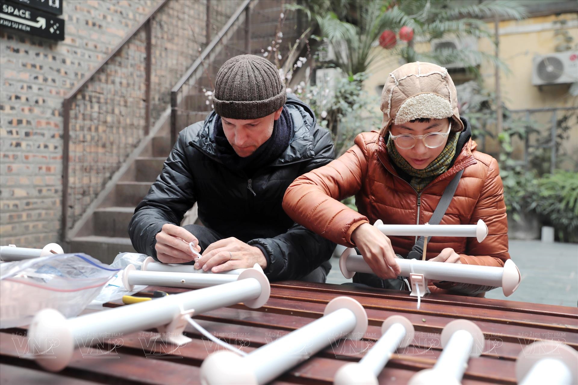 Đôi bạn đã tự thiết kế ra dụng cụ sáo diều, là chiếc sáo có nhiều lỗ rồi gắn trên một trục đỡ bằng nhựa hoặc gỗ có thể xoay tròn. Dưới tác động của gió sẽ tạo ra lực làm sáo diều quay. Khi sáo diều quay sẽ phát ra những âm thanh đặc biệt. Từ đó công chúng có thể trải nghiệm nghe và chơi sáo diều trực tiếp.