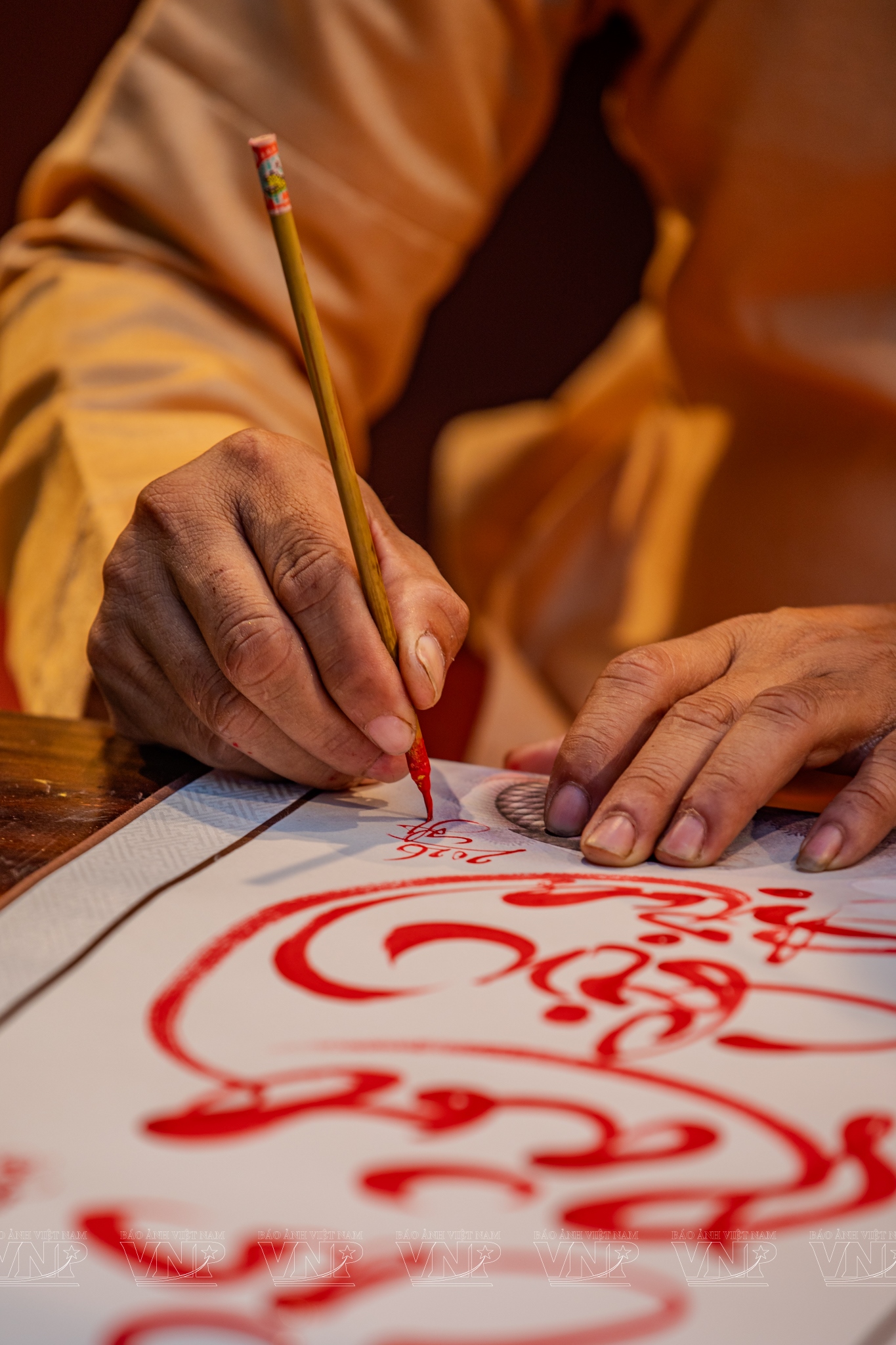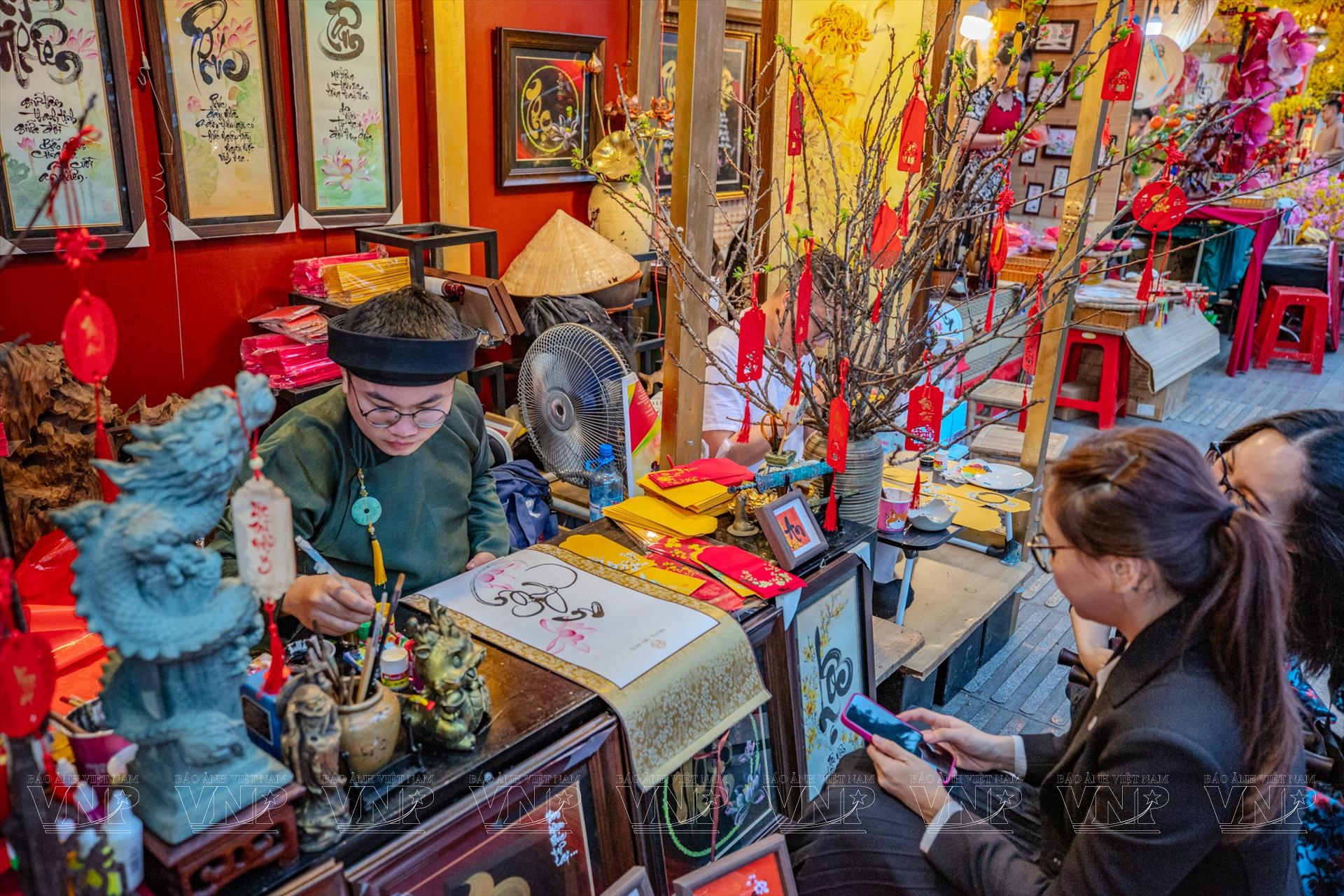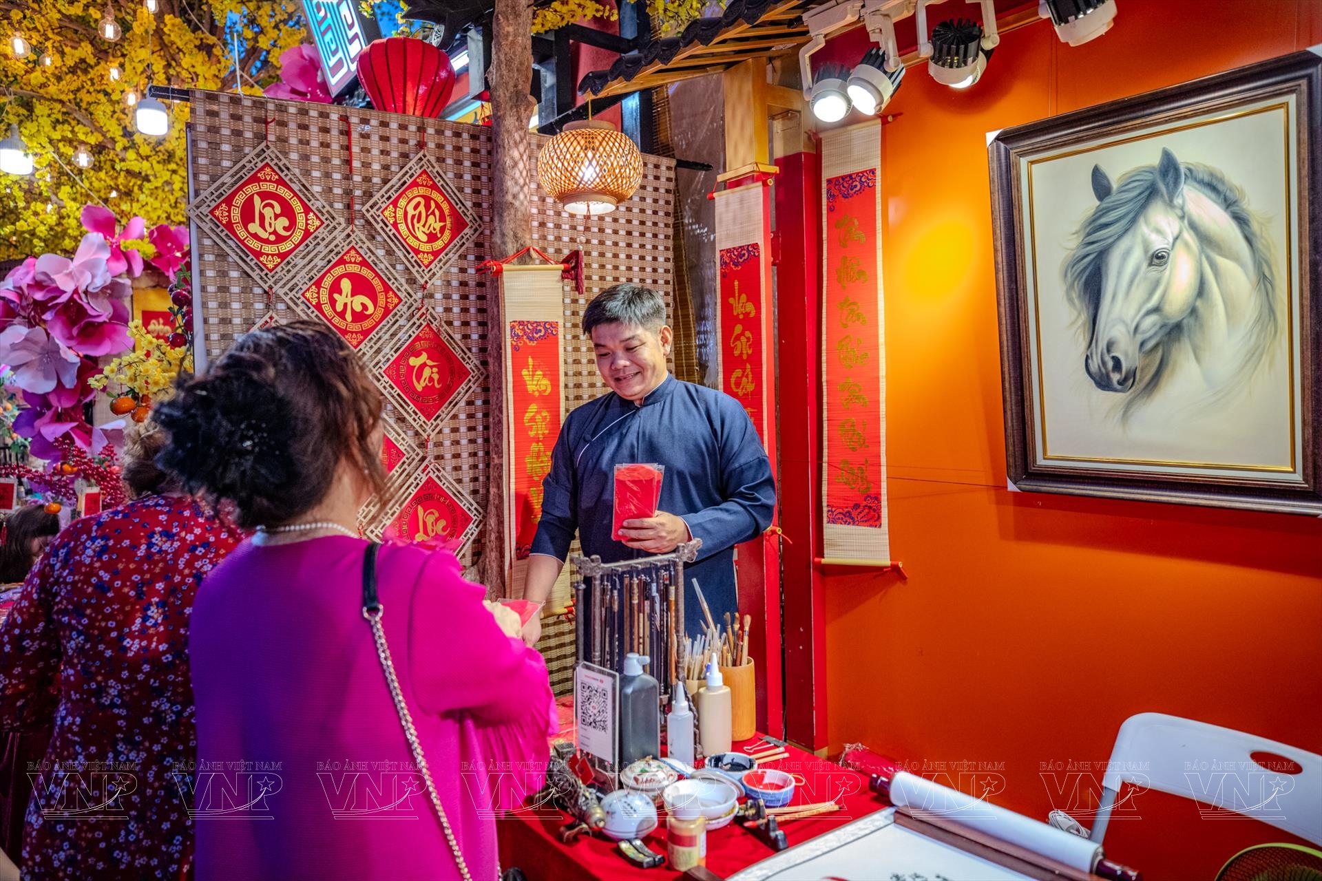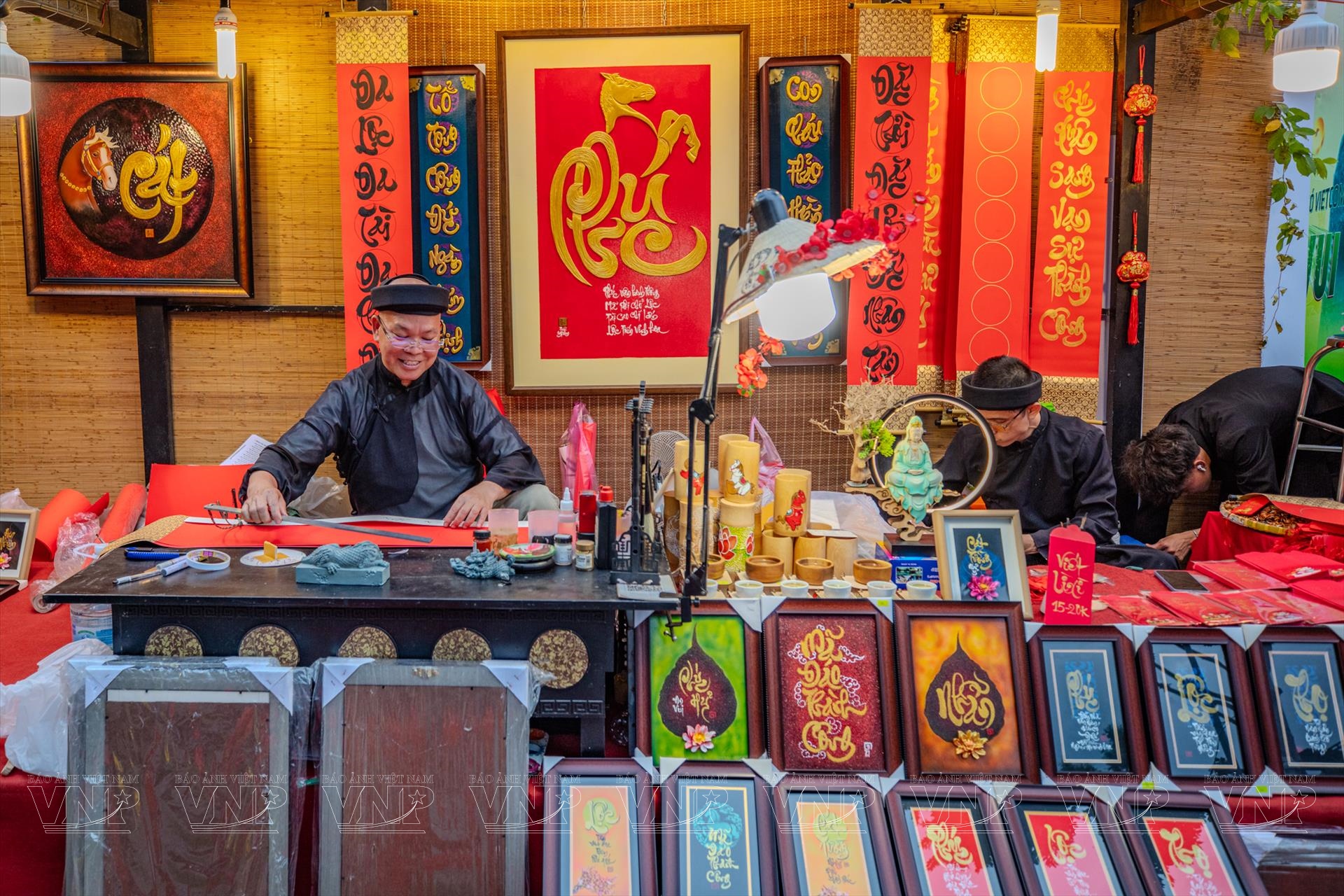 Làm nên linh hồn của Lễ hội Tết Việt không thể không nhắc đến phố ông đồ. Trong không gian được phục dựng với mái lá, chiếu cói và những gian nhà chòi mộc mạc, hình ảnh các ông đồ – từ những bậc cao niên đến các bạn trẻ thế hệ Gen Z – cùng nhau mài mực, múa bút đã tạo nên bức tranh giao thoa văn hóa sinh động. Không còn bó hẹp trong những khuôn mẫu cũ, nghệ thuật thư pháp tại lễ hội năm nay cho thấy sự uyển chuyển và khả năng thích ứng mạnh mẽ, từ những bức đại tự Hán Nôm mực thước đến thư pháp chữ Quốc ngữ bay bổng, tranh thủy mặc hay nghệ thuật tranh bút lửa trên tre trúc của nghệ nhân Dương Thanh Phận.