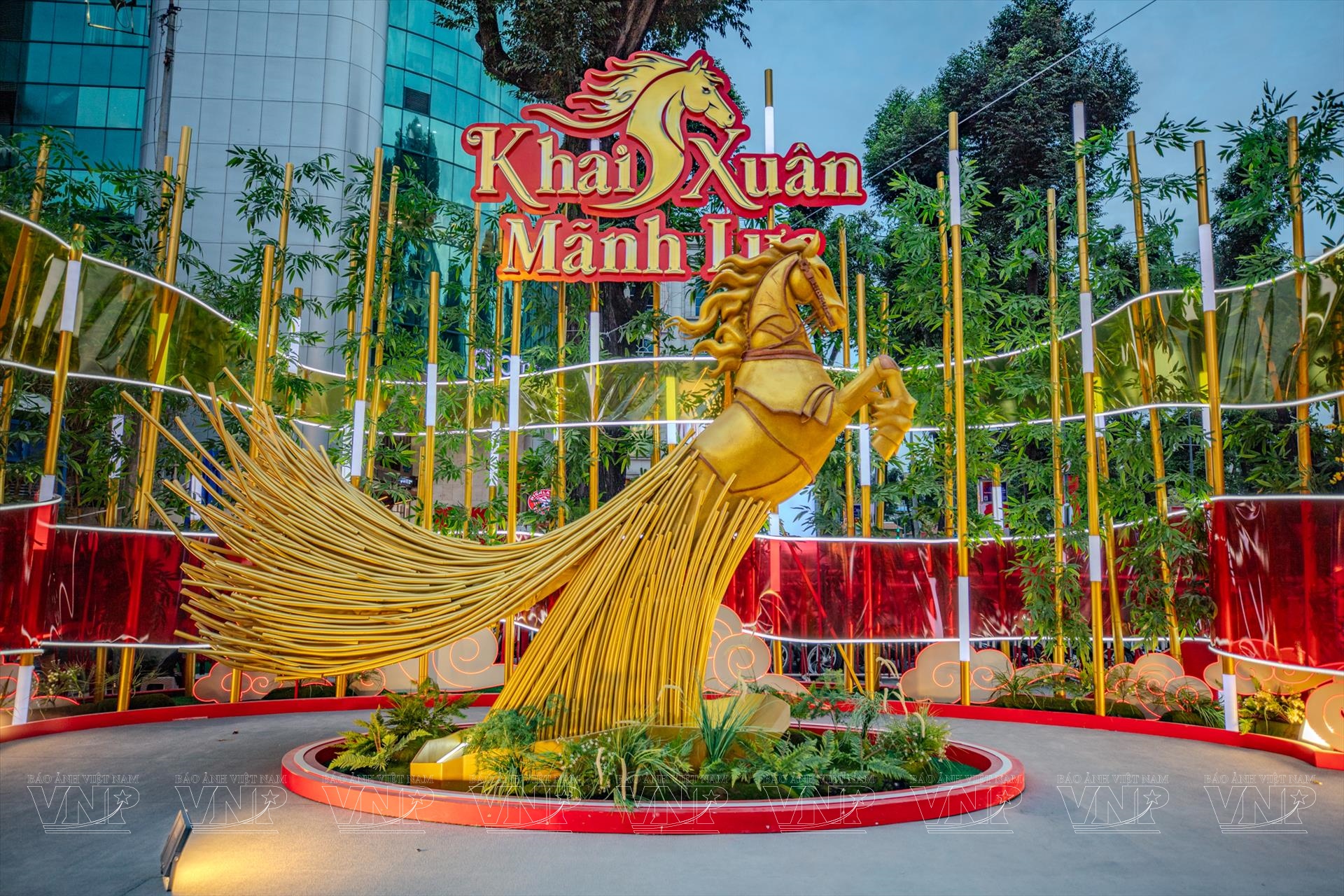 Điểm nhấn thị giác nổi bật của lễ hội là cụm linh vật “Khai xuân mãnh lực”. Hình tượng những chú ngựa vàng oai phong, vươn mình mạnh mẽ tại vị trí trung tâm không chỉ thu hút sự chú ý của người tham quan, mà còn gửi gắm khát vọng về sự bứt phá, tăng tốc và nguồn năng lượng dồi dào của Tp. Hồ Chí Minh trong năm mới Bính Ngọ 2026.