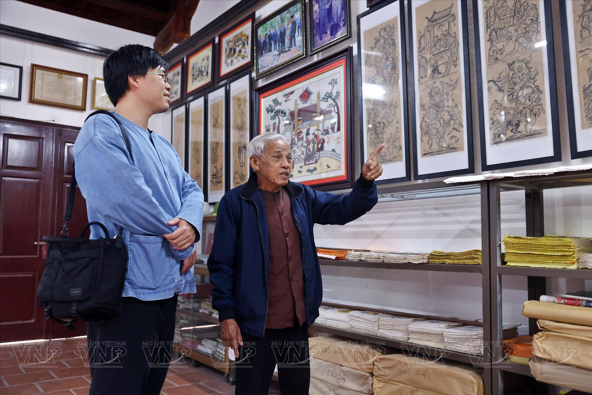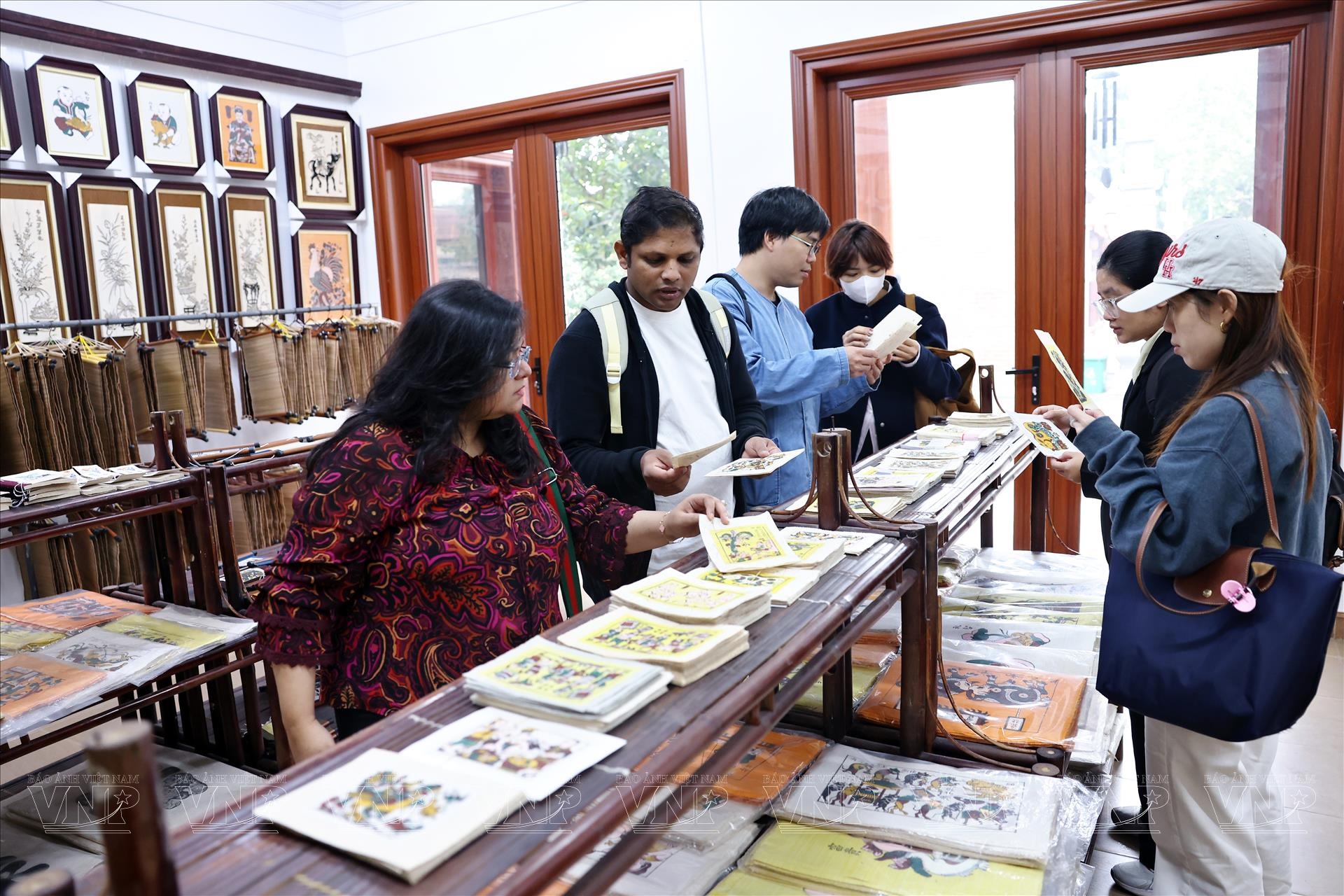Du khách nước ngoài tham quan khu vực trưng bày tranh và các sản phẩm từ tranh Đông Hồ.