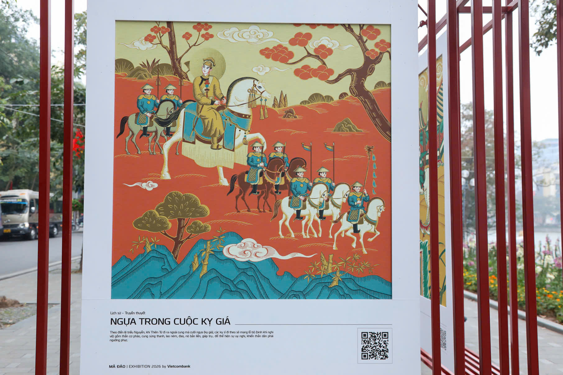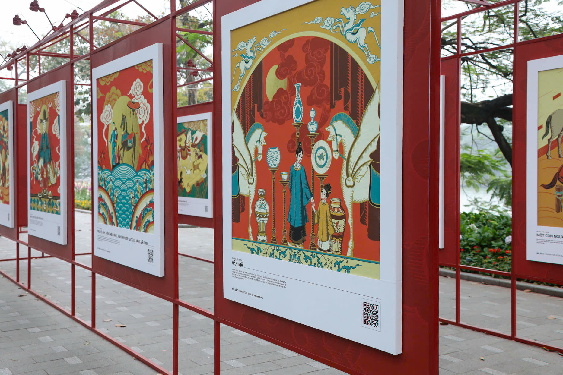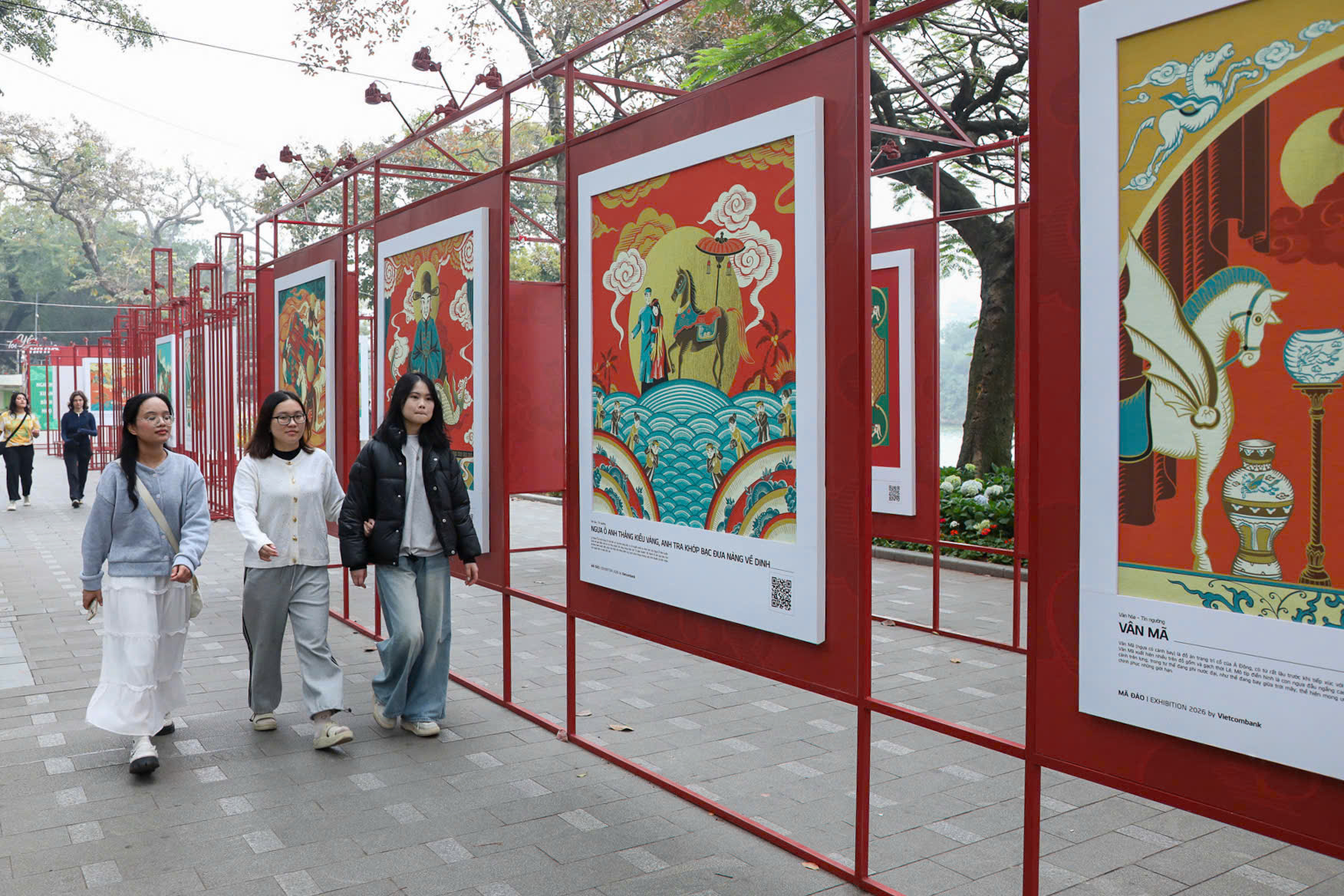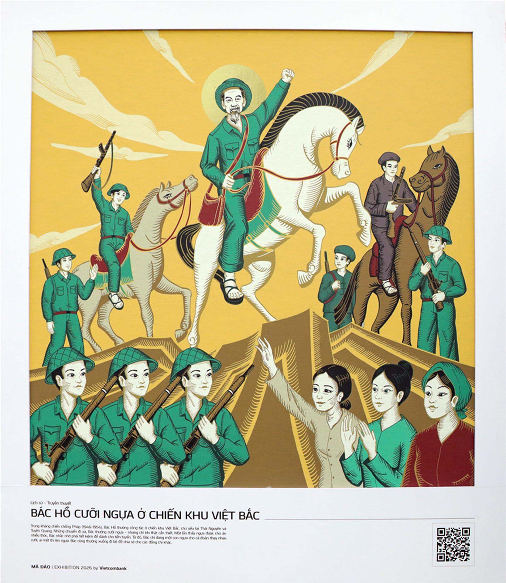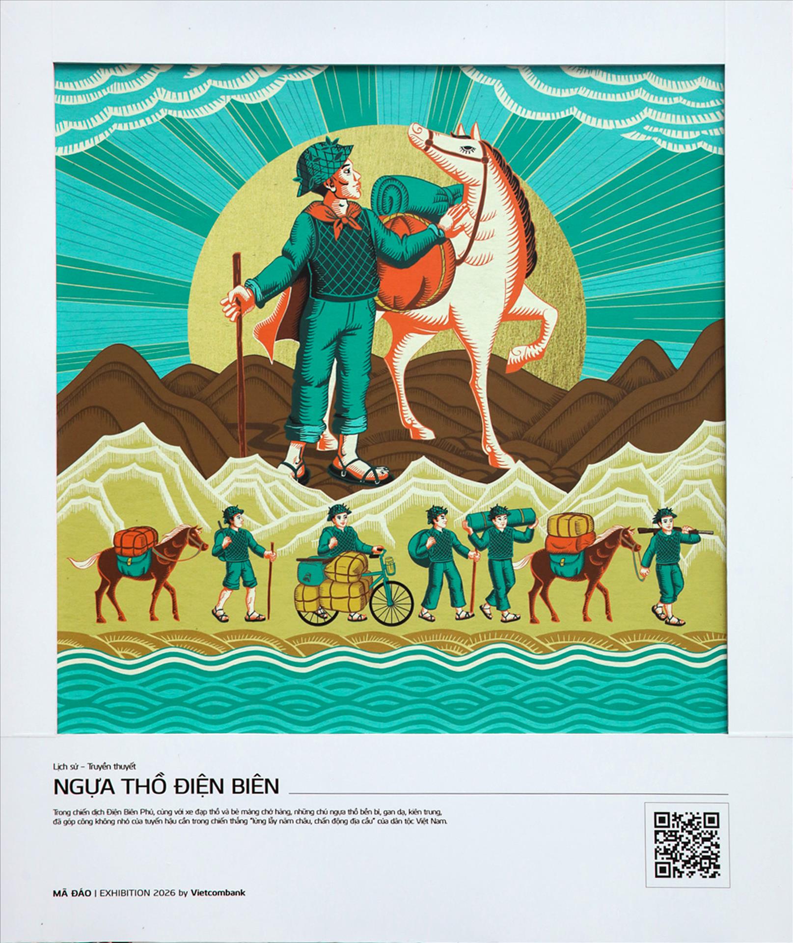 Các triển lãm như "Mã Đáo | Exhibition 2026" tại không gian đi bộ quanh Hồ Gươm là một minh chứng rõ nét. Tại đây, những bức tranh ngựa được thể hiện theo phong cách đồ họa hiện đại, nhưng vẫn giữ nguyên được tinh thần cốt lõi của tranh dân gian Đông Hồ, Hàng Trống. Thông qua bố cục ước lệ, đường viền đậm và các biểu tượng quen thuộc, các tác phẩm này đã khéo léo kết hợp quá khứ và hiện tại, mang đến một hơi thở mới cho nghệ thuật truyền thống.