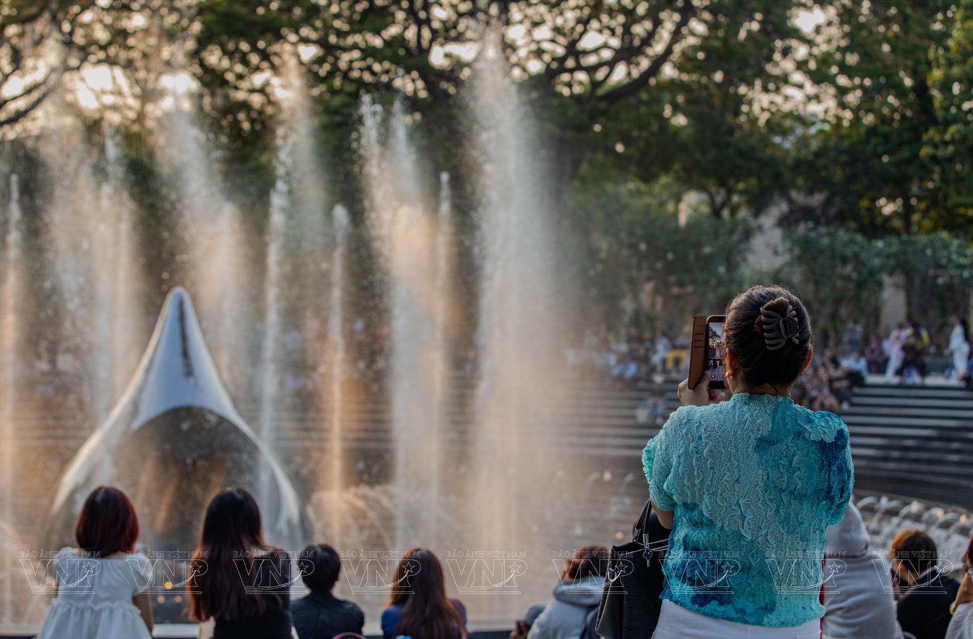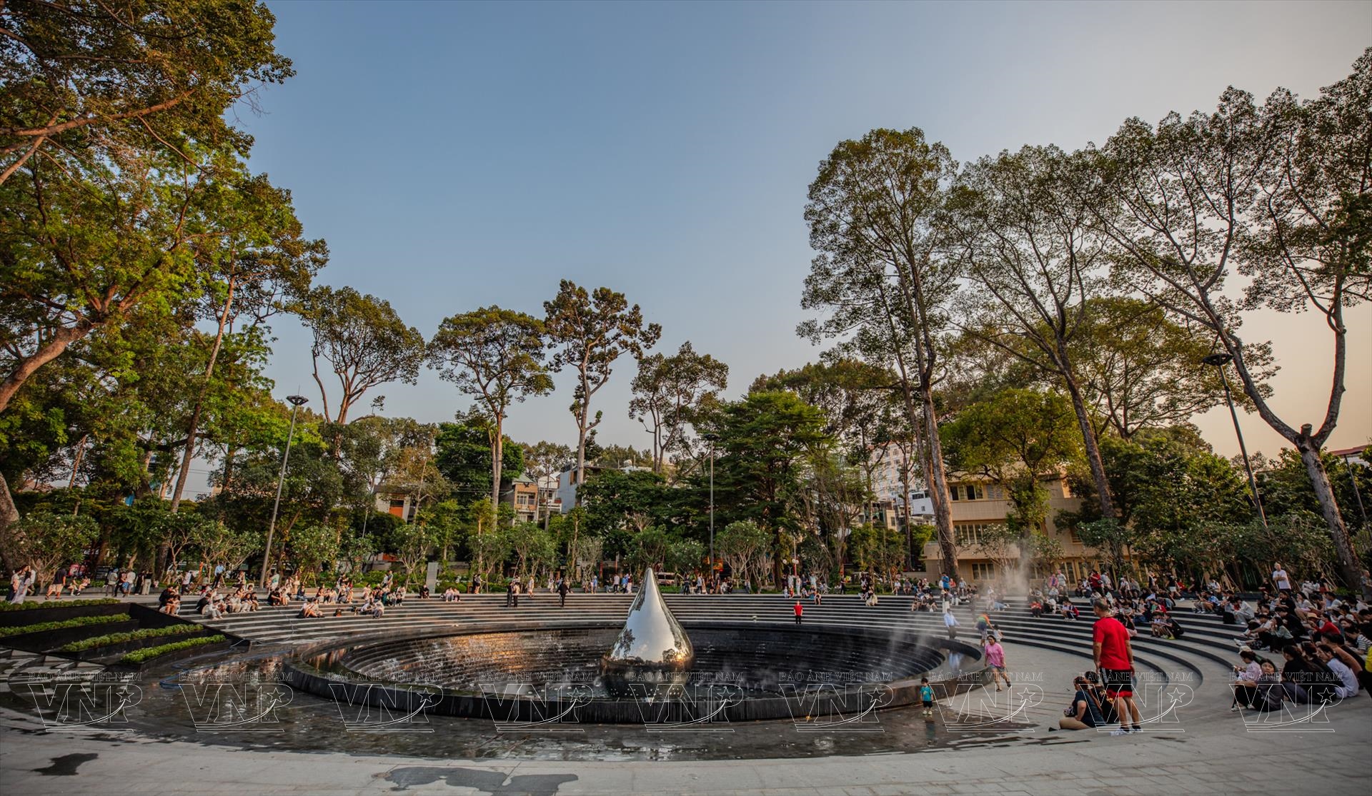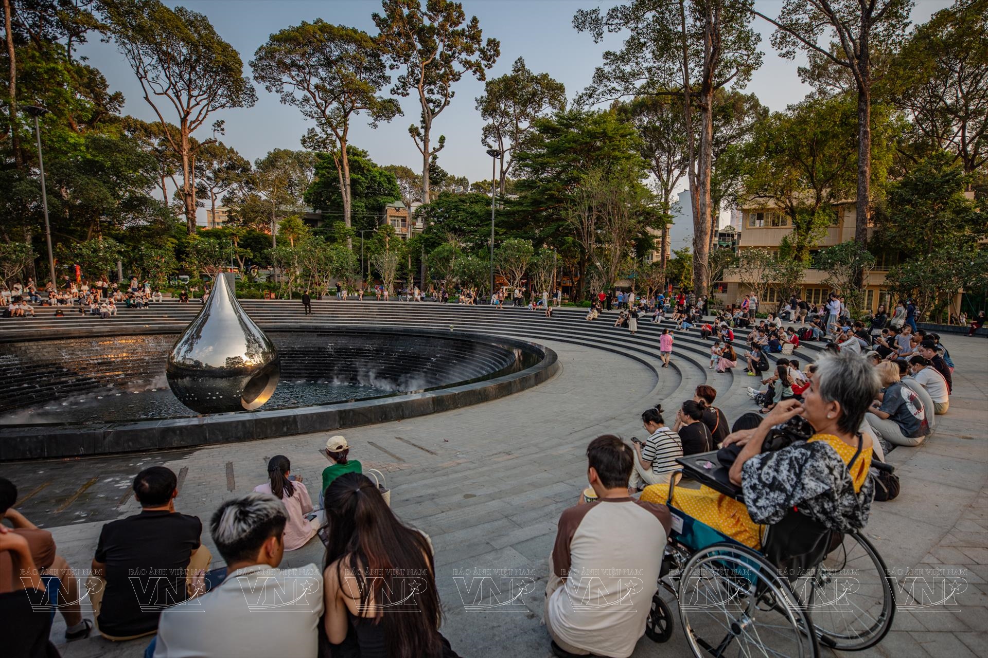 Khi hoàng hôn khép lại, công viên khoác lên mình diện mạo mới. Đài phun nước nghệ thuật vận hành, hòa cùng hàng ngàn điểm sáng dưới chân tượng đài tạo nên không gian lung linh như “rừng ánh nến”. Không khí tưởng niệm vẫn hiện hữu, nhưng được tiếp nối bằng nhịp sống ấm áp của hiện tại. Đông đảo người dân, đặc biệt là giới trẻ, tìm đến đây sinh hoạt, trò chuyện và tận hưởng sự bình yên.